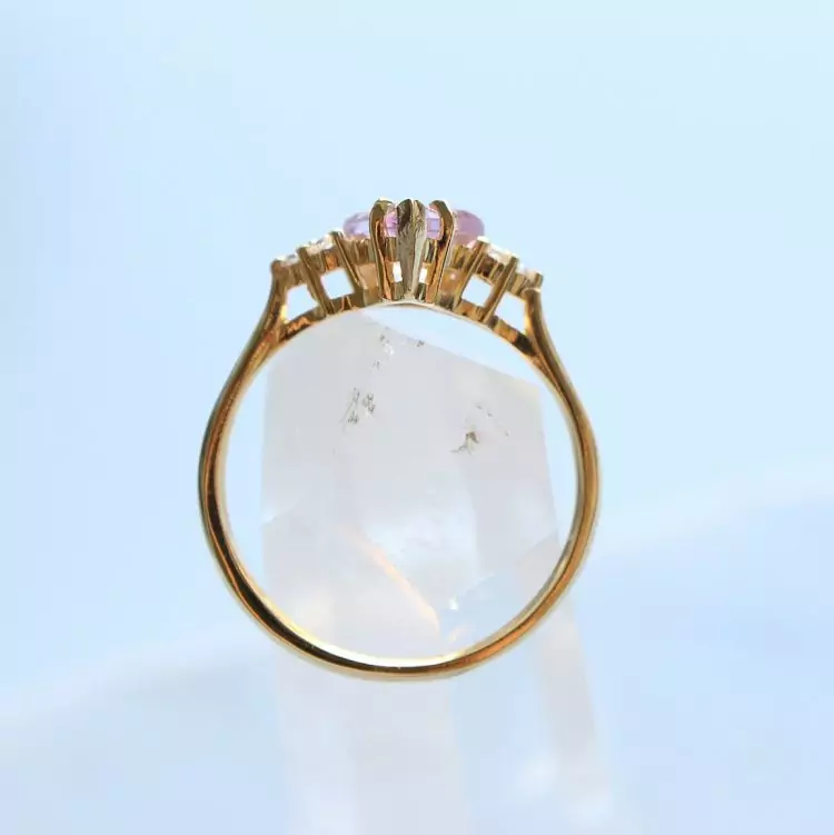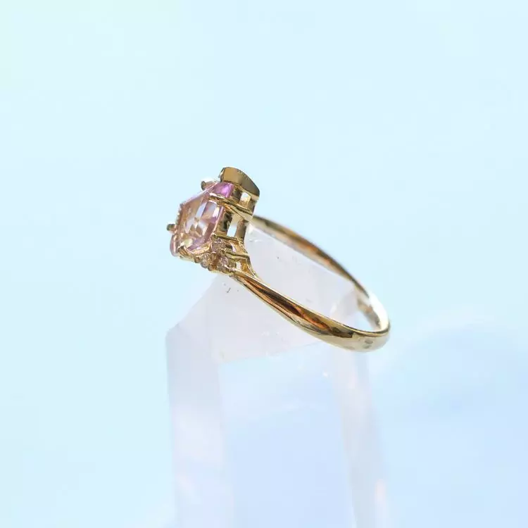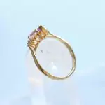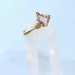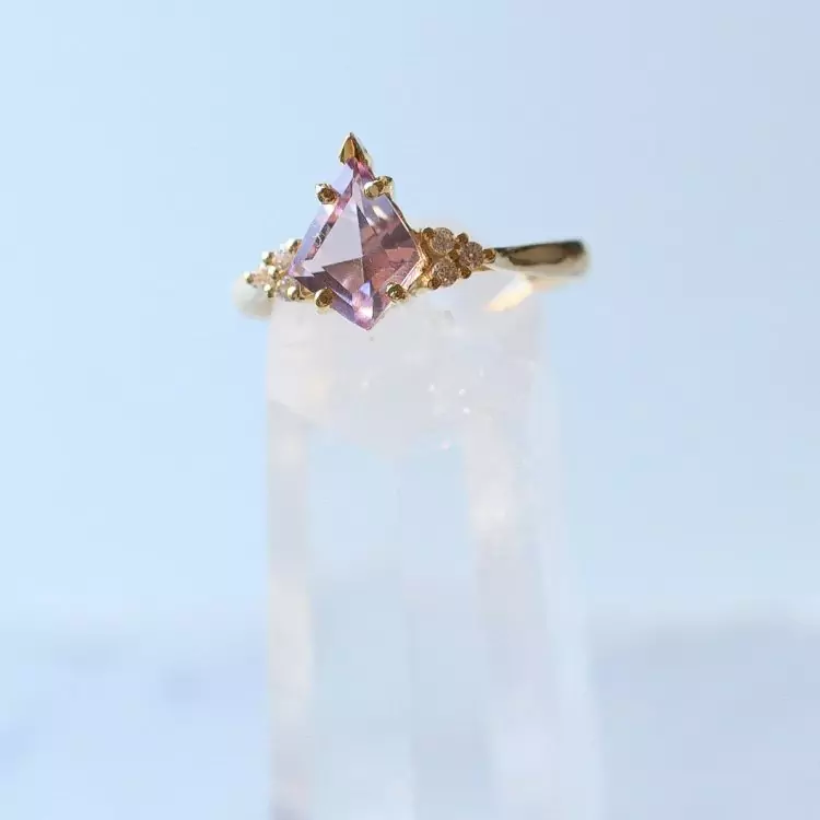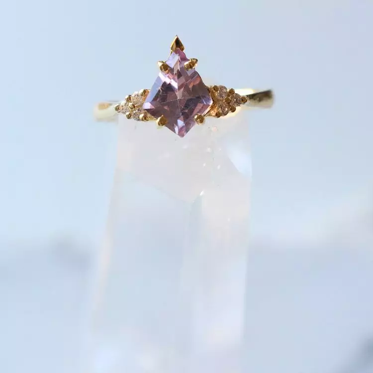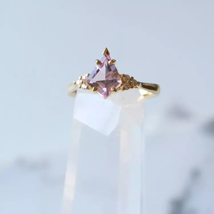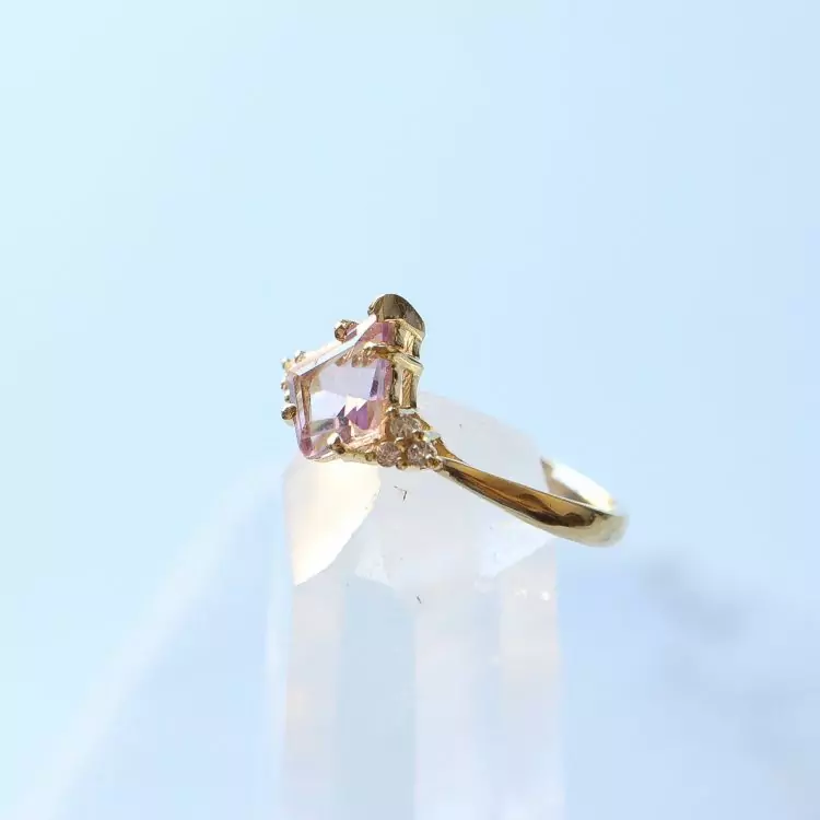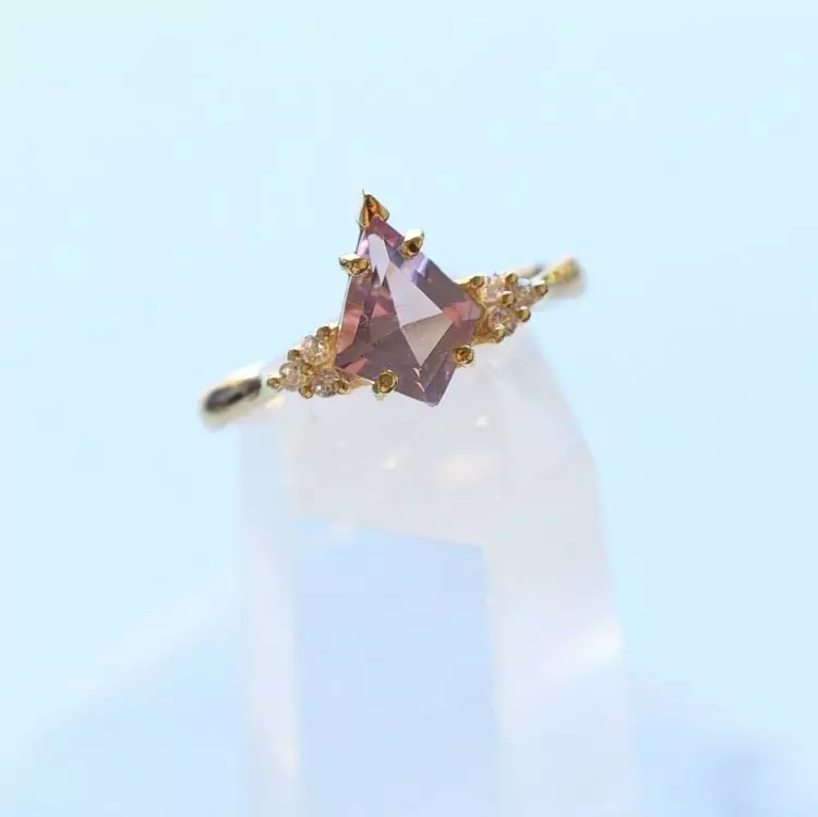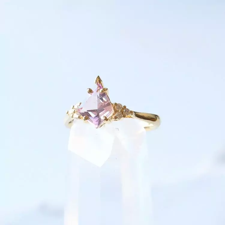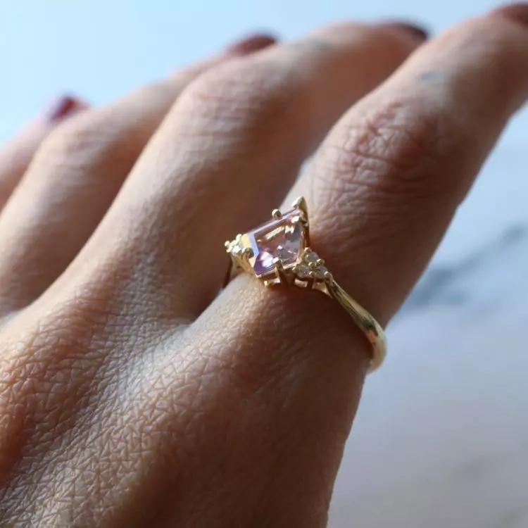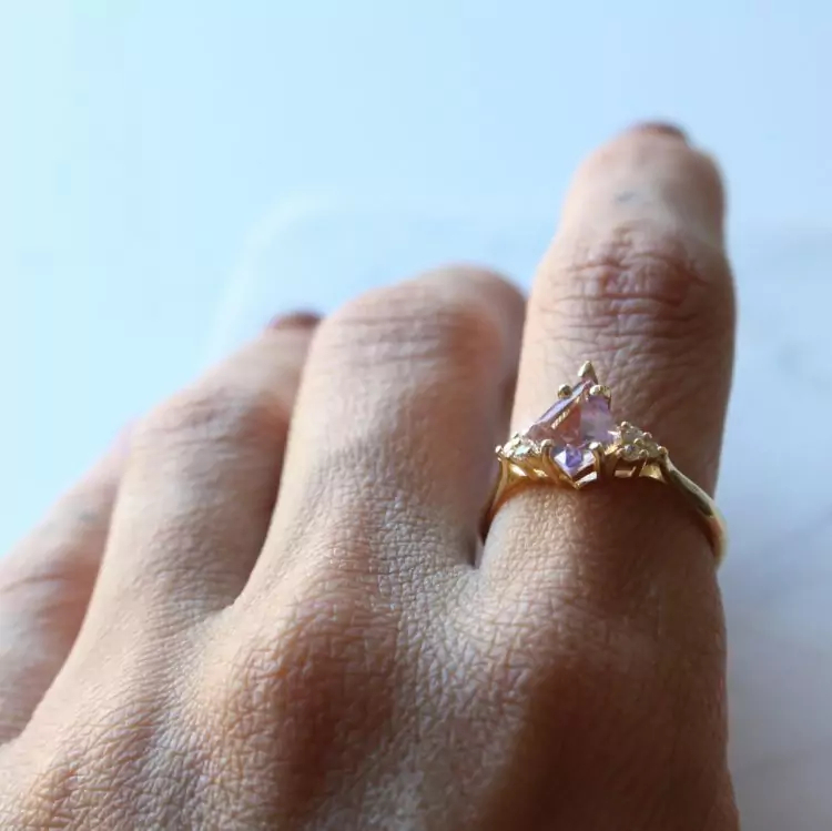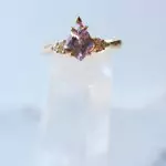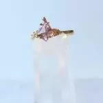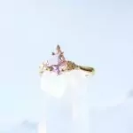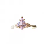 Esse anel tem uma ametista natural com lapidação diferenciada em formato de prisma e 6 zircônias transparentes.
