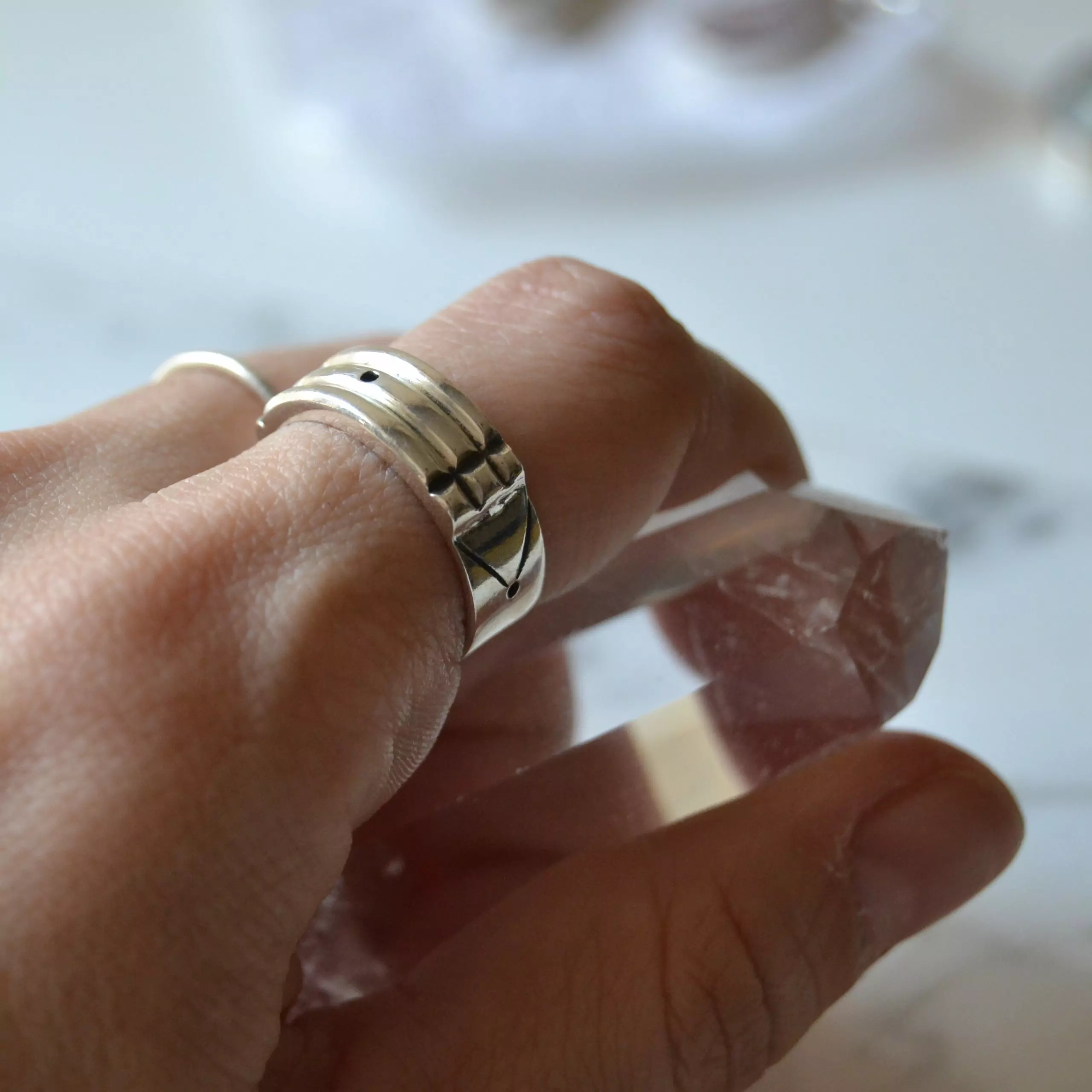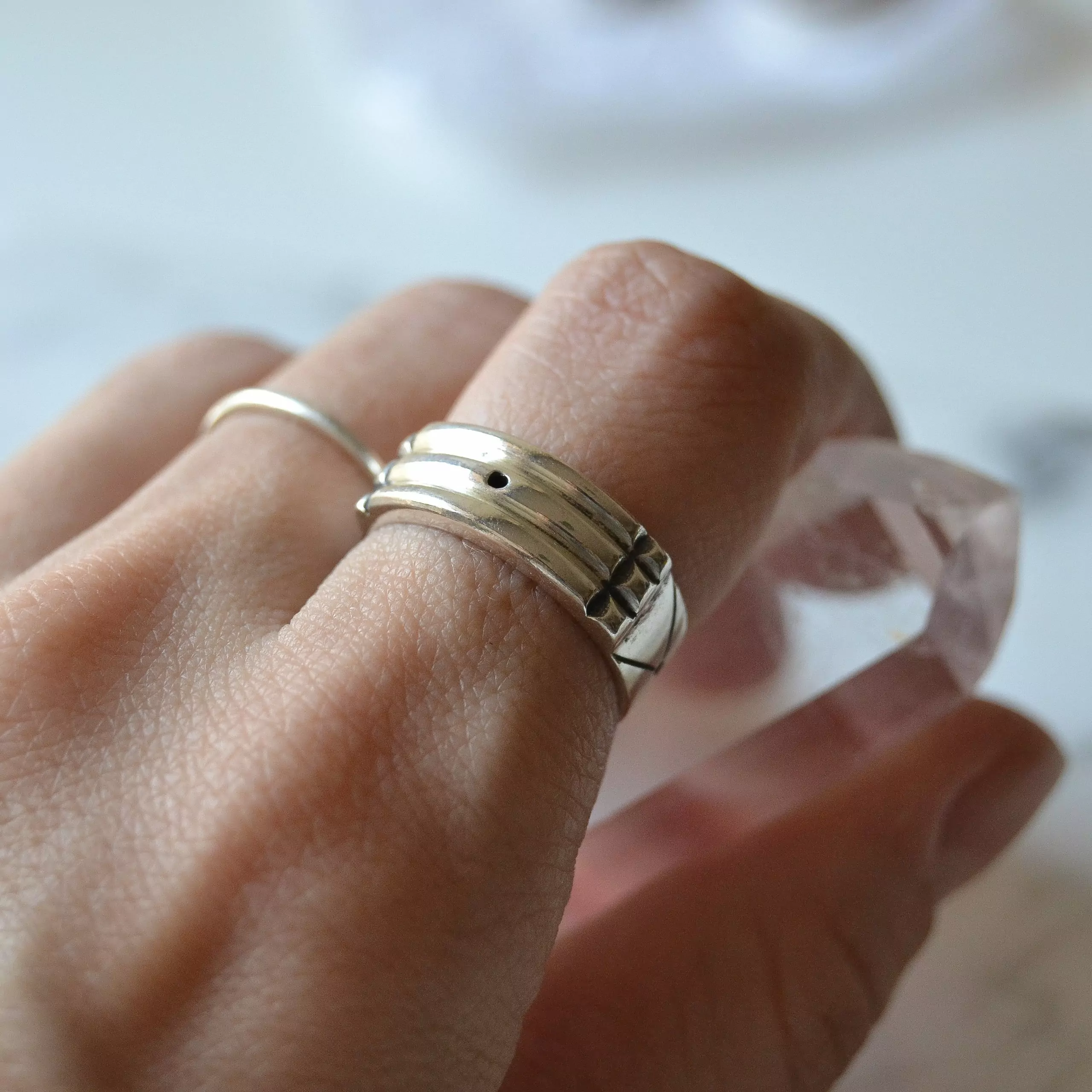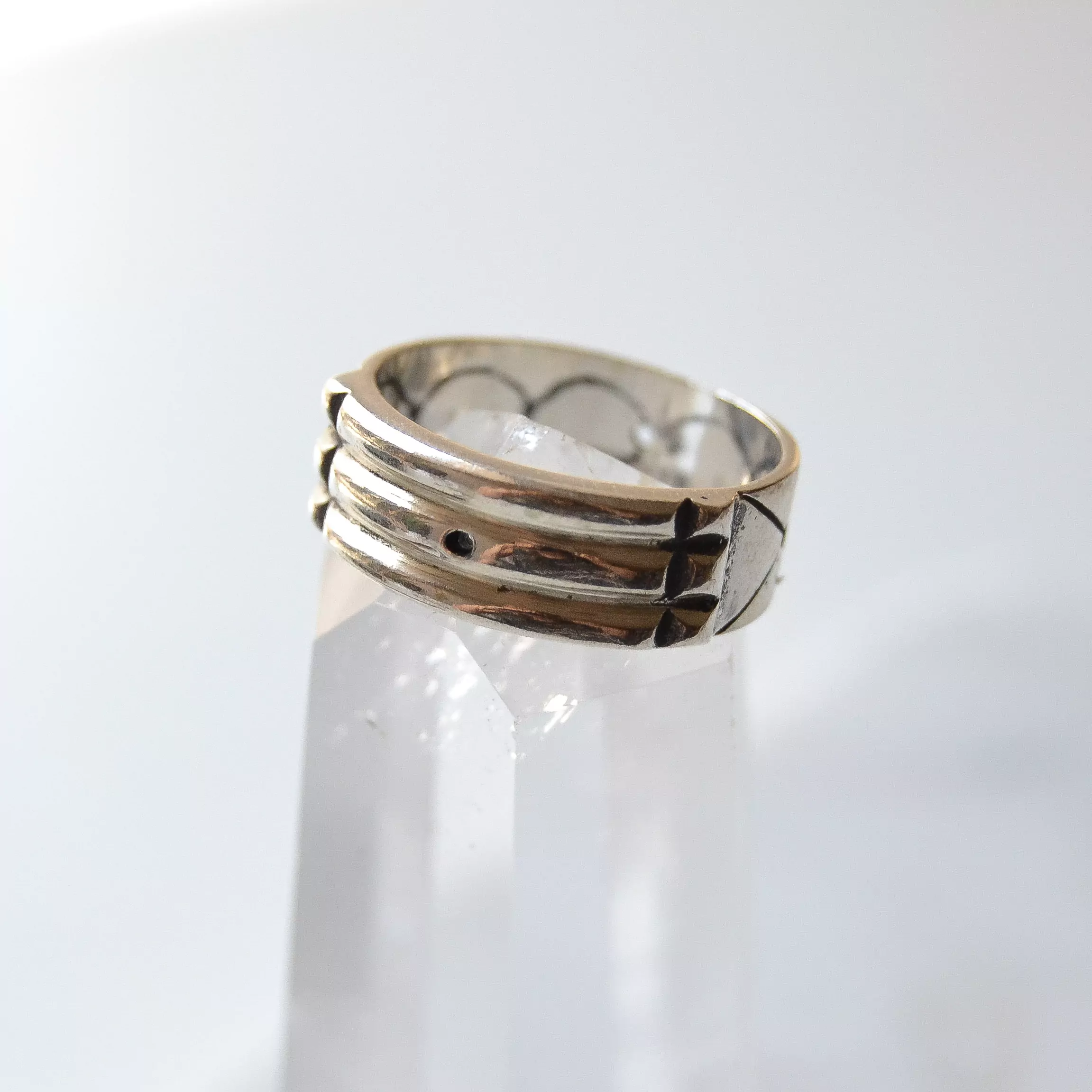 Anel de prata 925, também conhecida como prata de lei, modelo atlantis com desenhos em baixo relevo.