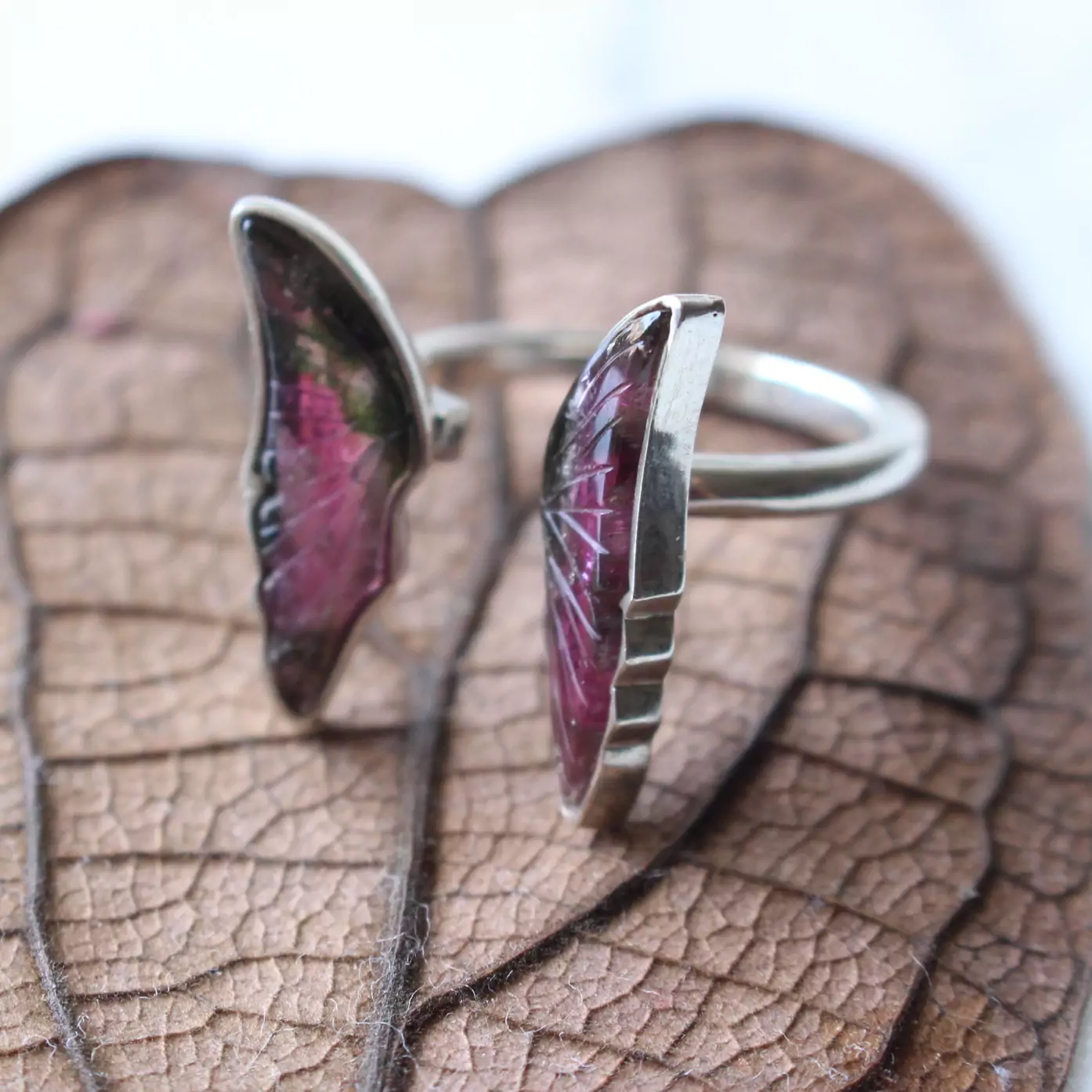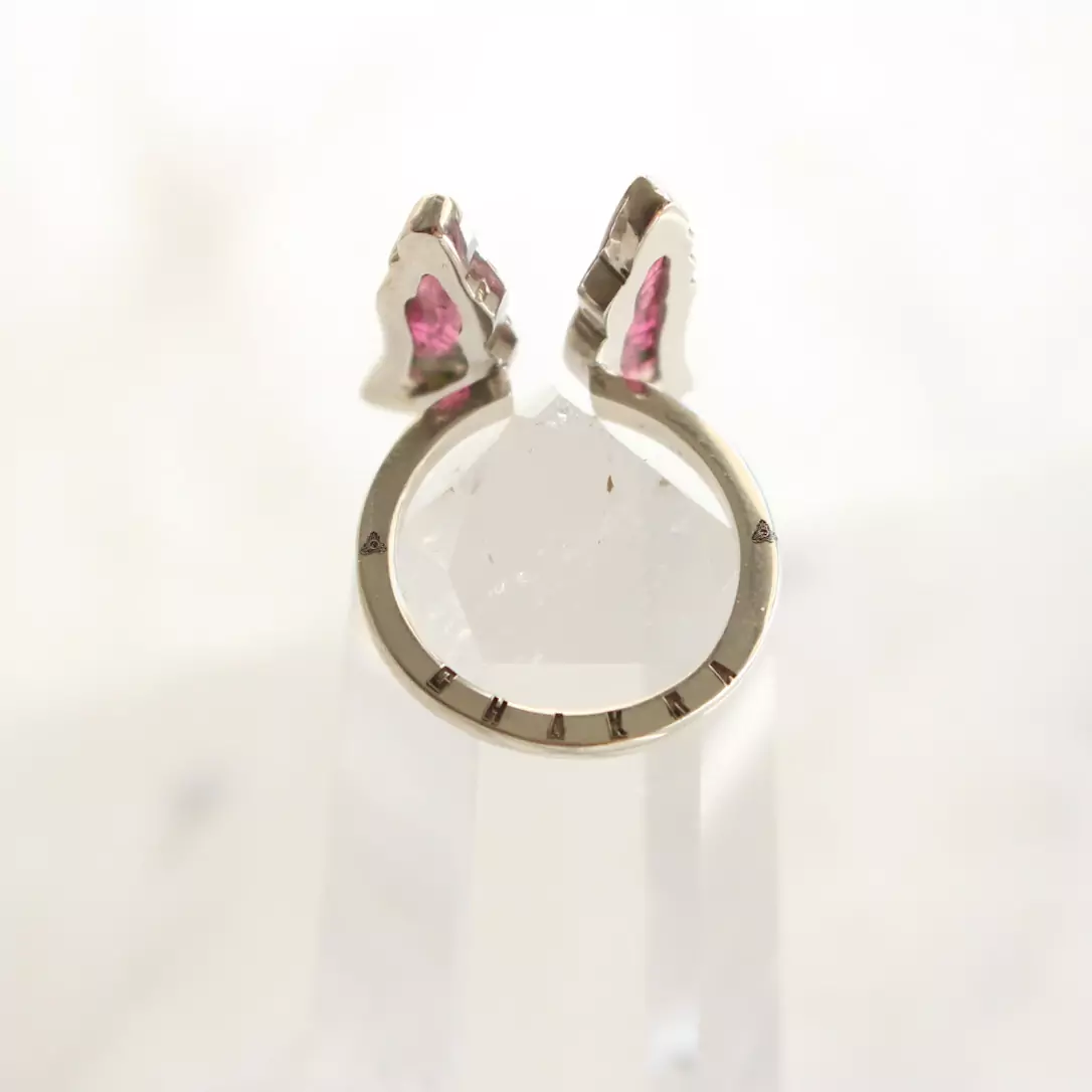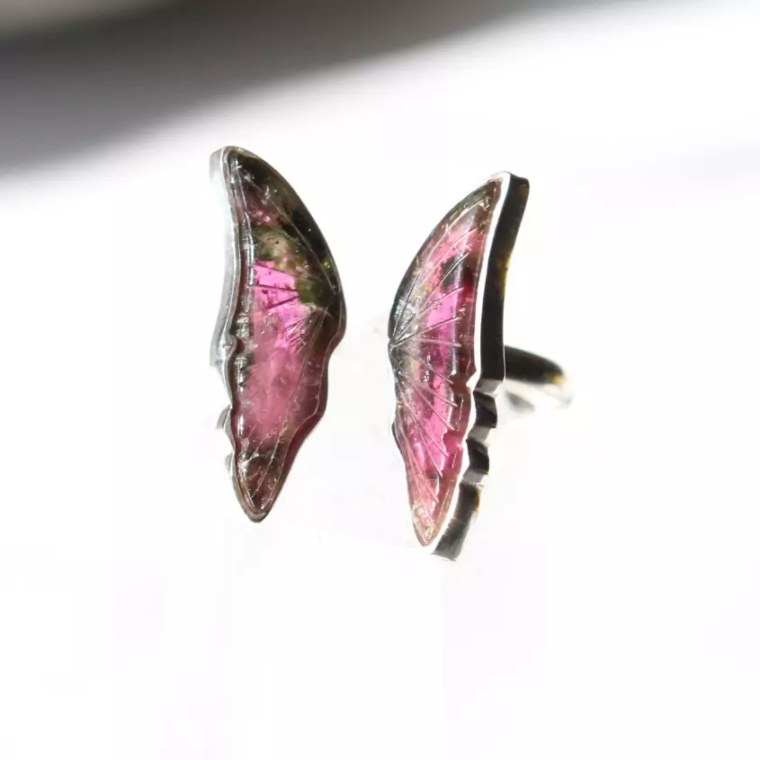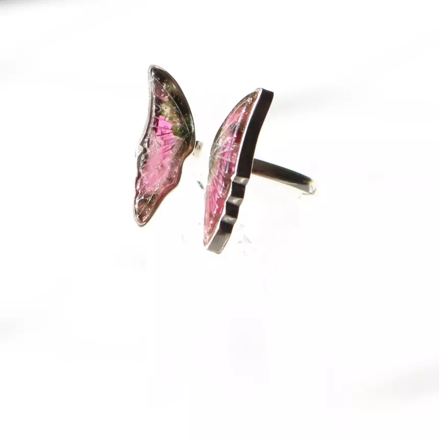 Anel de prata 925, também conhecida como prata de lei, da linha Chakra AUTORAL, com um par de turmalinas melancias lapidadas em formato de asas de borboleta e aro com medida ajustável. Serve bem da medida 12 até a 19.