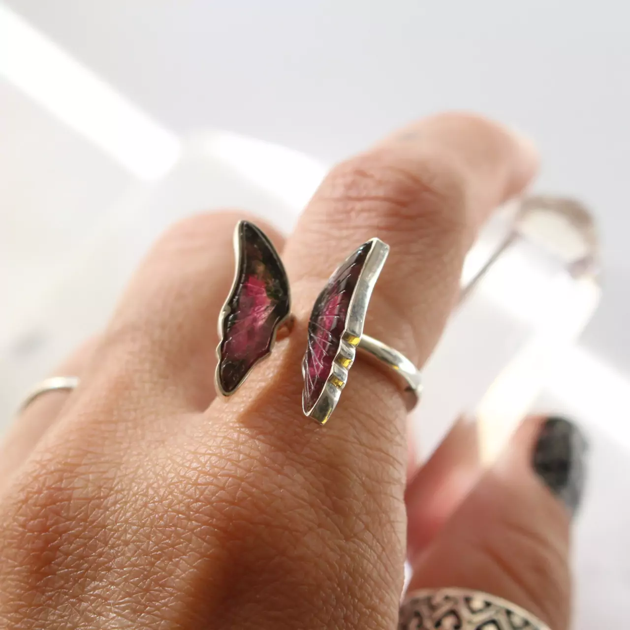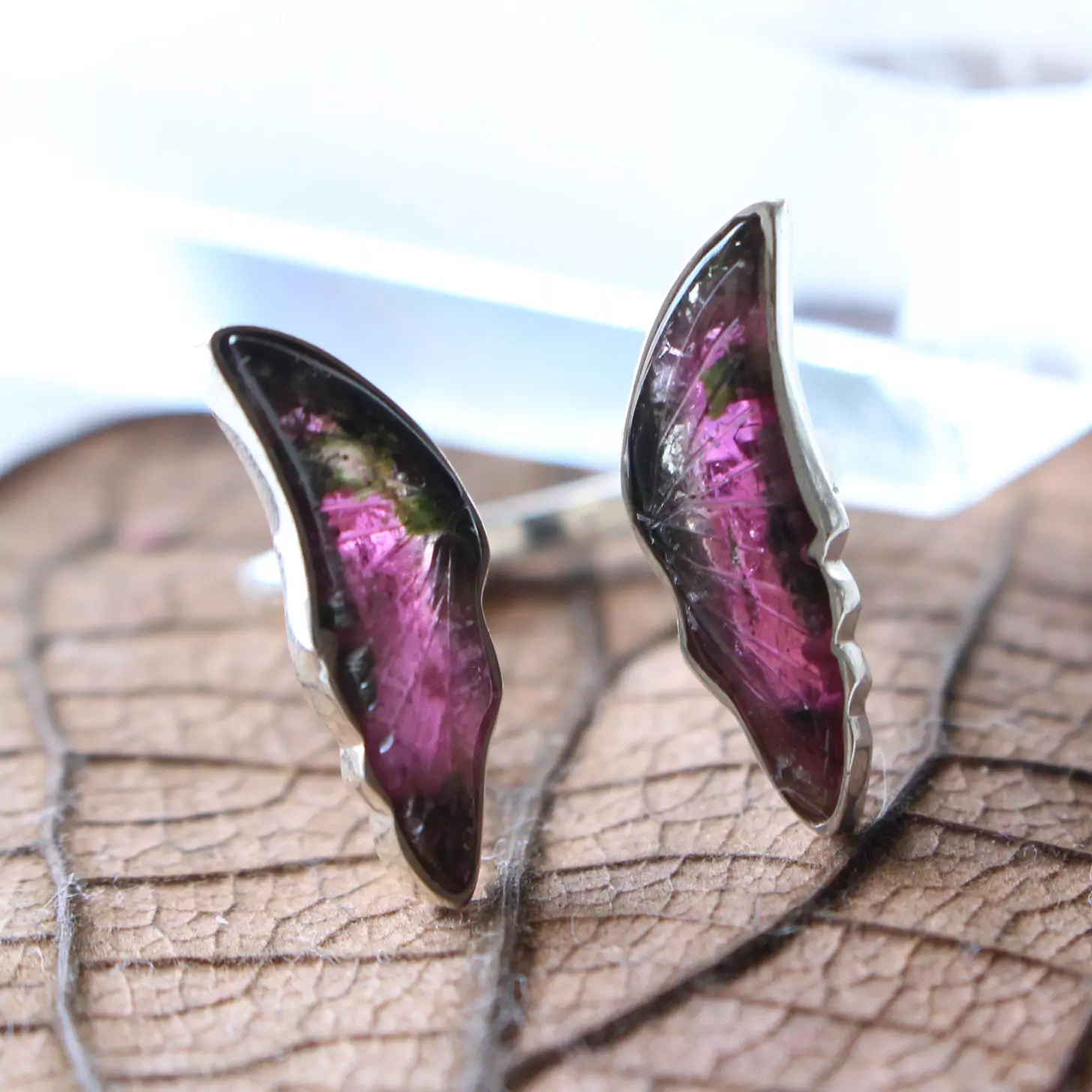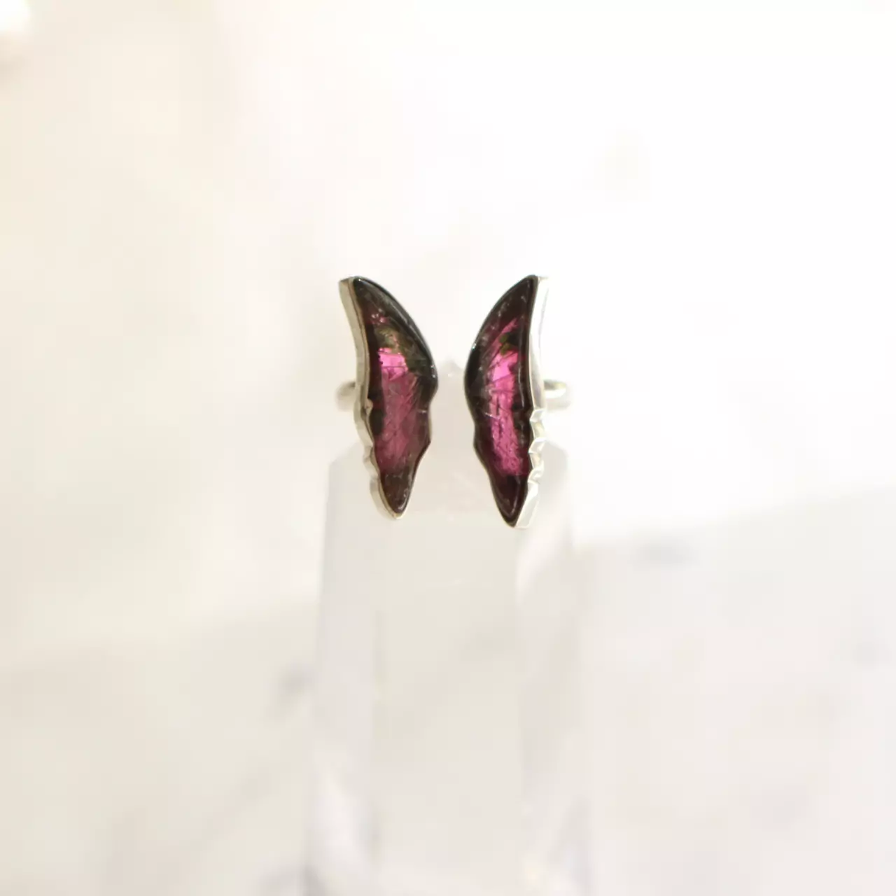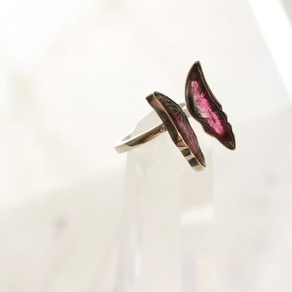 Anel de prata 925, também conhecida como prata de lei, da linha Chakra AUTORAL, com um par de turmalinas melancias lapidadas em formato de asas de borboleta e aro com medida ajustável. Serve bem da medida 12 até a 19.