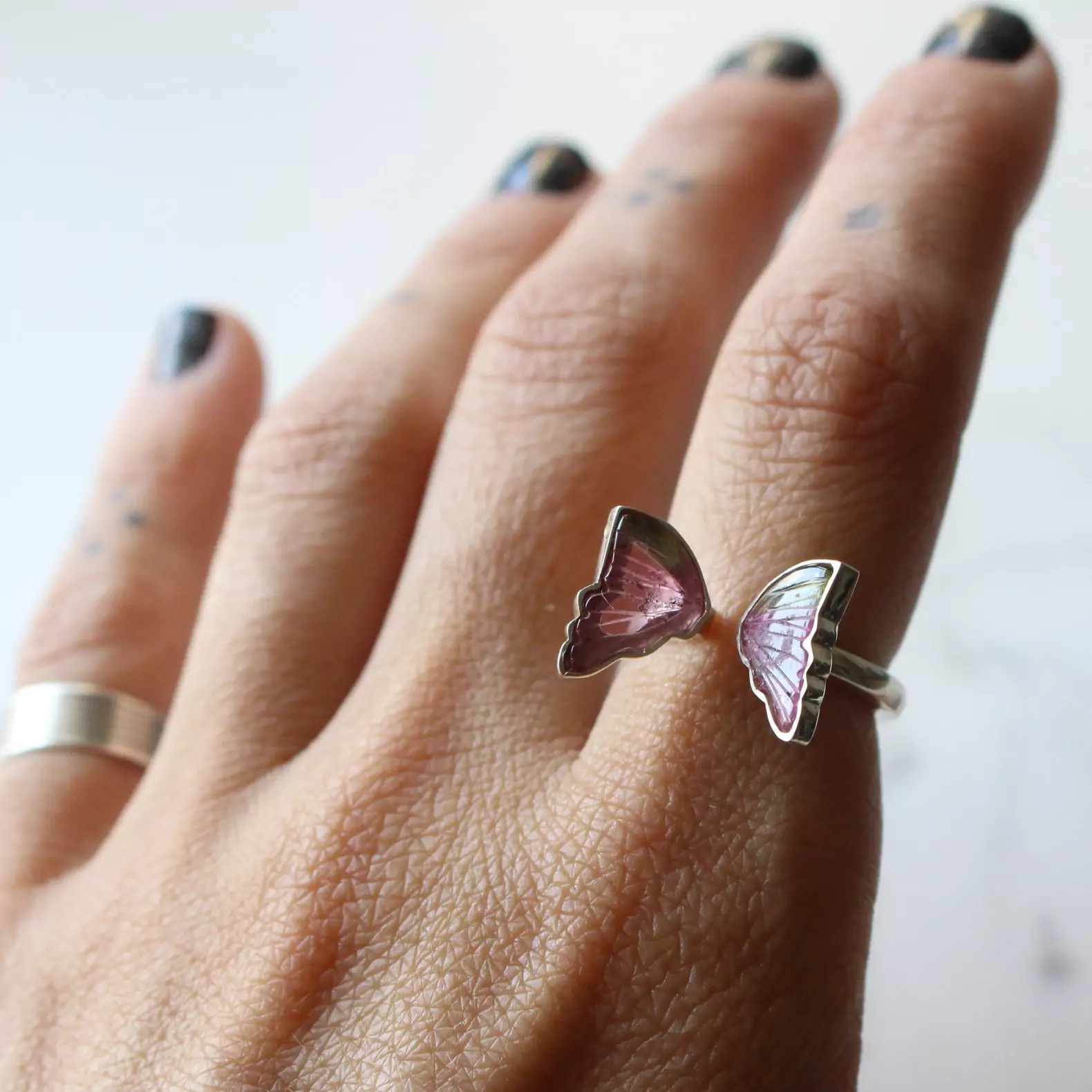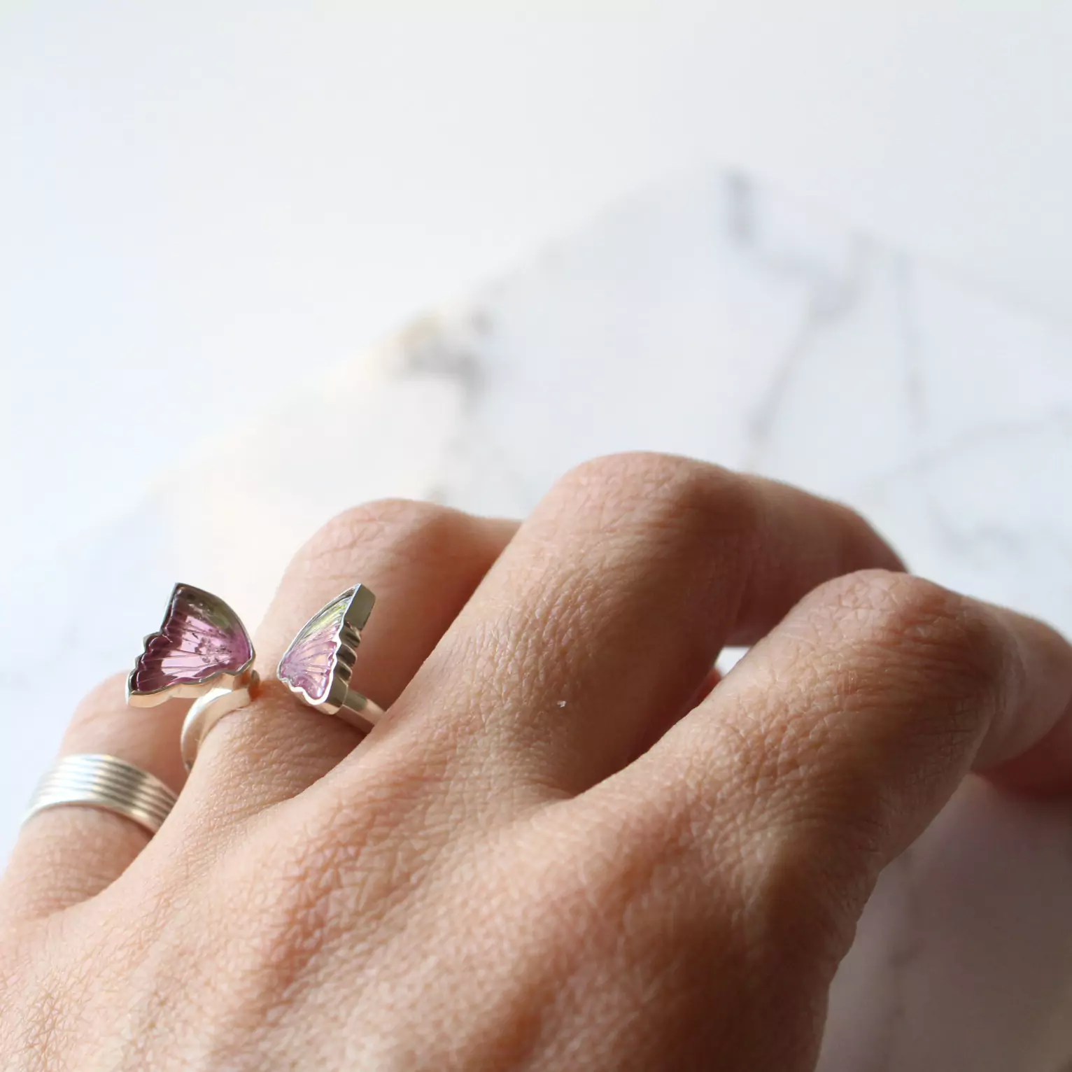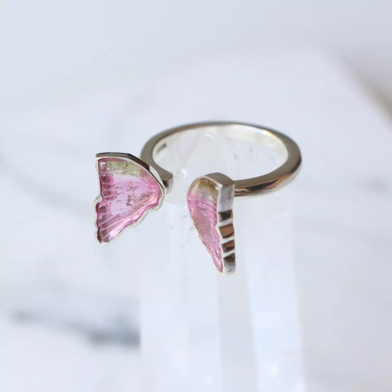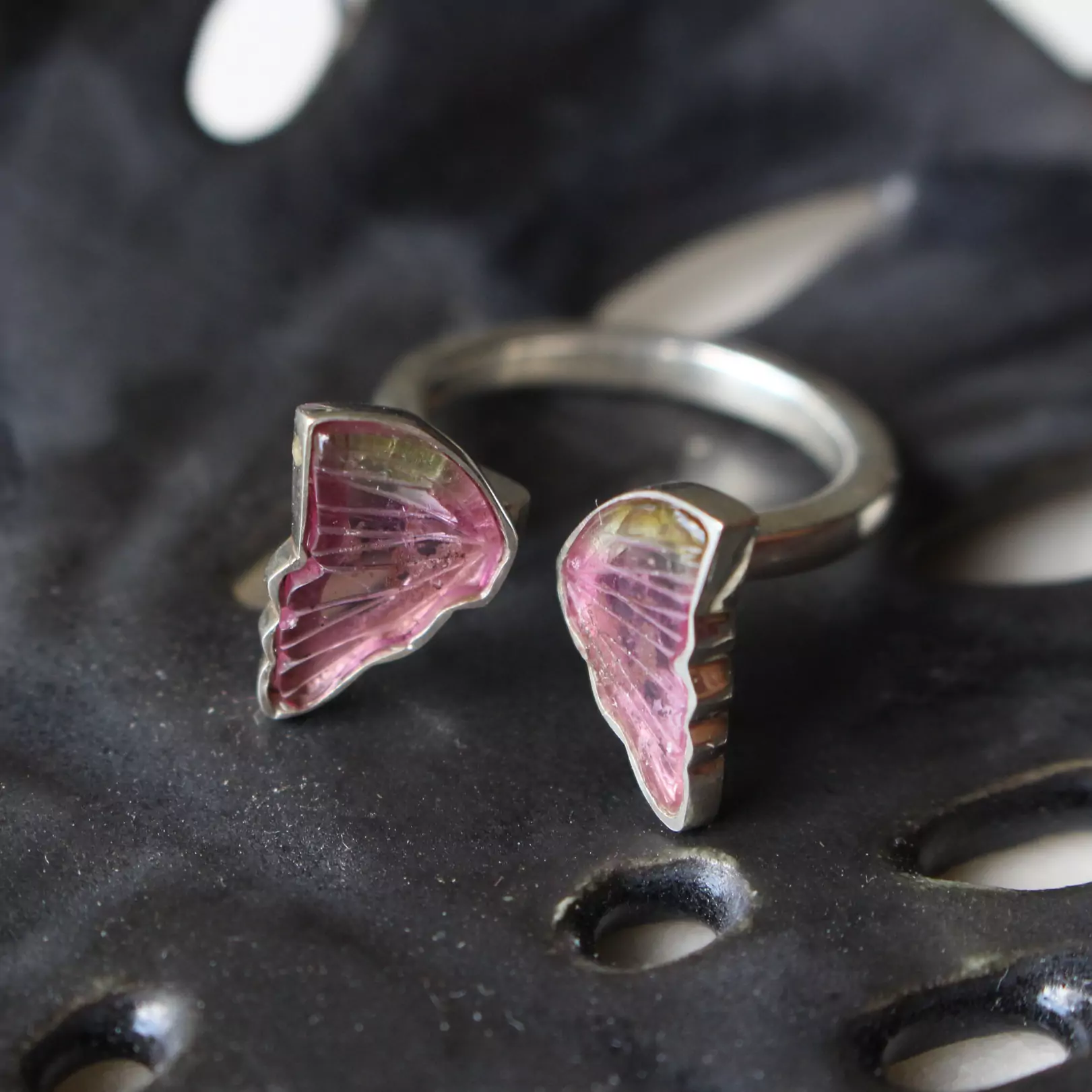 Anel de prata 925, também conhecida como prata de lei, da linha Chakra AUTORAL, com um par de turmalinas melancias lapidadas em formato de asas de borboleta e aro com medida ajustável. Serve bem da medida 12 até a 19.
