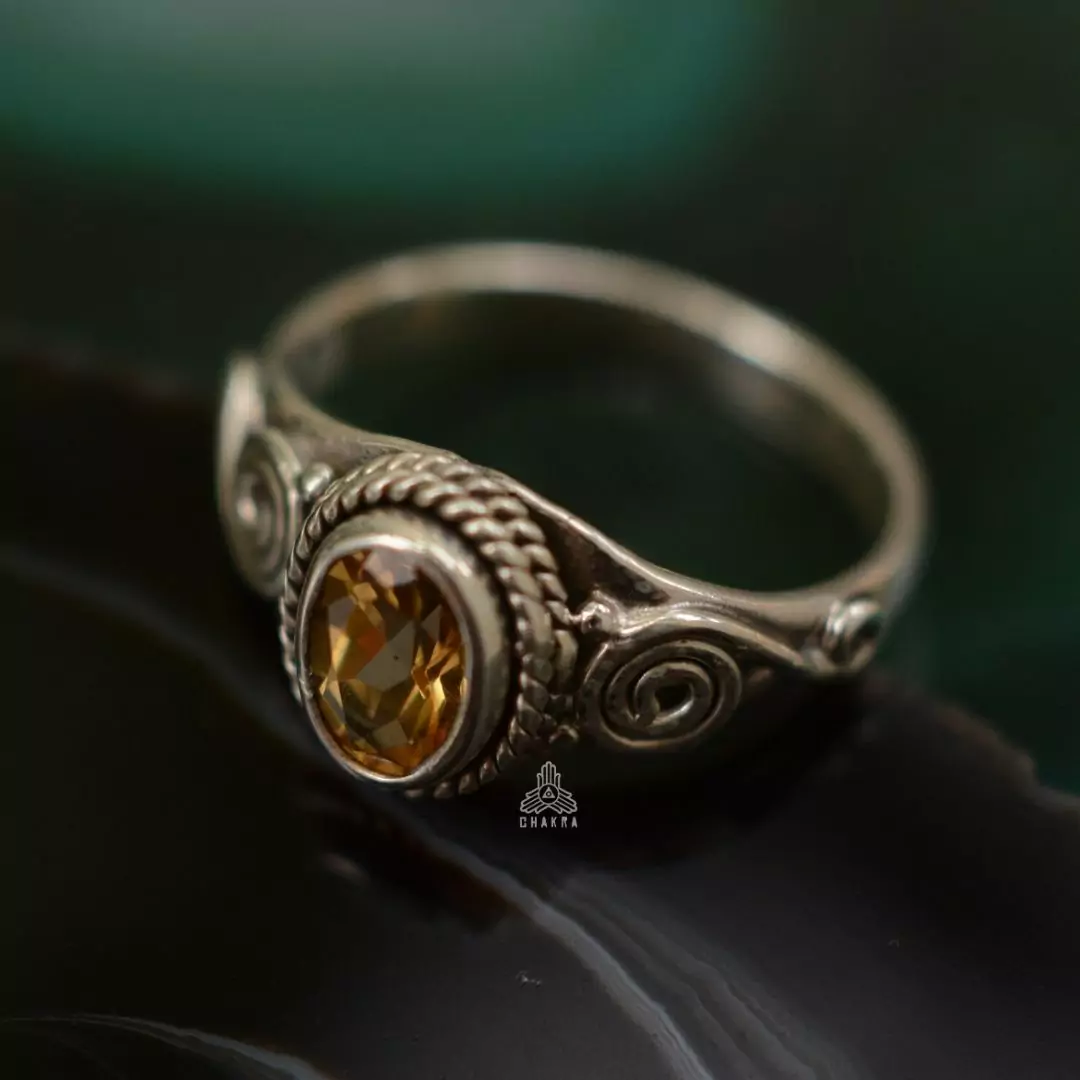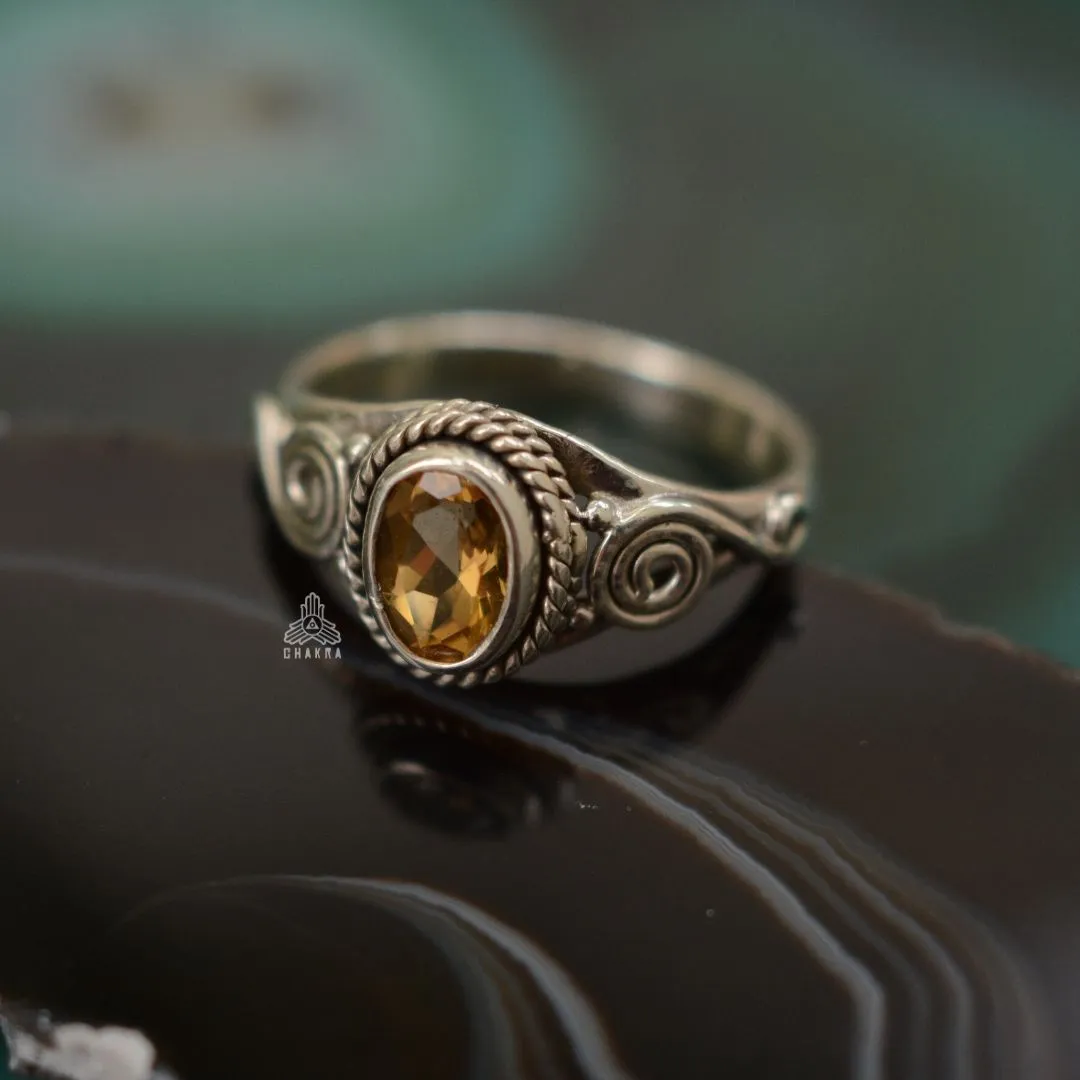 Anel de prta 925, também conhecida como prata de lei, com um citrino natural e detalhes em espiral na lateral.