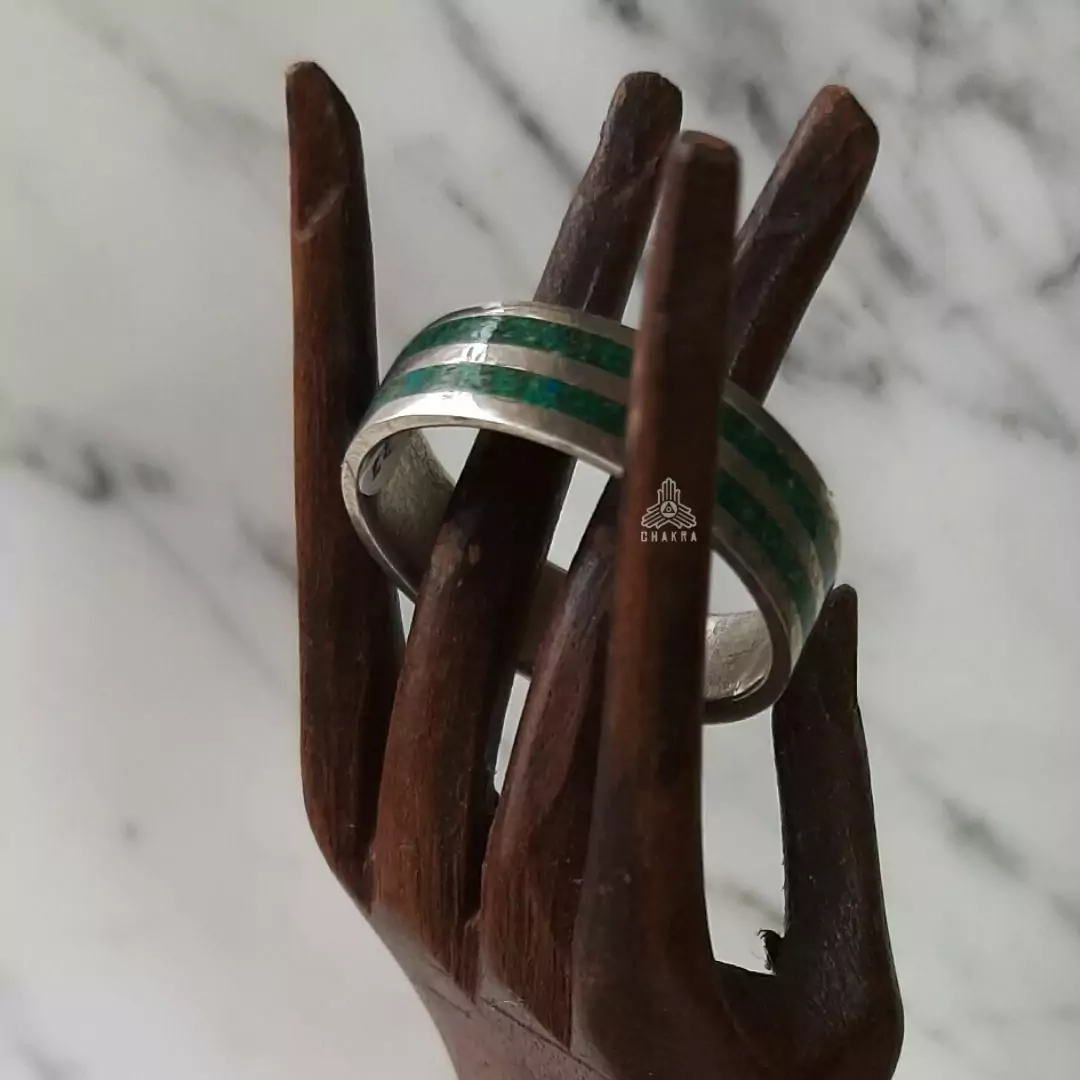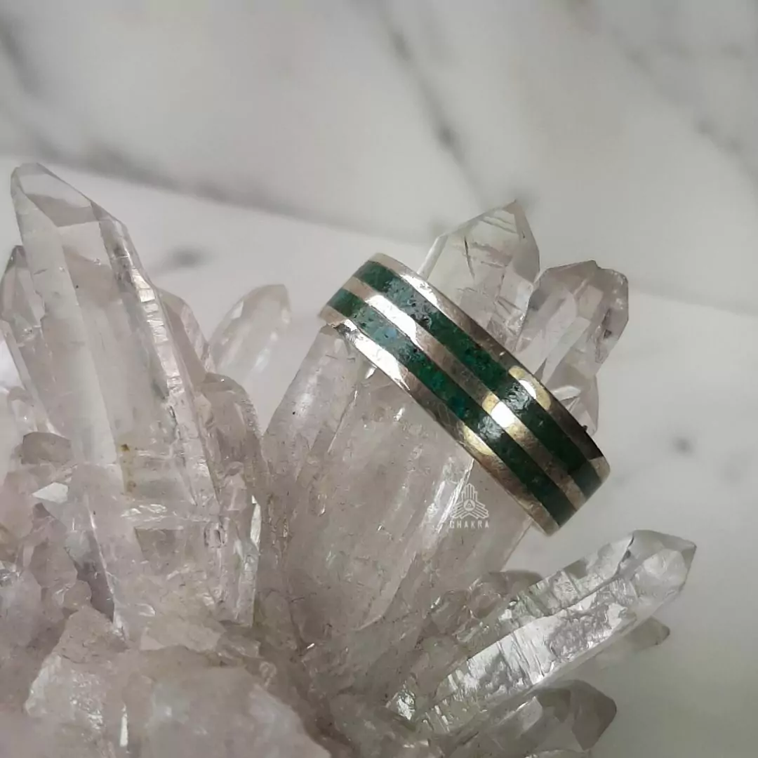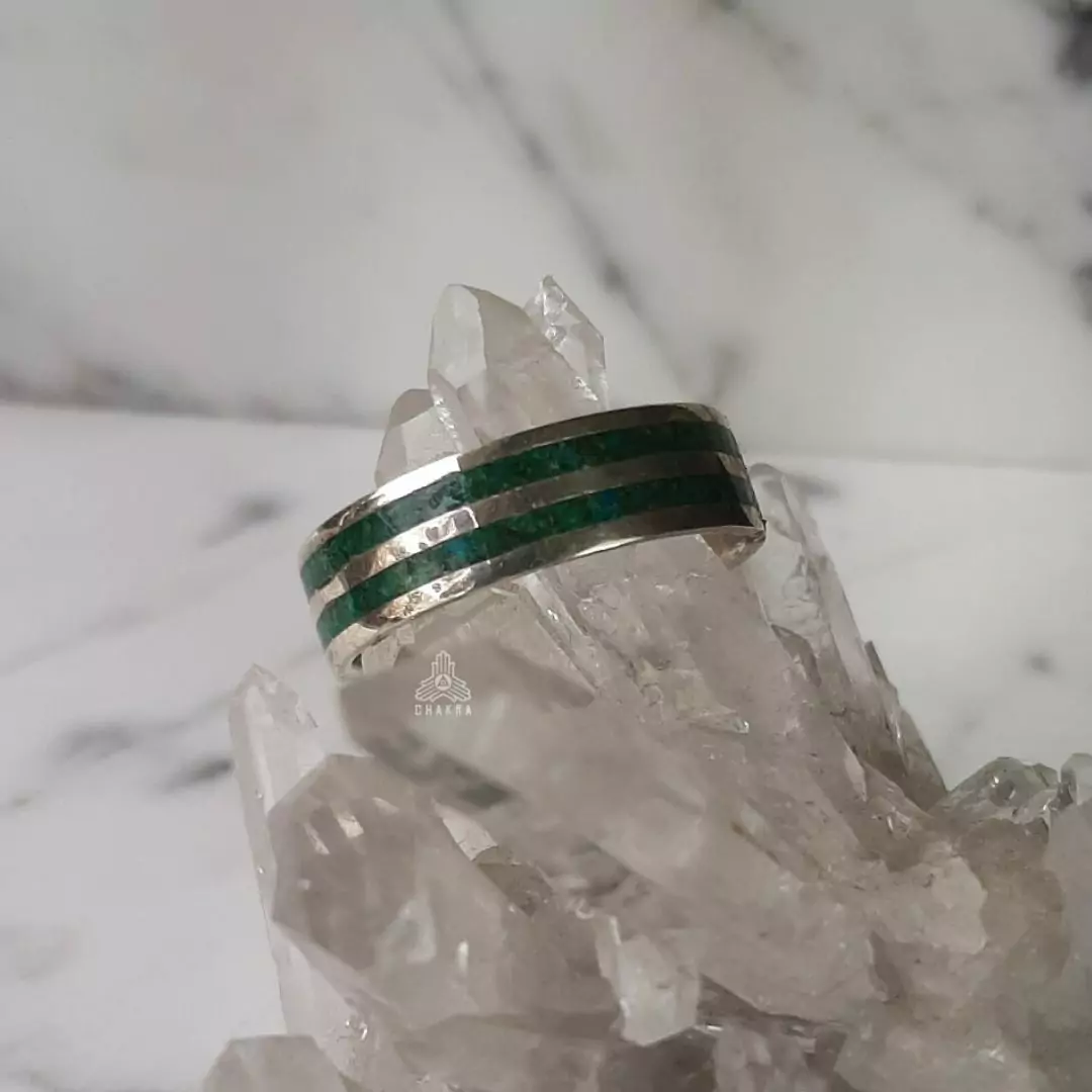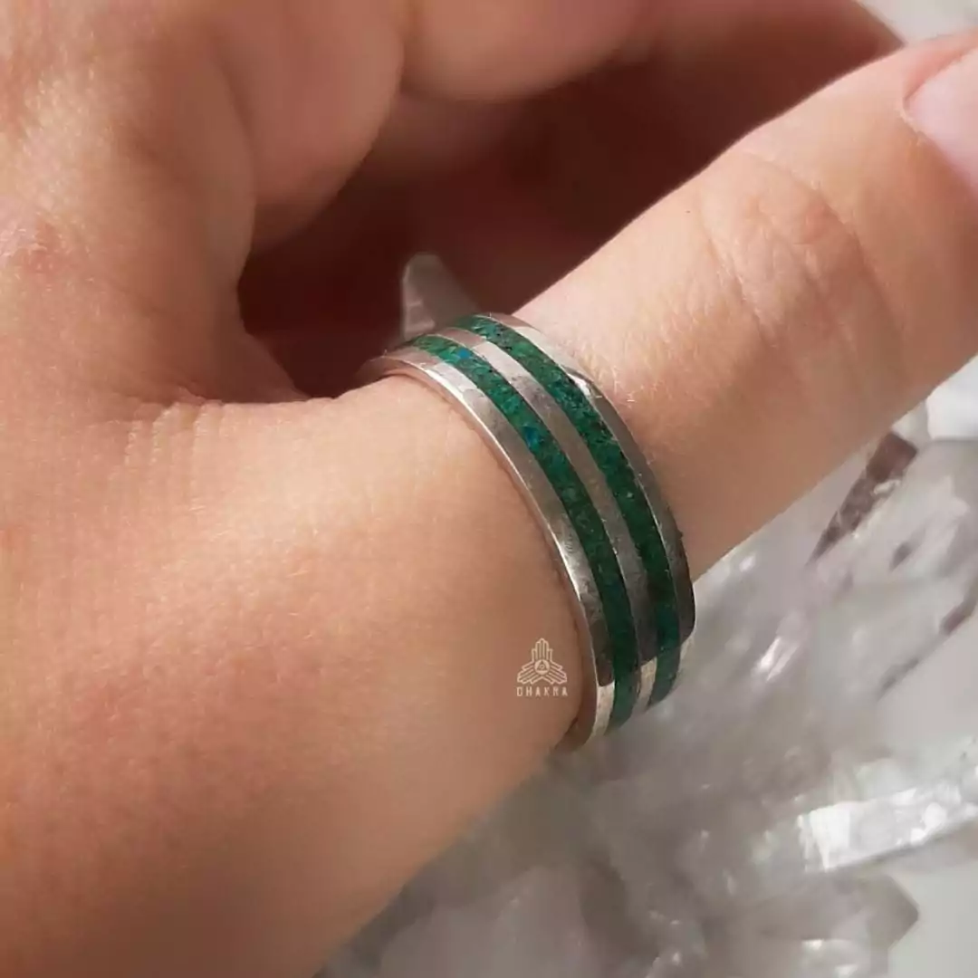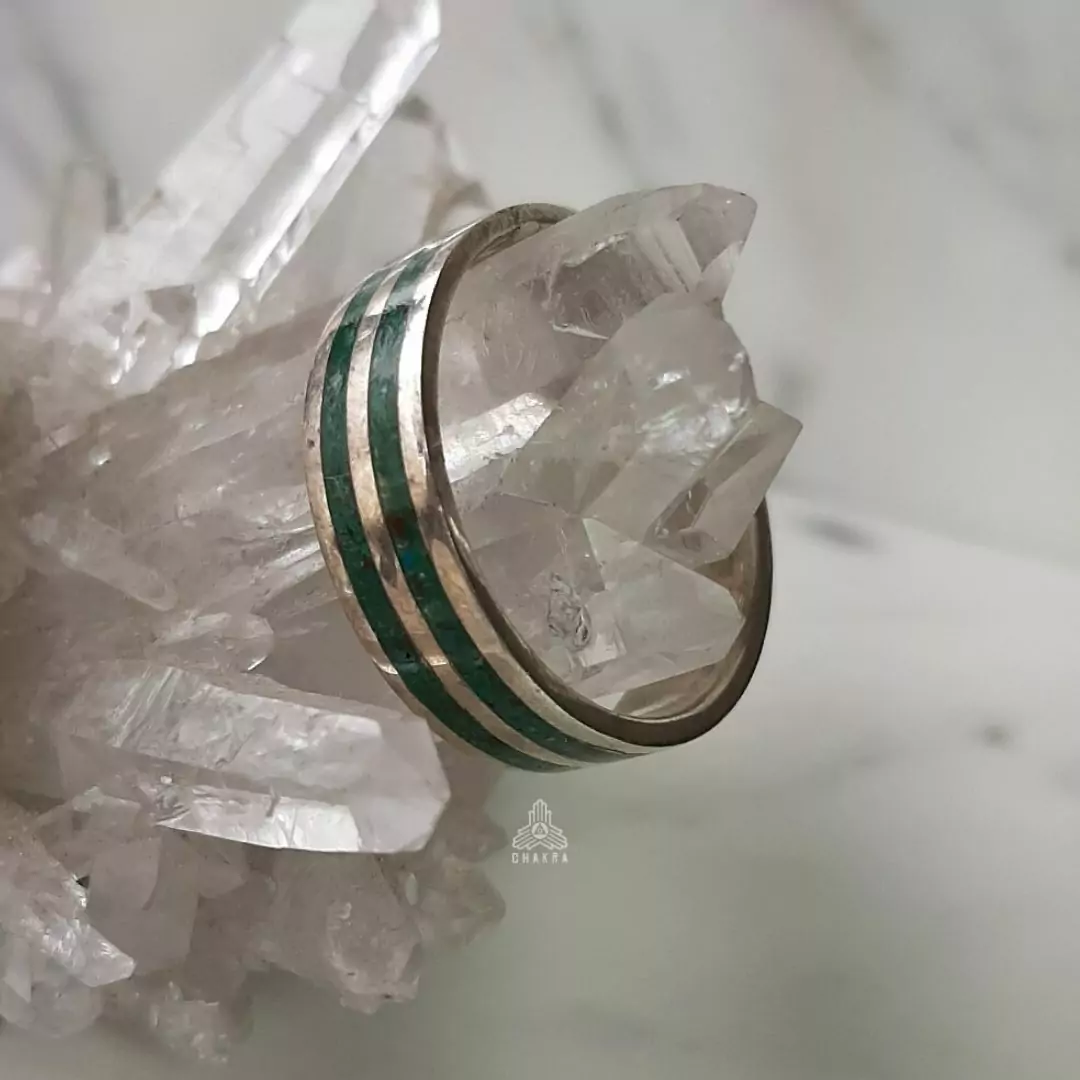 Anel de prata 925, também conhecida como prata de lei, com dois frisos preenchido por crisocola triturada