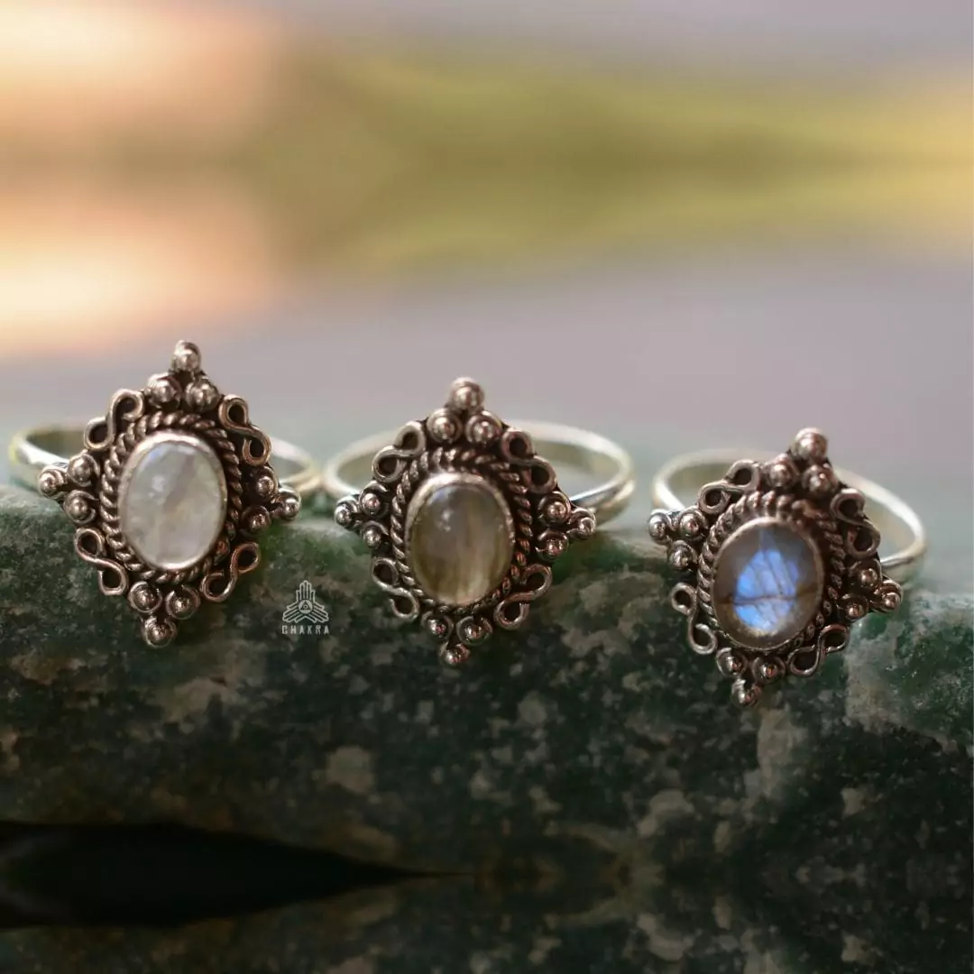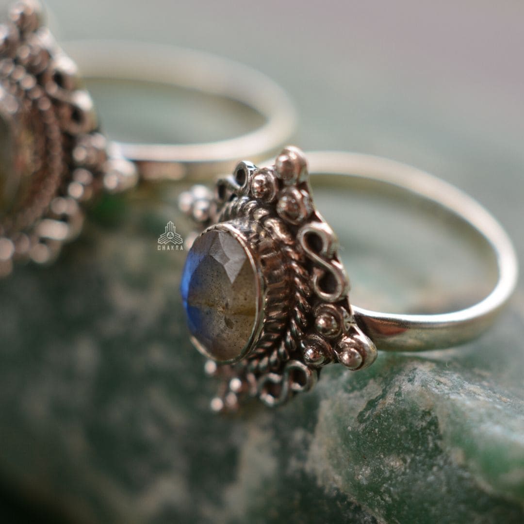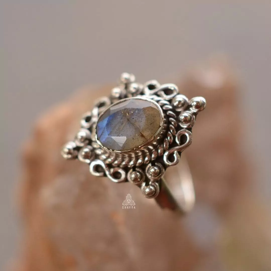 Anel de prata 925, também conhecida como prata de lei, com uma labradorita natural com acabamento facetado e detalhes em arabescos