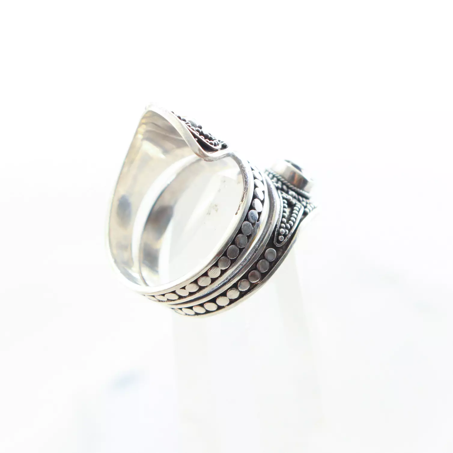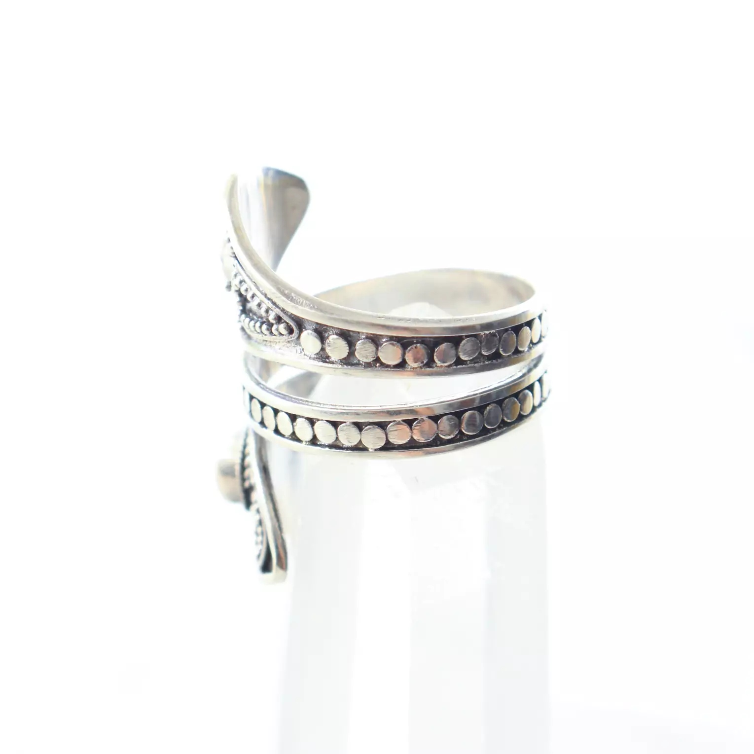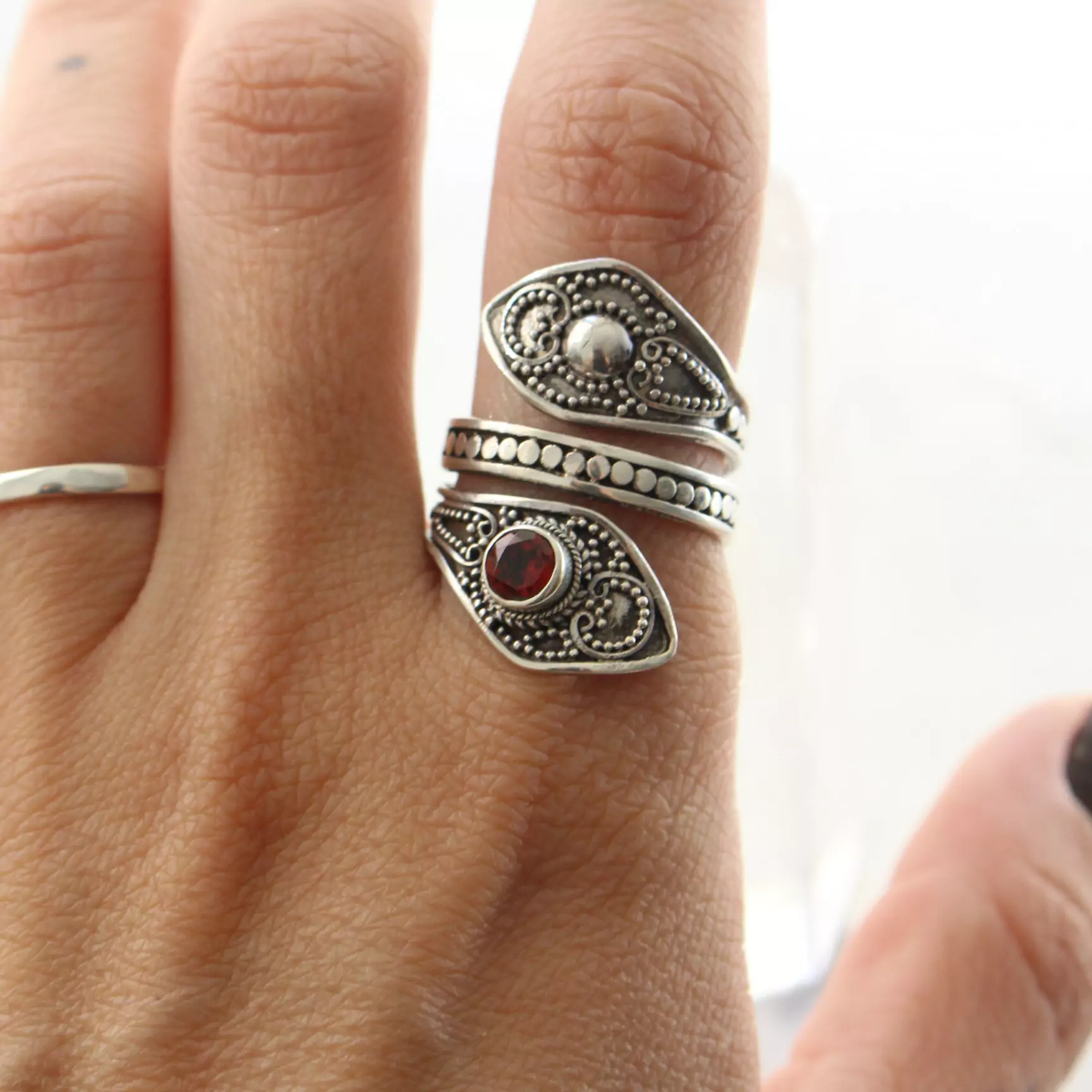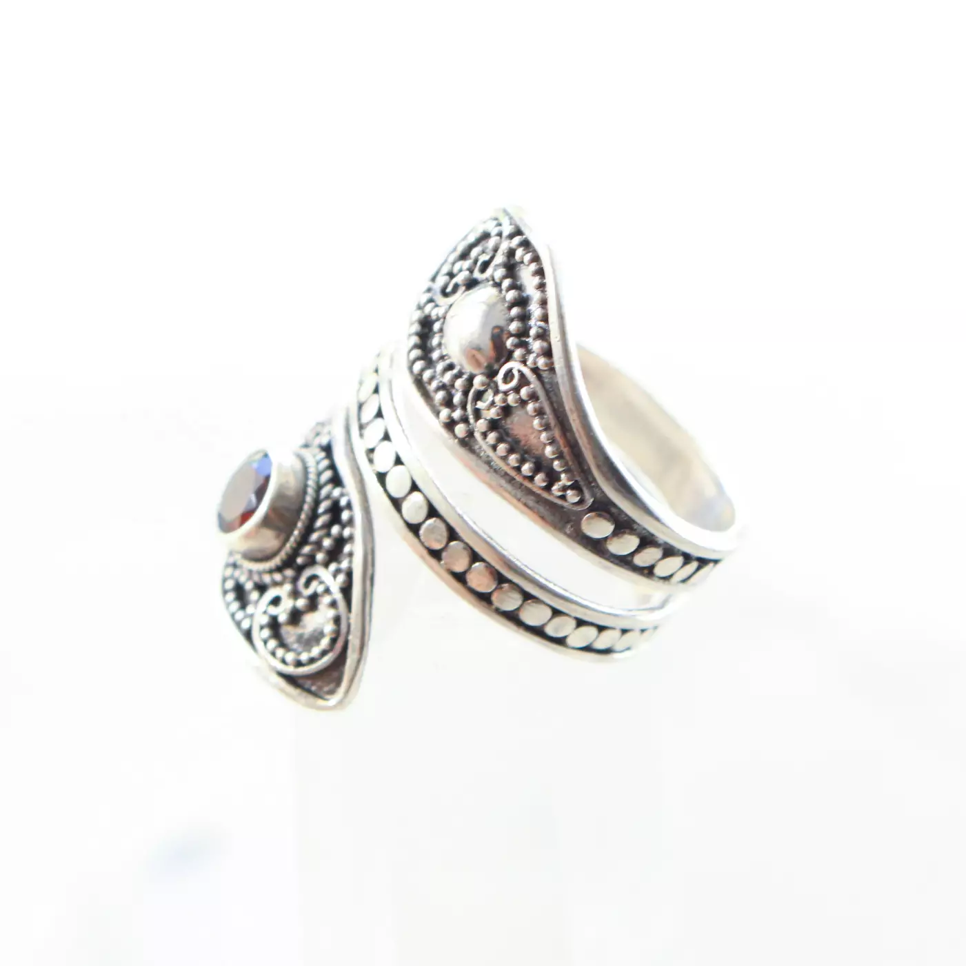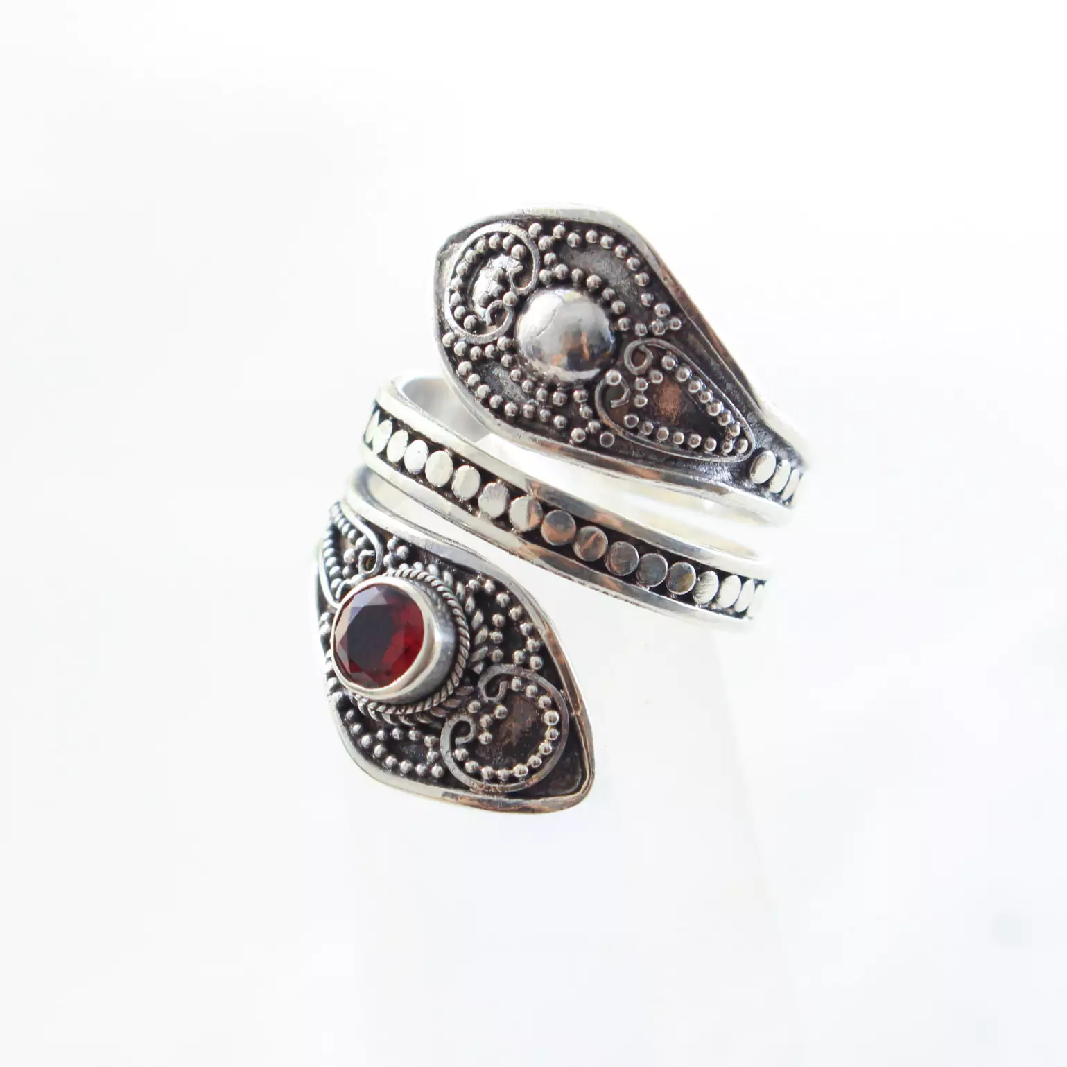 Anel de prata 925, também conhecida como prata de lei, em formato espiral com detalhes em filigrana e uma granada natural com lapidação facetada.