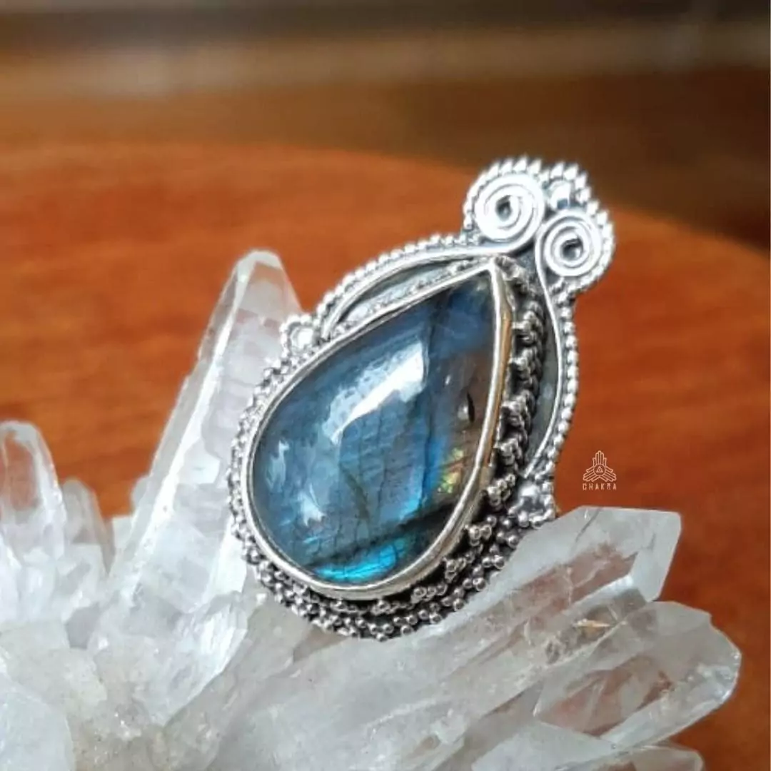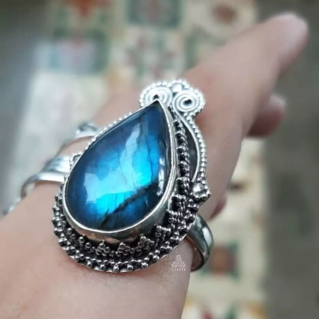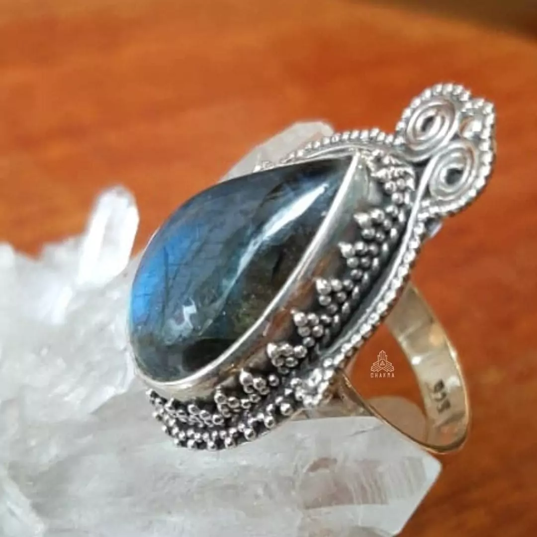 Anel de prata 925, tembém conhecida como prata de lei, com uma gota de labradorita natural e detalhes na lateral