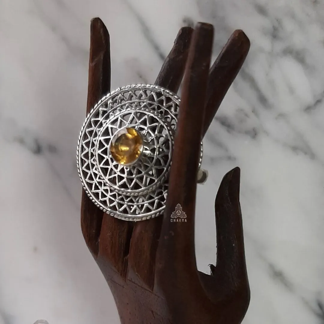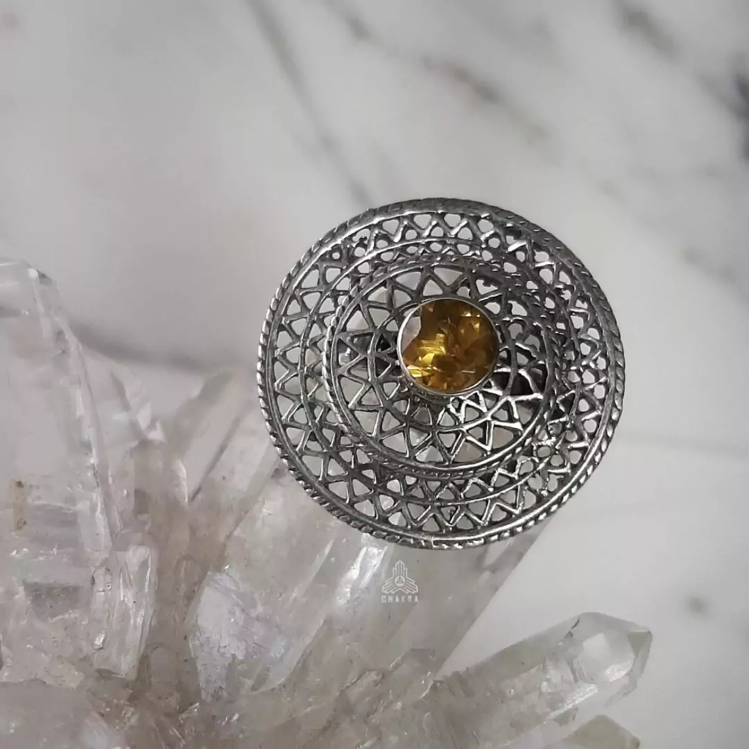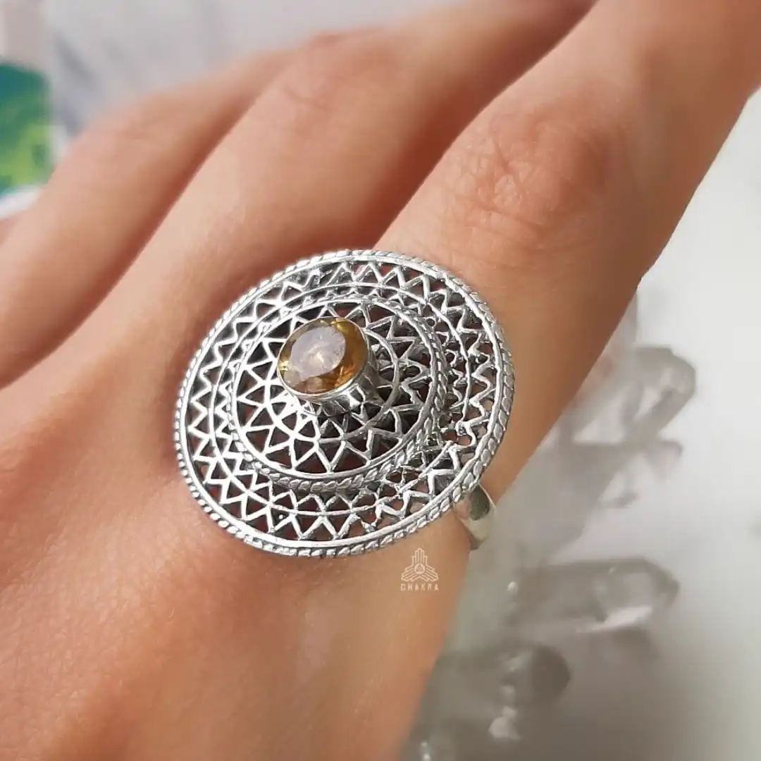 Anel de prata 925, também conhecida como prata de lei, com uma mandala vazada e um citrino natural no meio