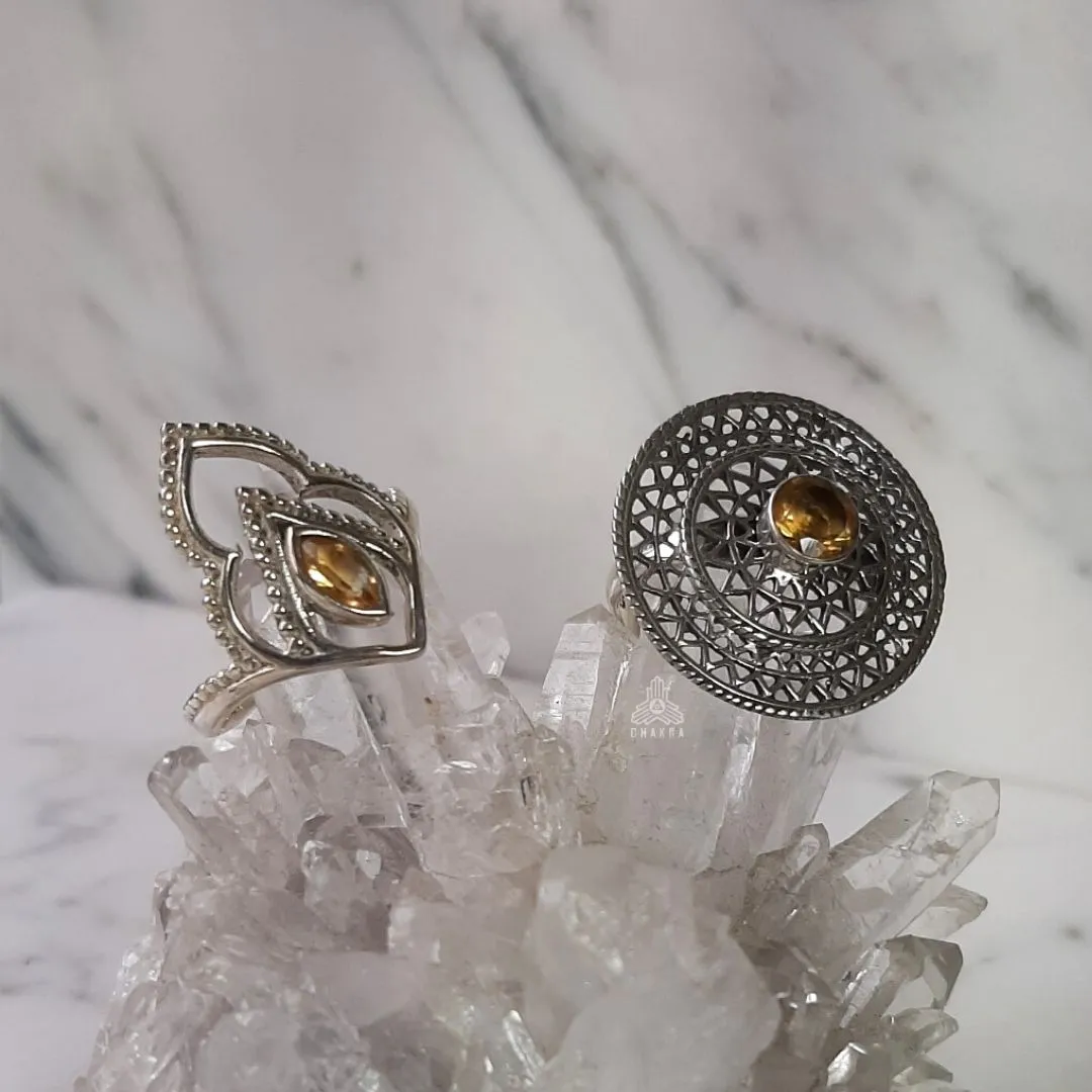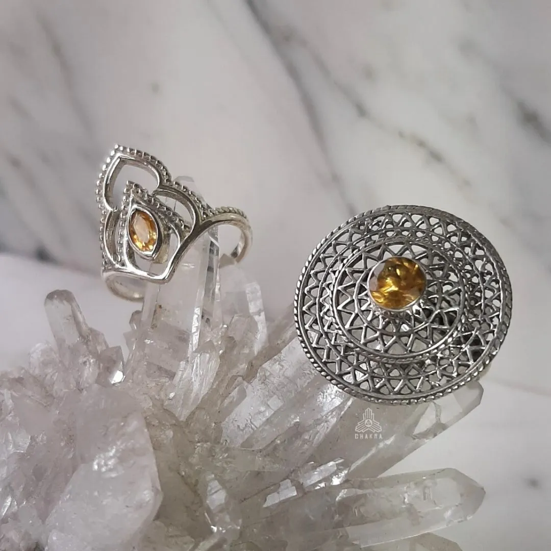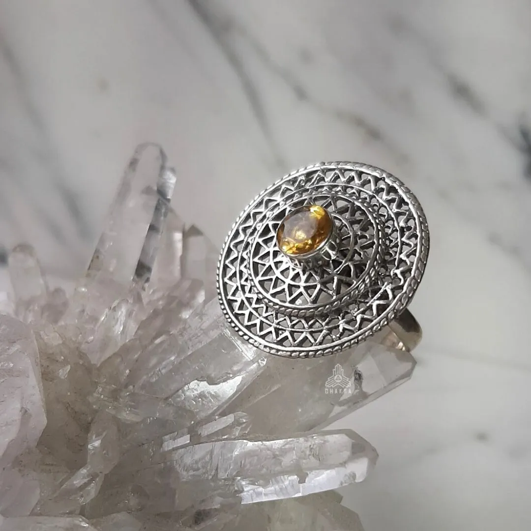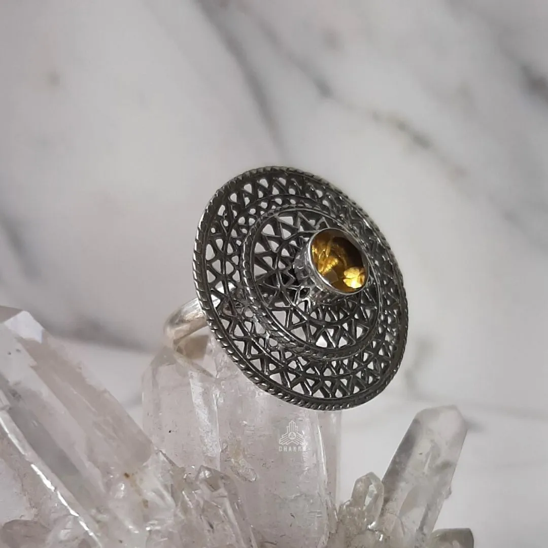 Anel de prata 925, também conhecida como prata de lei, com uma mandala vazada e um citrino natural no meio