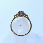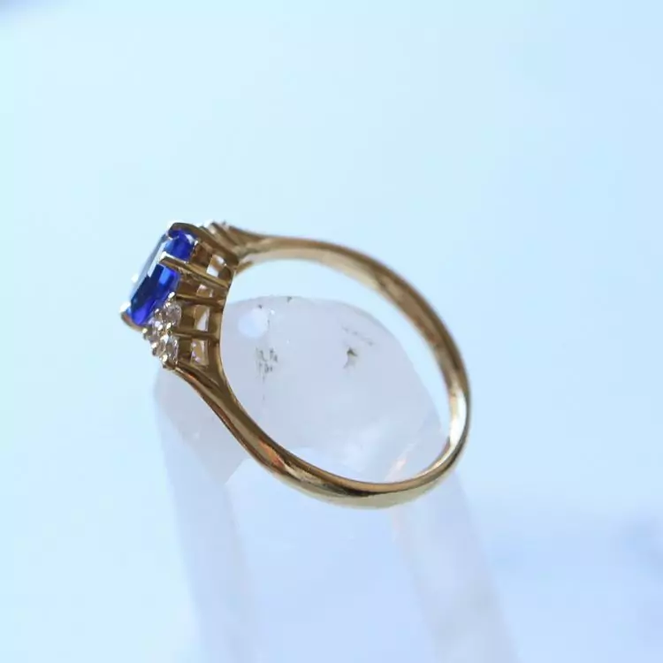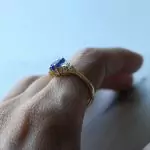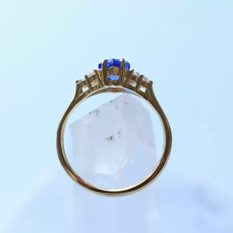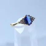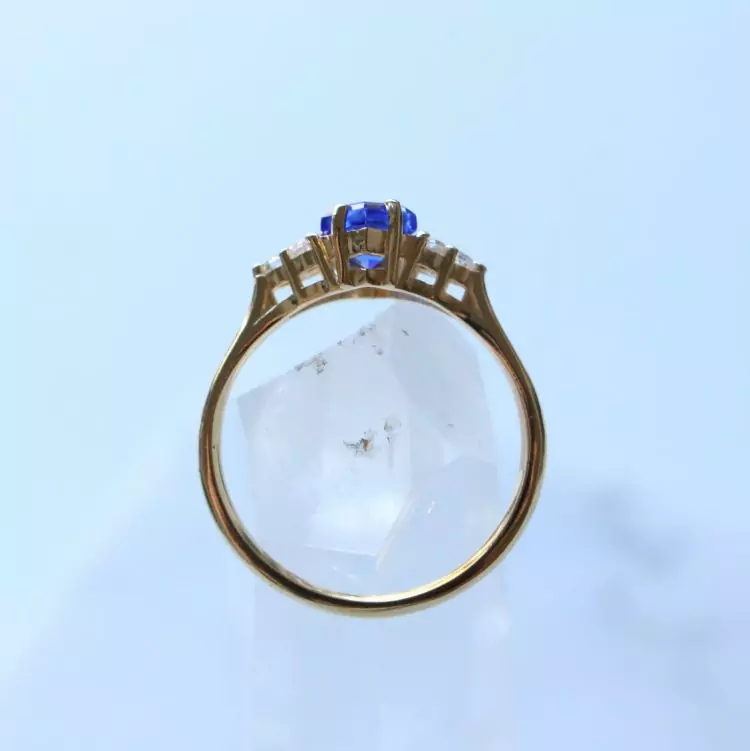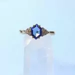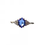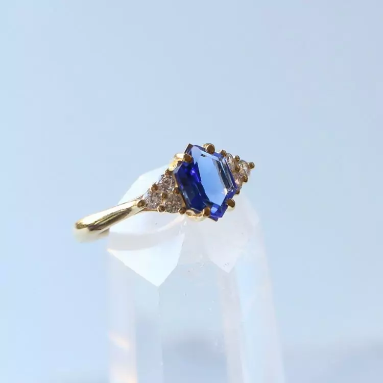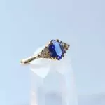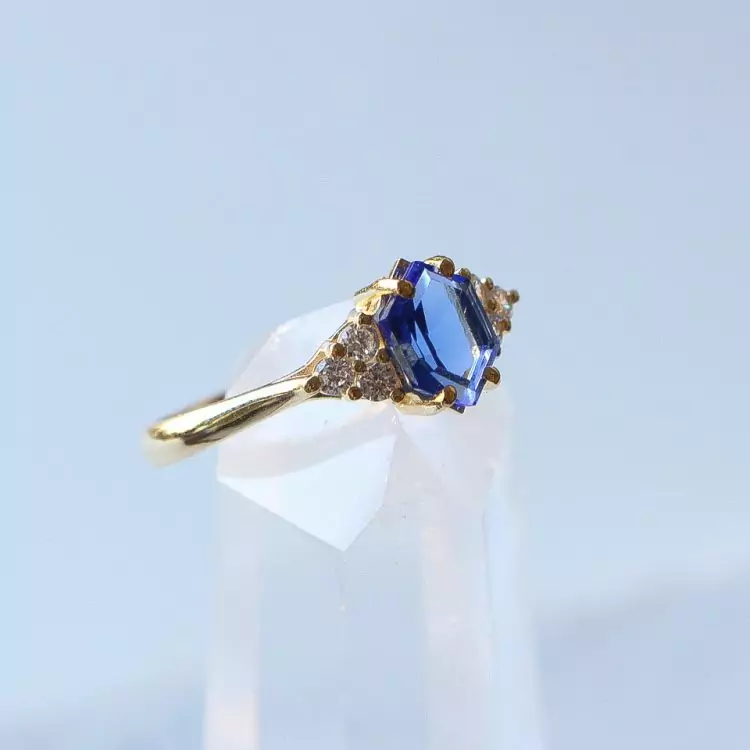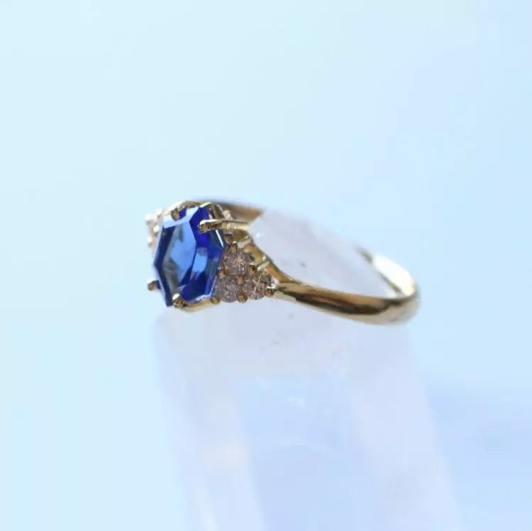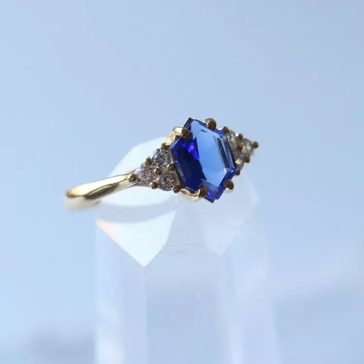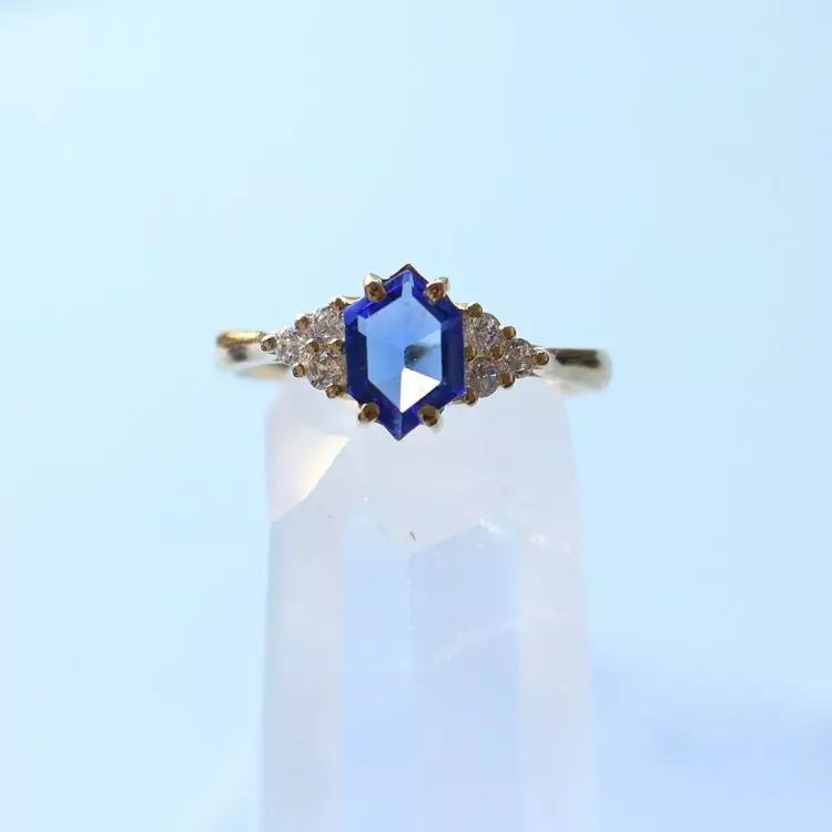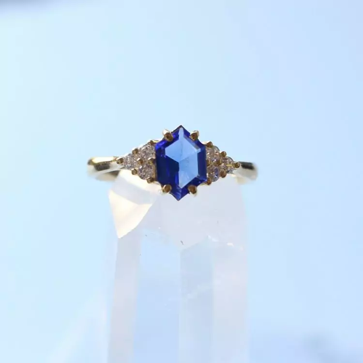 Esse anel tem uma safira natural com lapidação diferenciada em formato de hexagono e 6 zircônias transparentes.