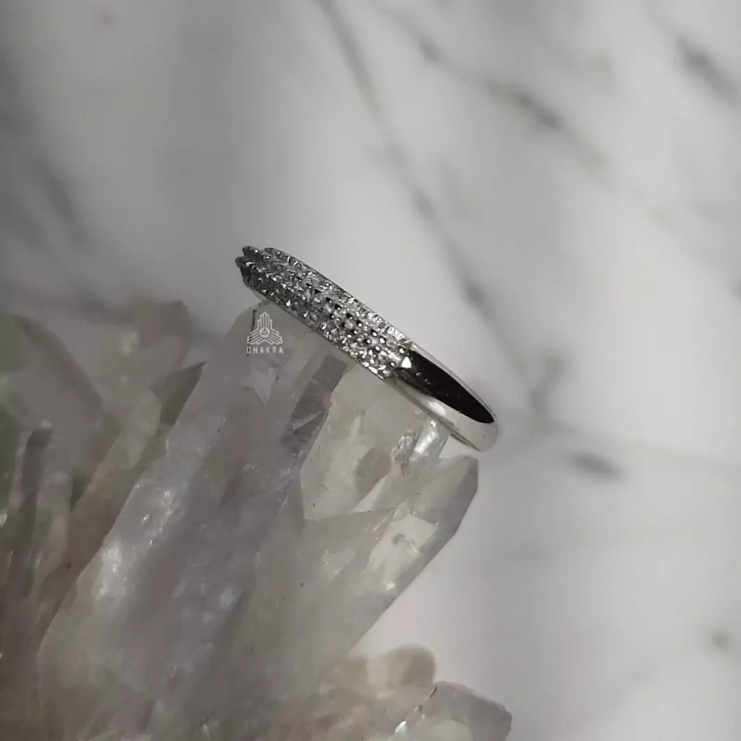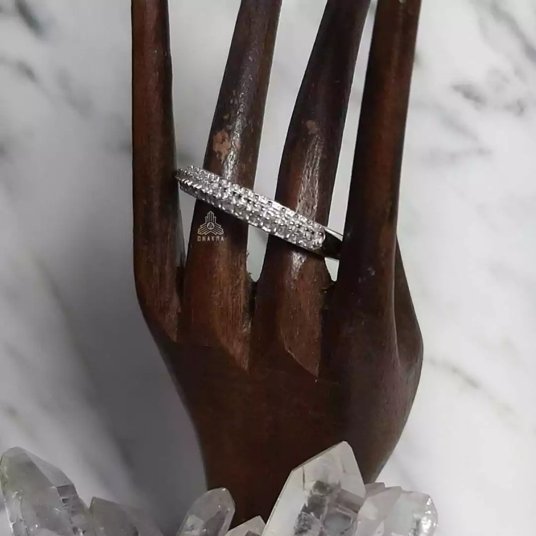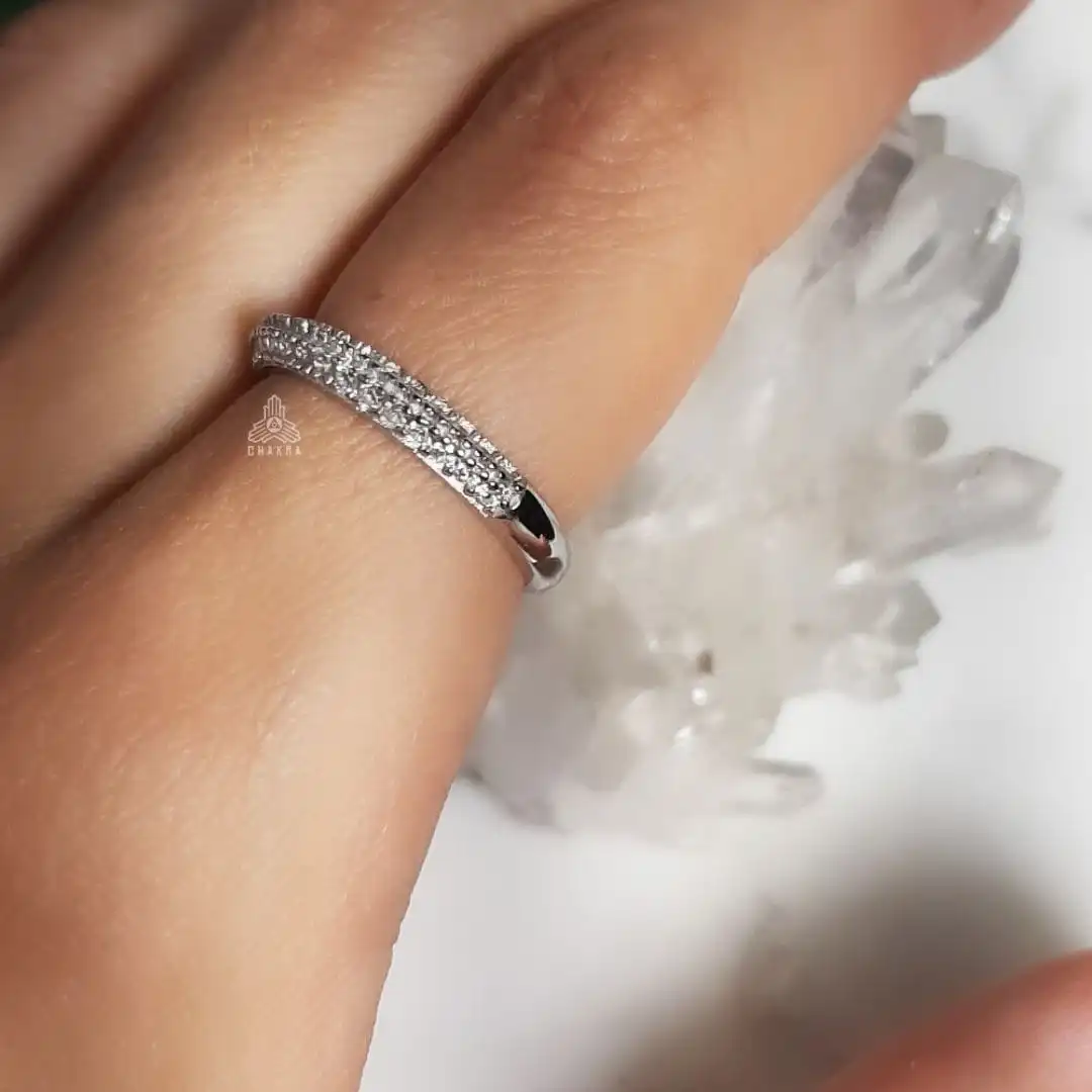 Anel de prata 925, também conhecida como prata de lei, modelo abaulado com duas fileiras de zircônias incompletas