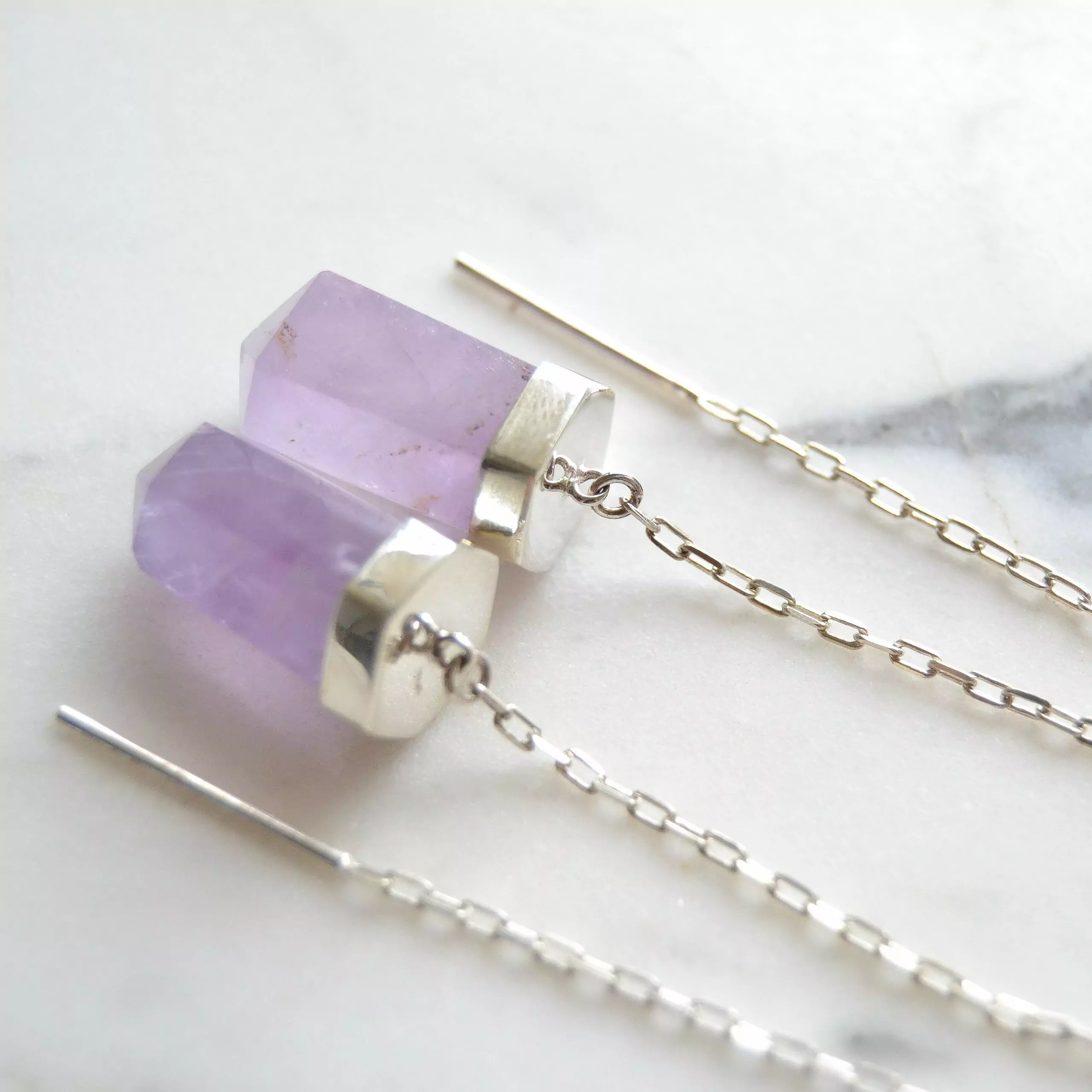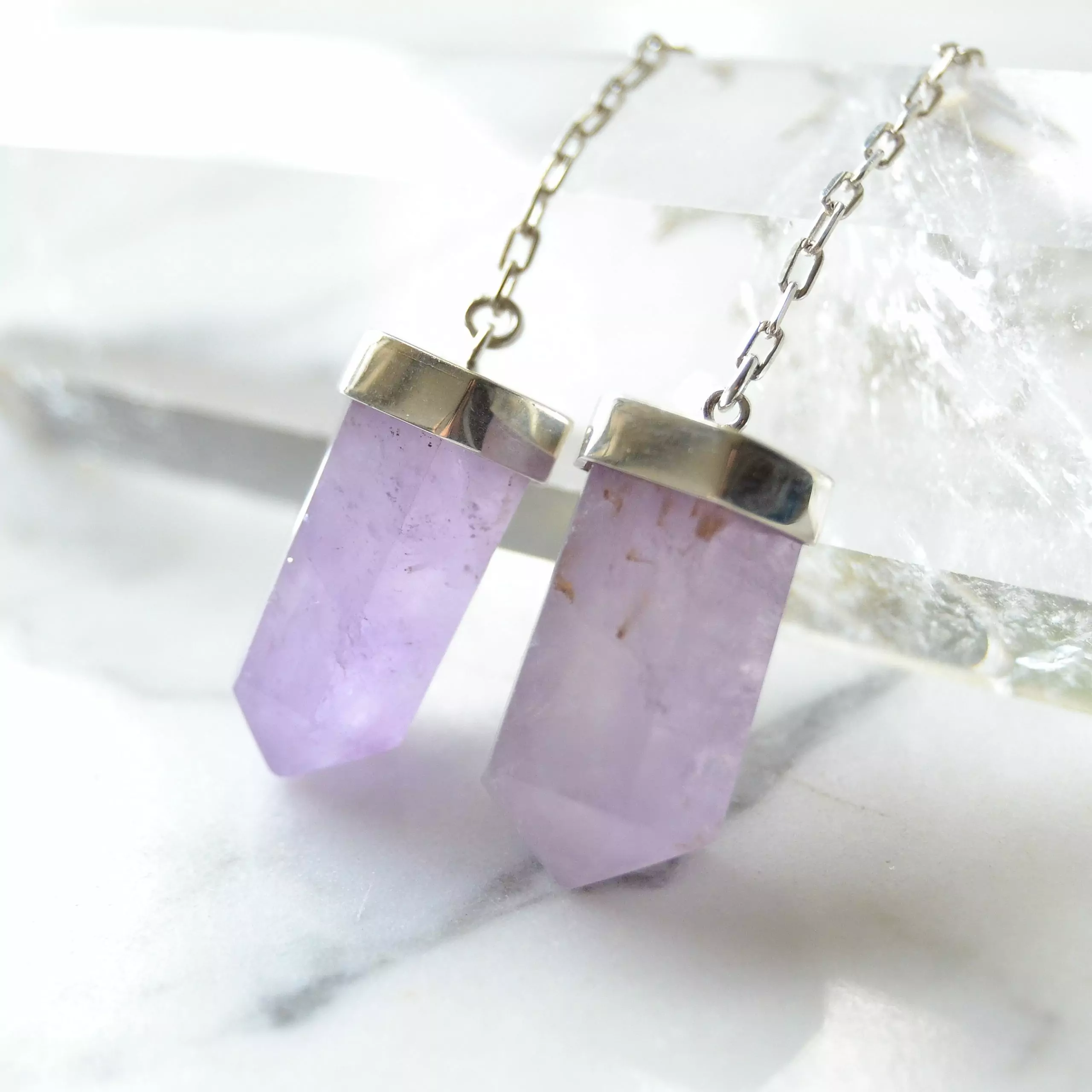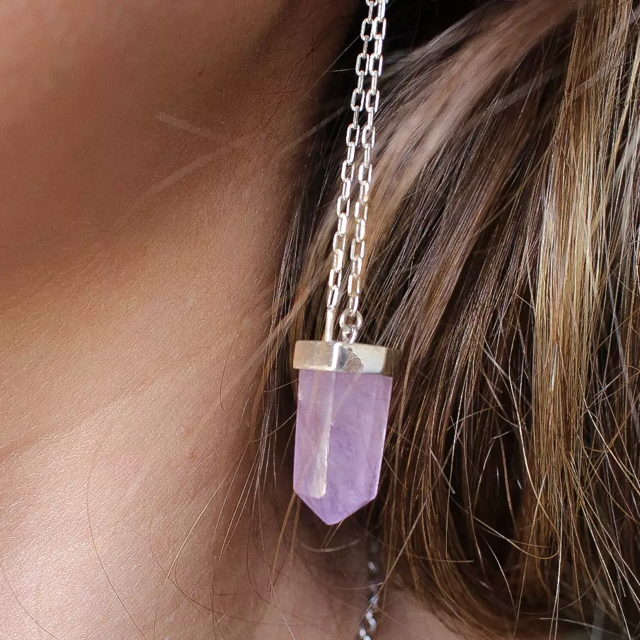 Brinco de prata 925, também conhecida como prata de lei, da linha Chakra AUTORAL, modelo pêndulo clássico com um cristal de ametista natural preso em uma correntinha elos cartier
