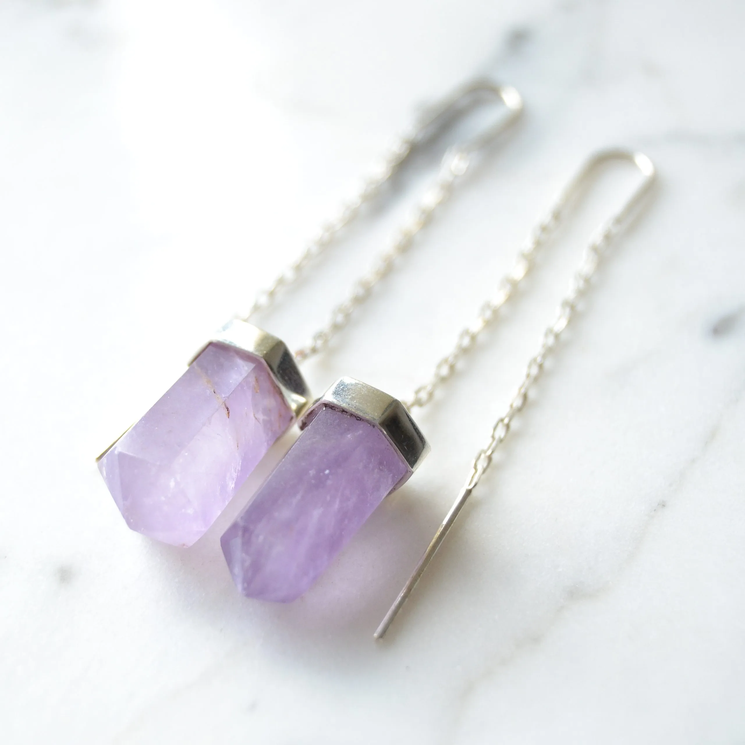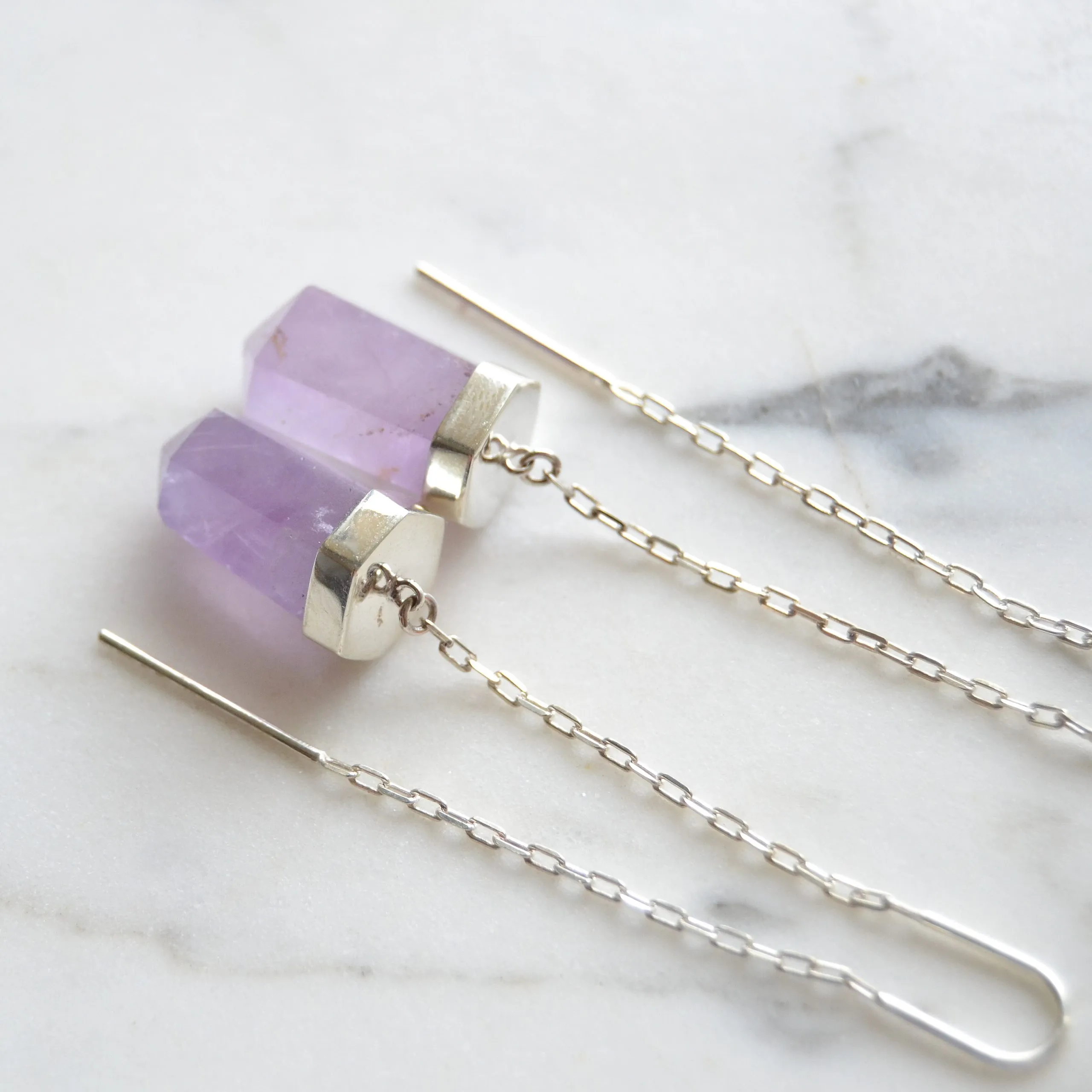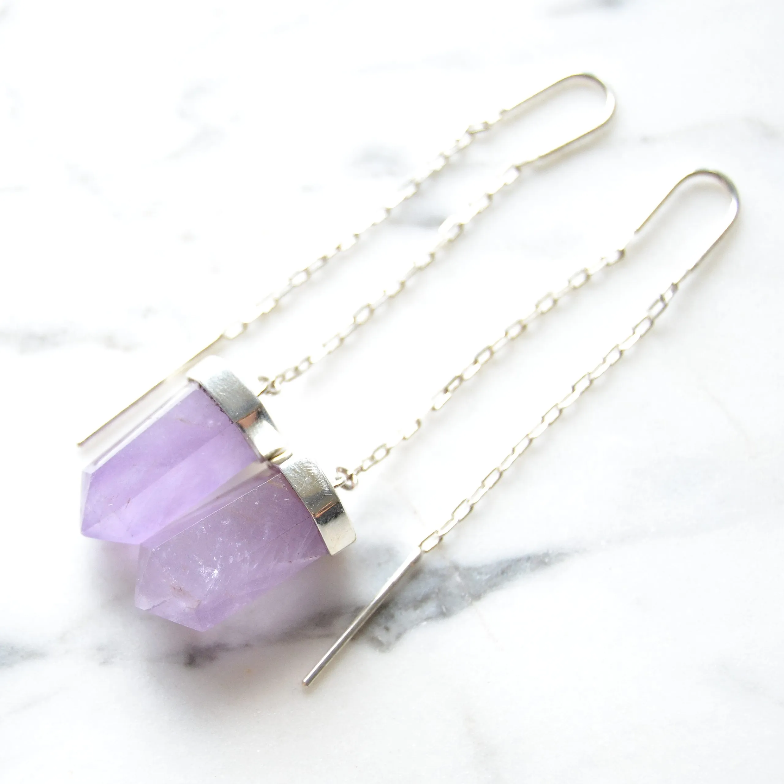Brinco de prata 925, também conhecida como prata de lei, da linha Chakra AUTORAL, modelo pêndulo clássico com um cristal de ametista natural preso em uma correntinha elos cartier