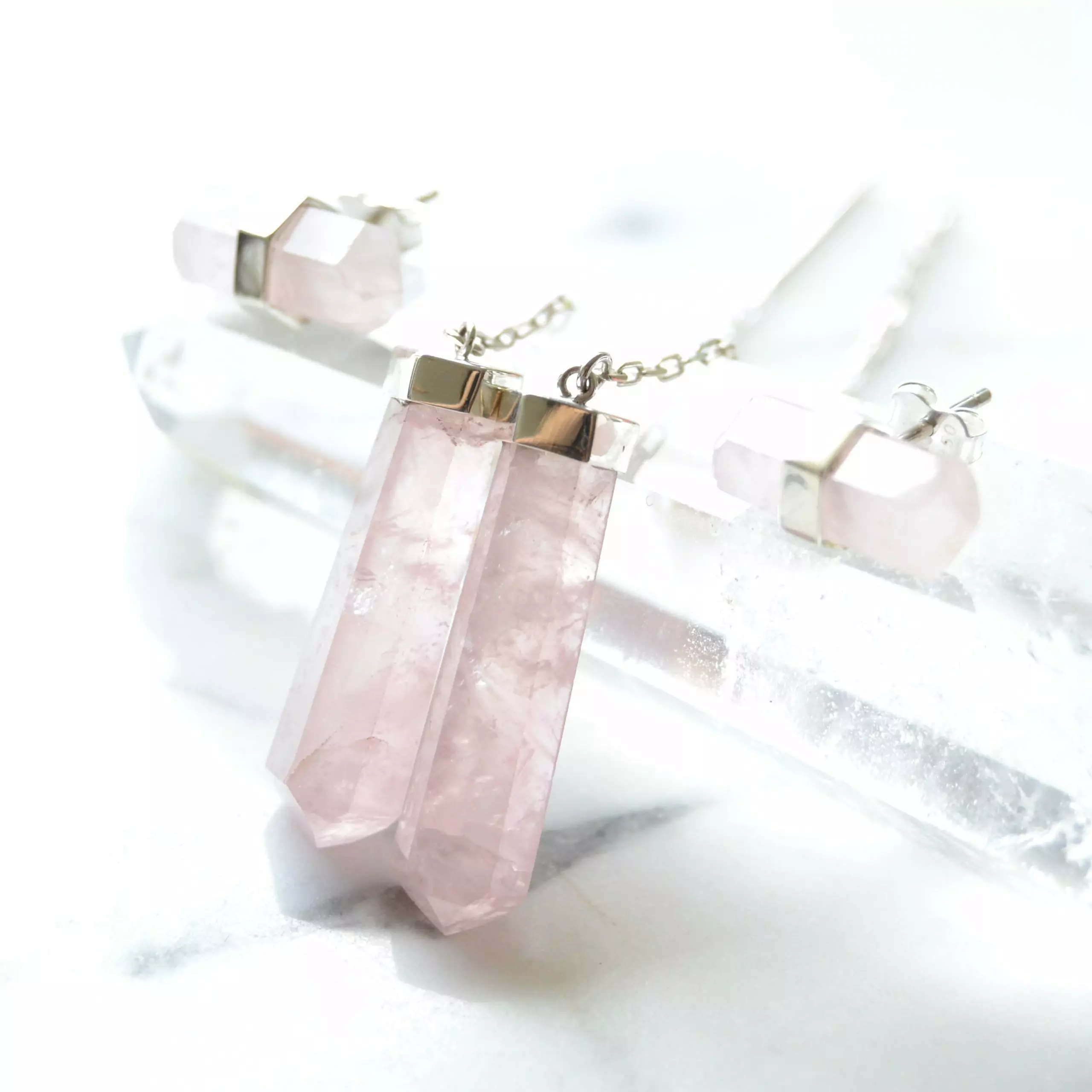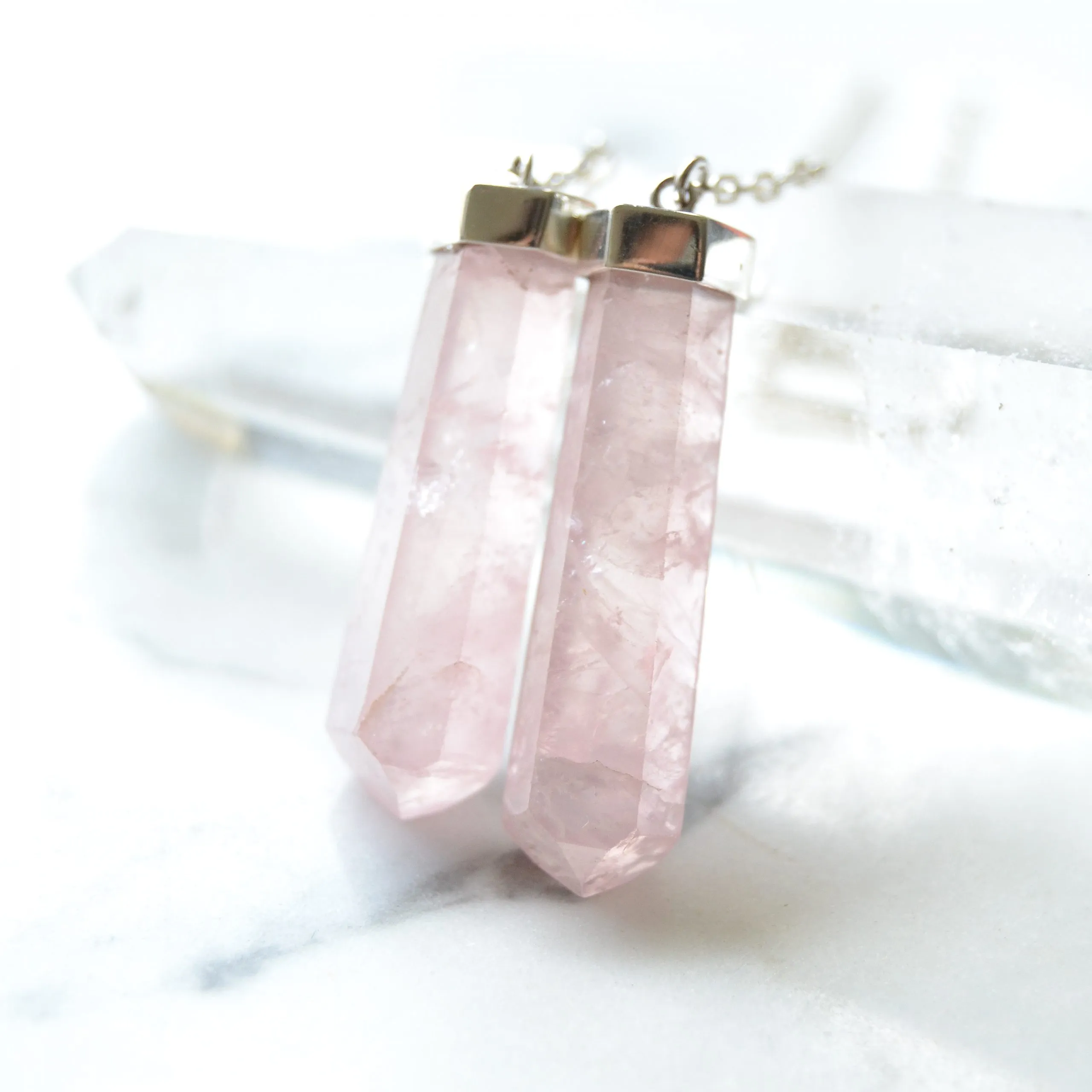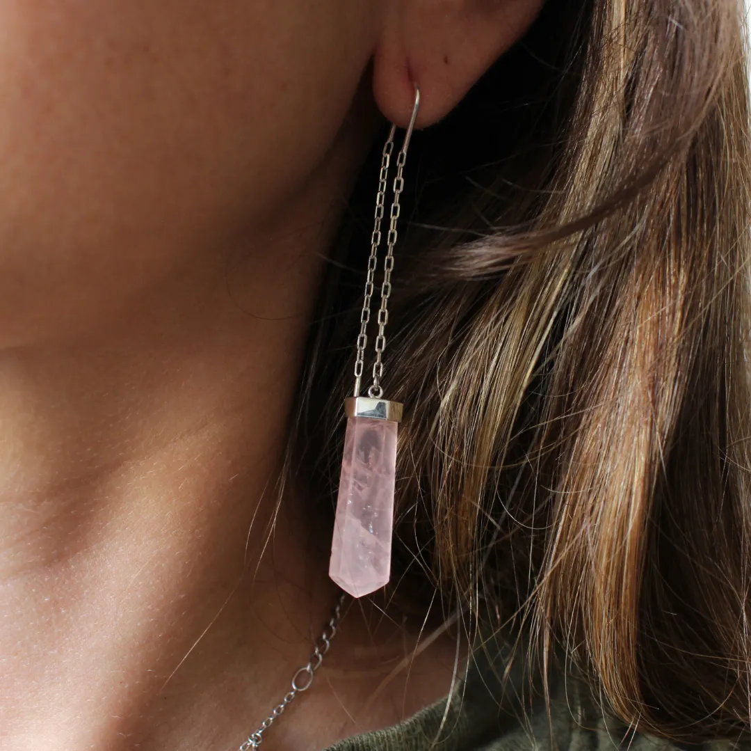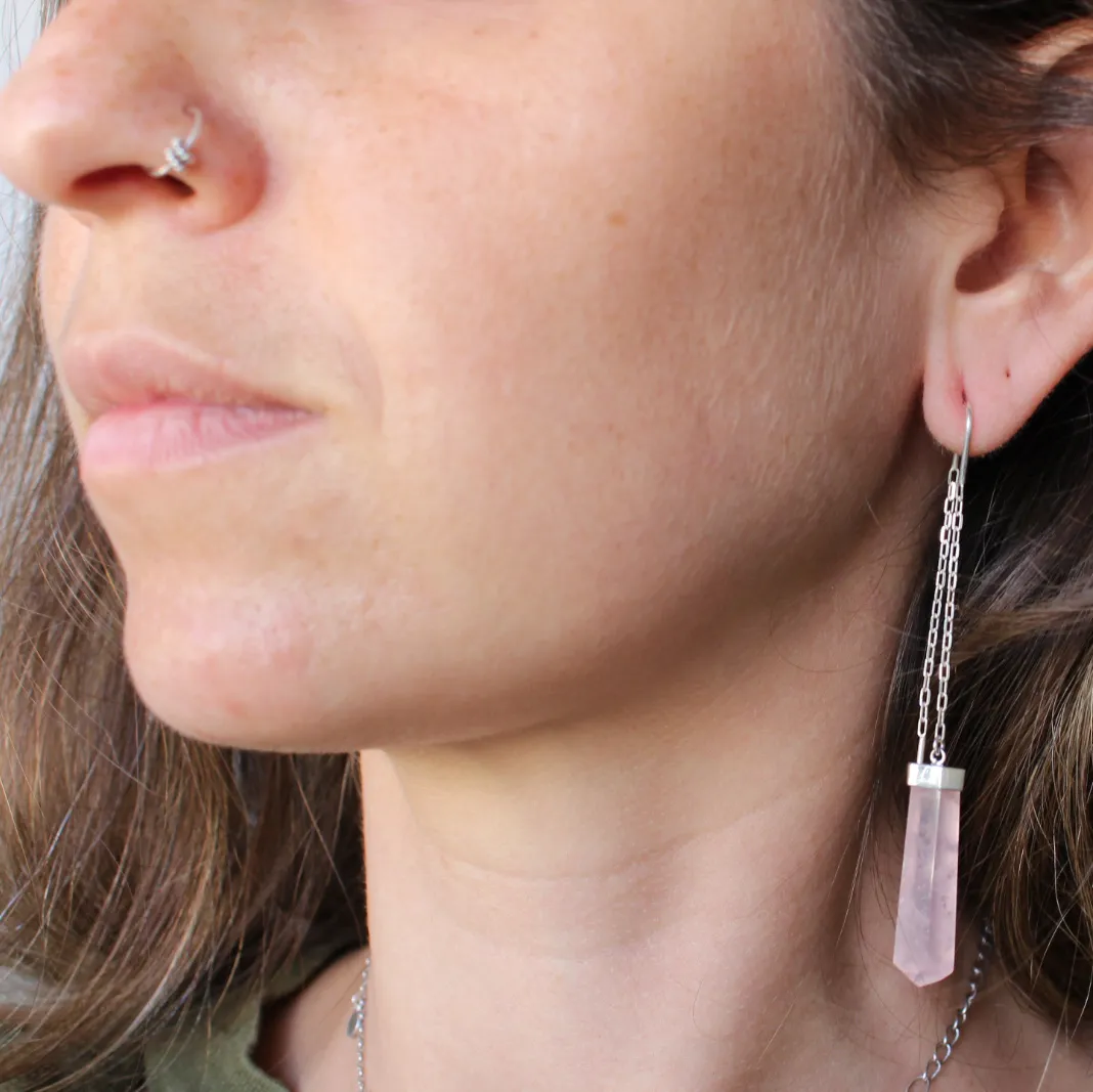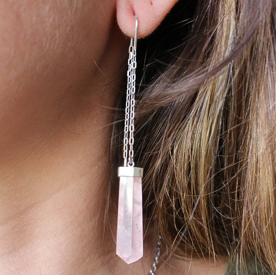 Brinco de prata 925, também conhecida como prata de lei, da linha Chakra AUTORAL, modelo pêndulo clássico com um cristal de quartzo rosa natural preso em uma correntinha elos cartier