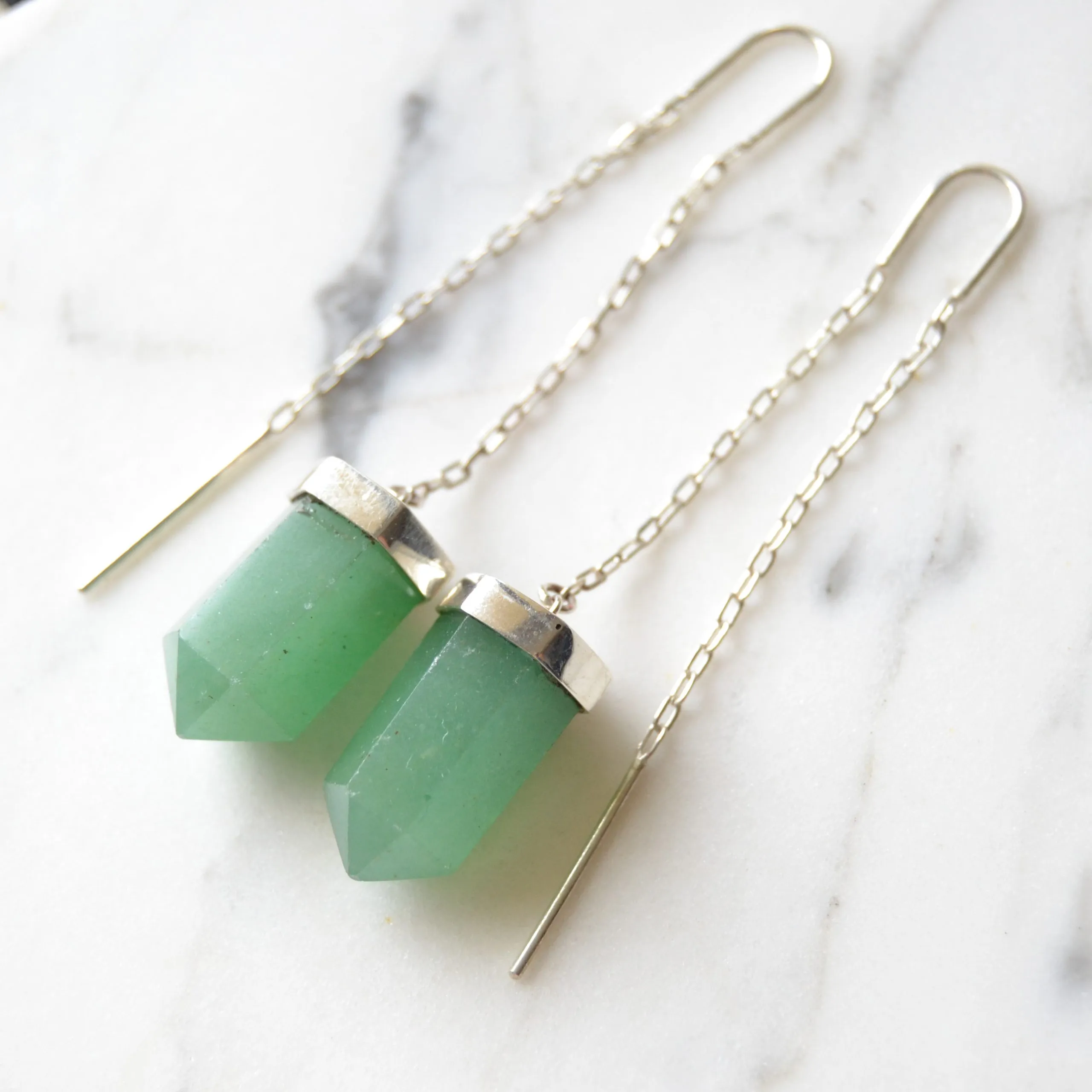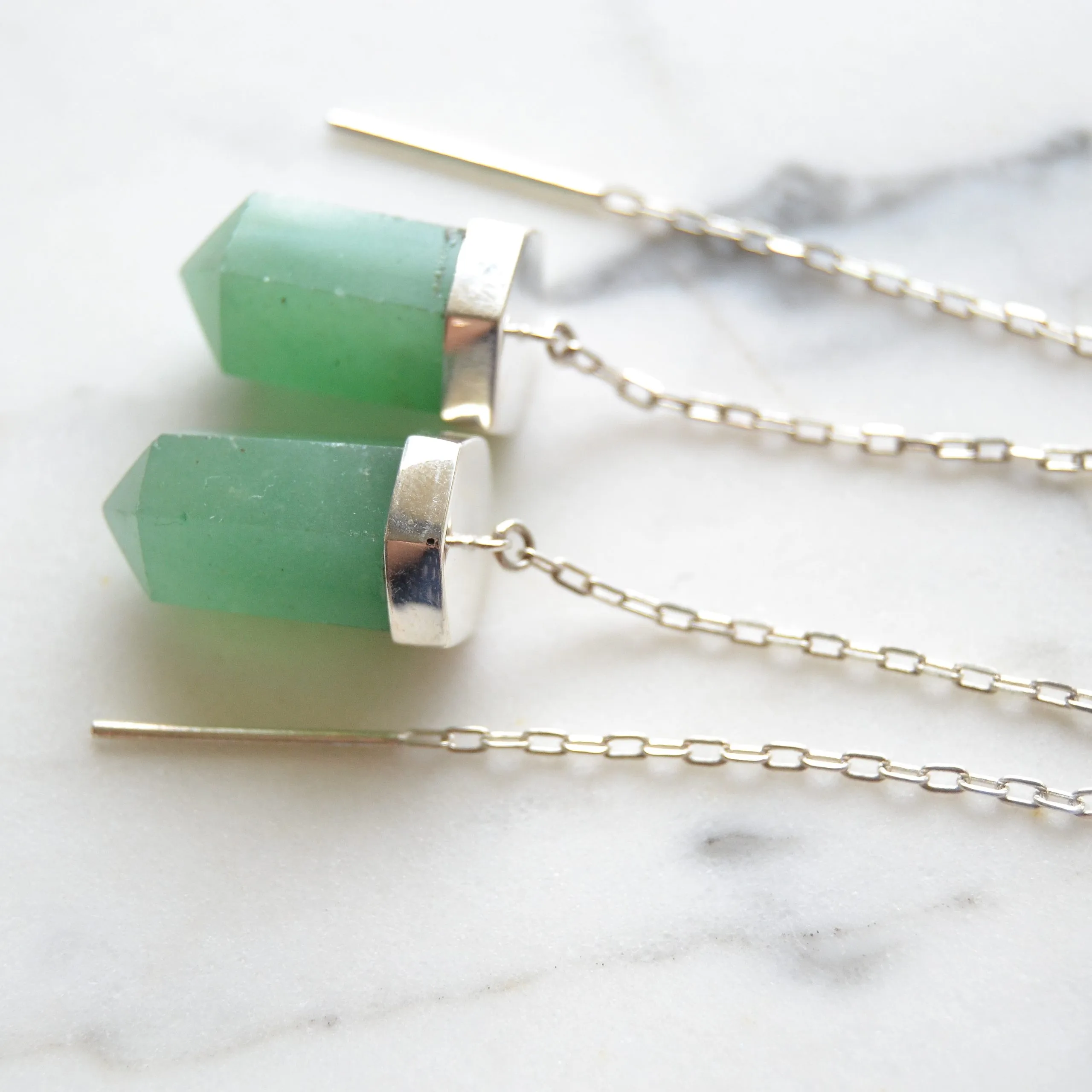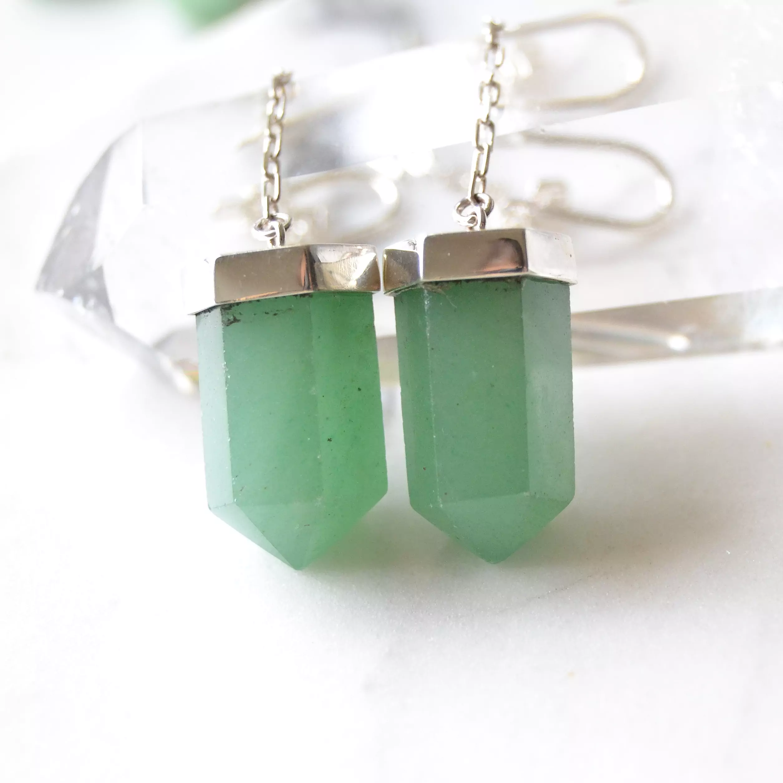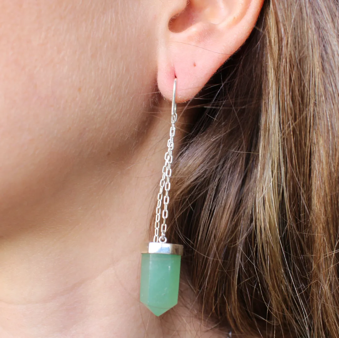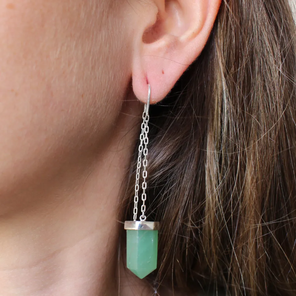 Brinco de prata 925, também conhecida como prata de lei, da linha Chakra AUTORAL, modelo pêndulo clássico com um cristal de quartzo verde natural preso em uma correntinha elos cartier