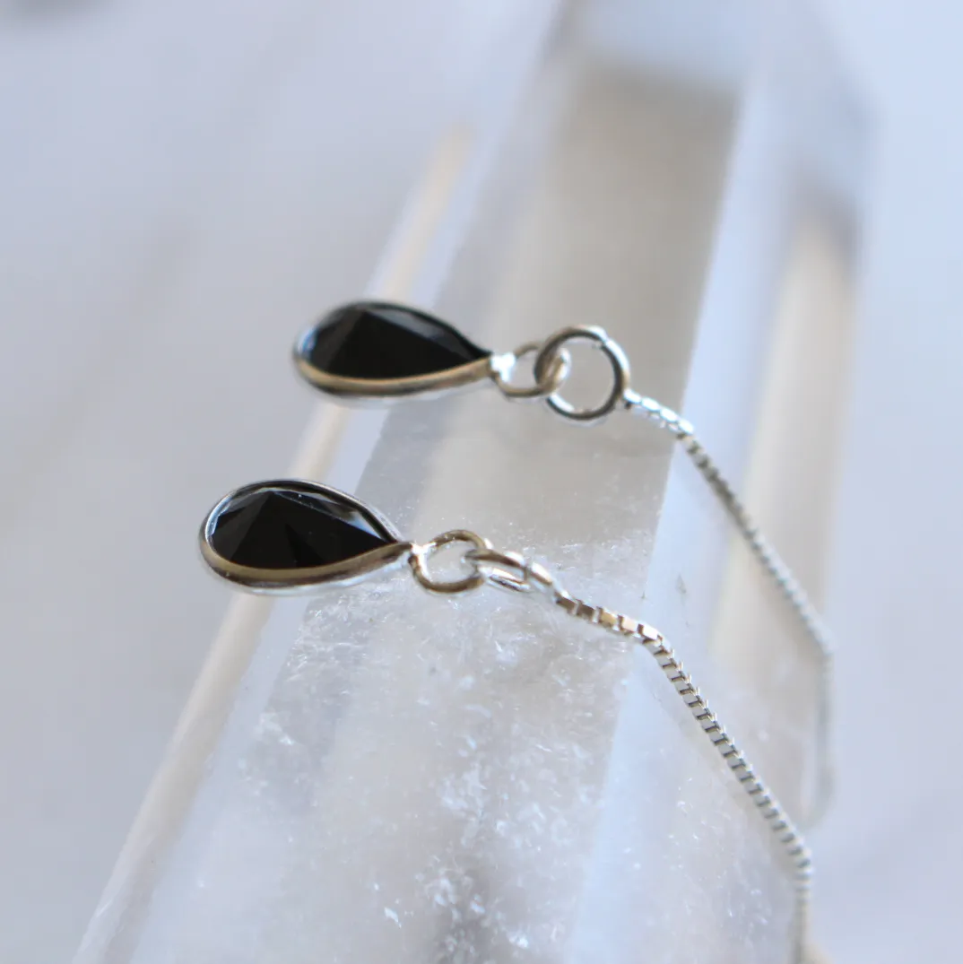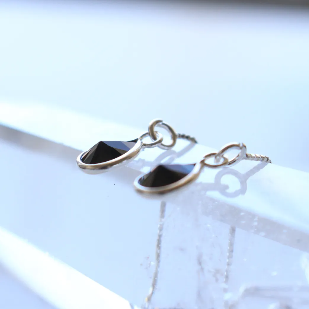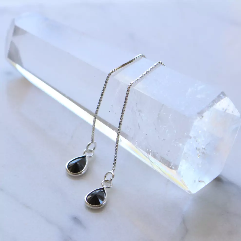 Brinco de prata 925, também conhecida como prata de lei, modelo pêndulo com uma gotinha de zircônia negra com lapidação facetada