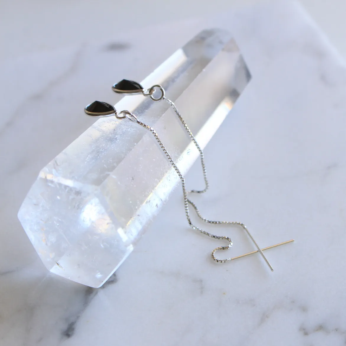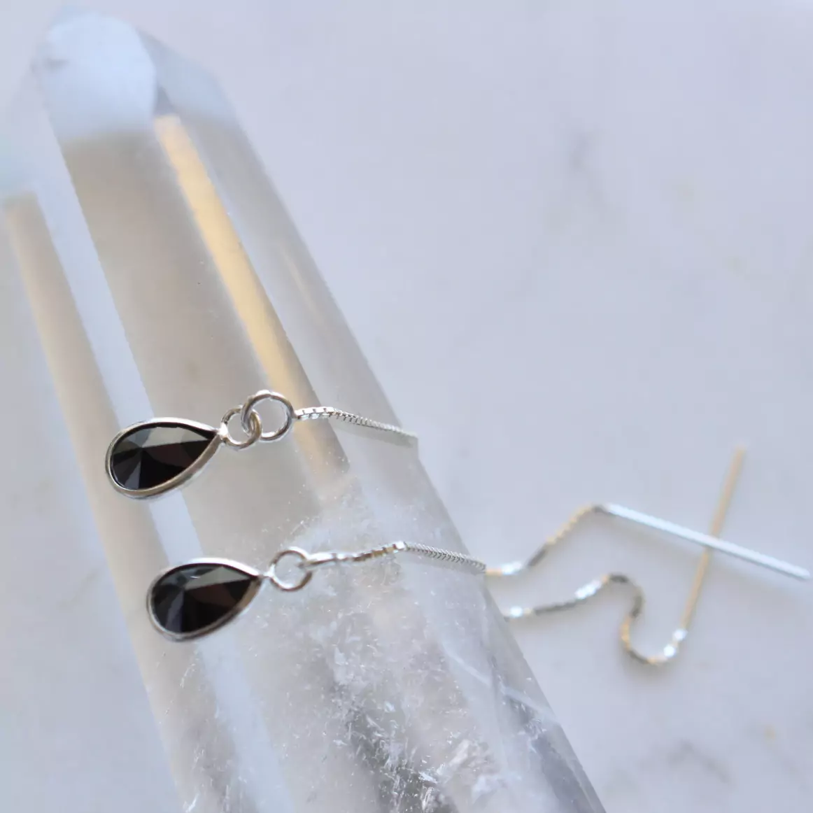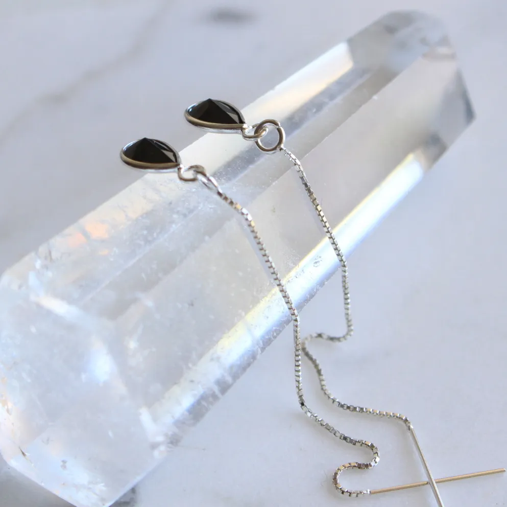 Brinco de prata 925, também conhecida como prata de lei, modelo pêndulo com uma gotinha de zircônia negra com lapidação facetada