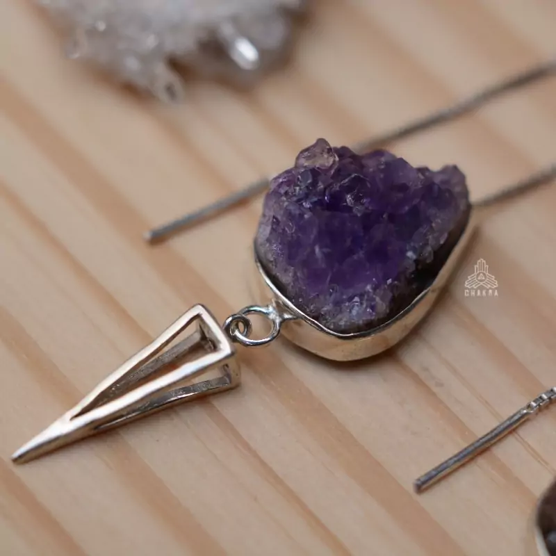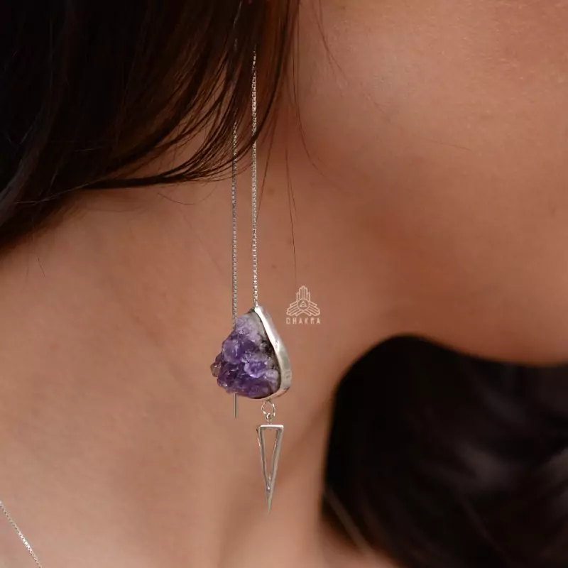 Brinco de prata 925, também conhecida como prata de lei, da linha CHAKRA AUTORAL modelo pêndulo com uma gota de drusa de ametista e um prisma vazado