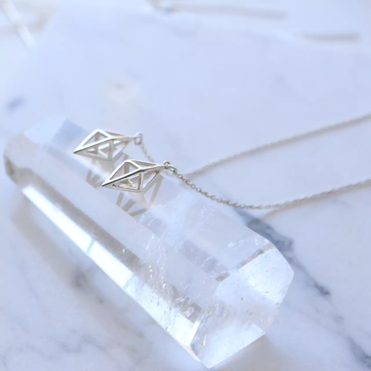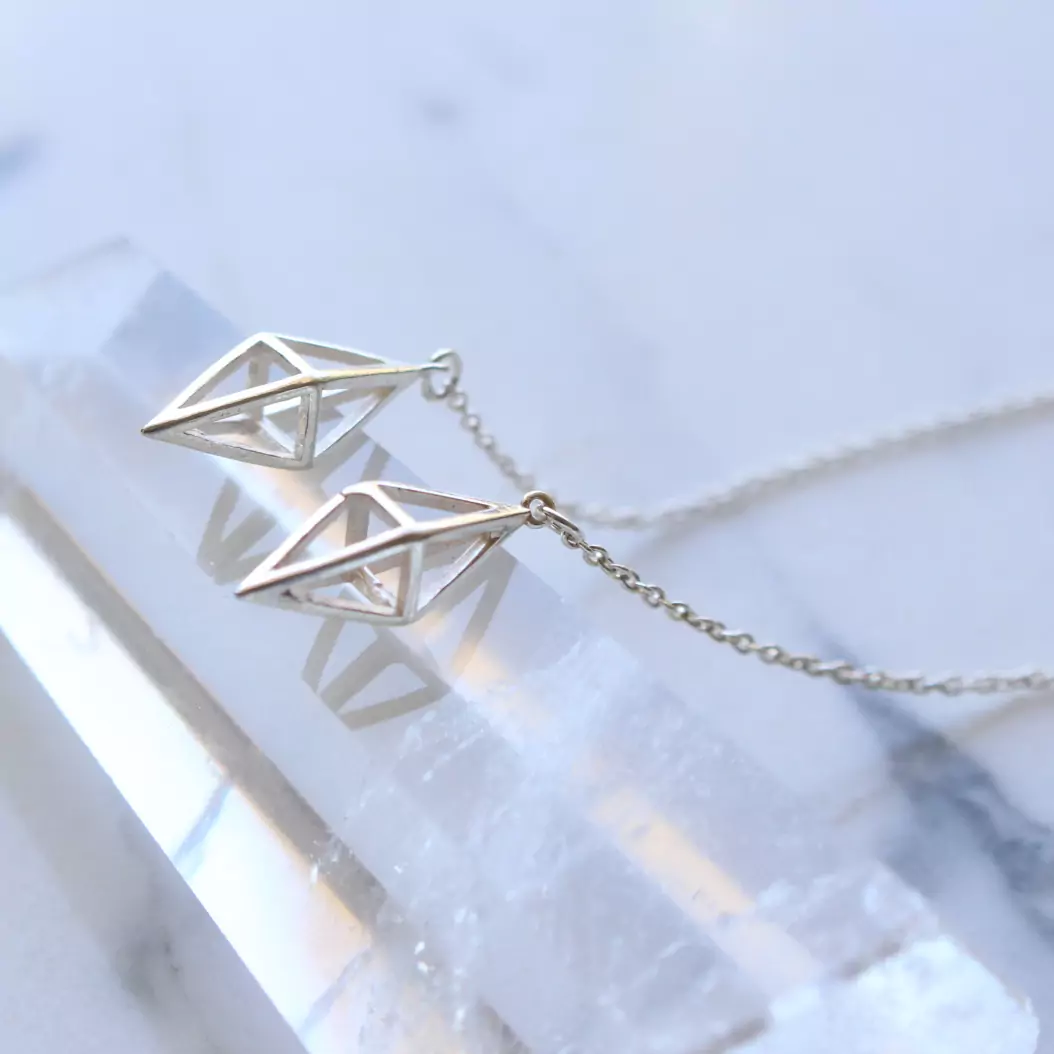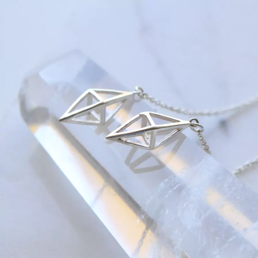 Brinco de prata 925, também conhecida como prata de lei, modelo pêndulo com prisma losango vazado e correntinha elo português