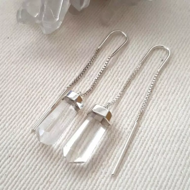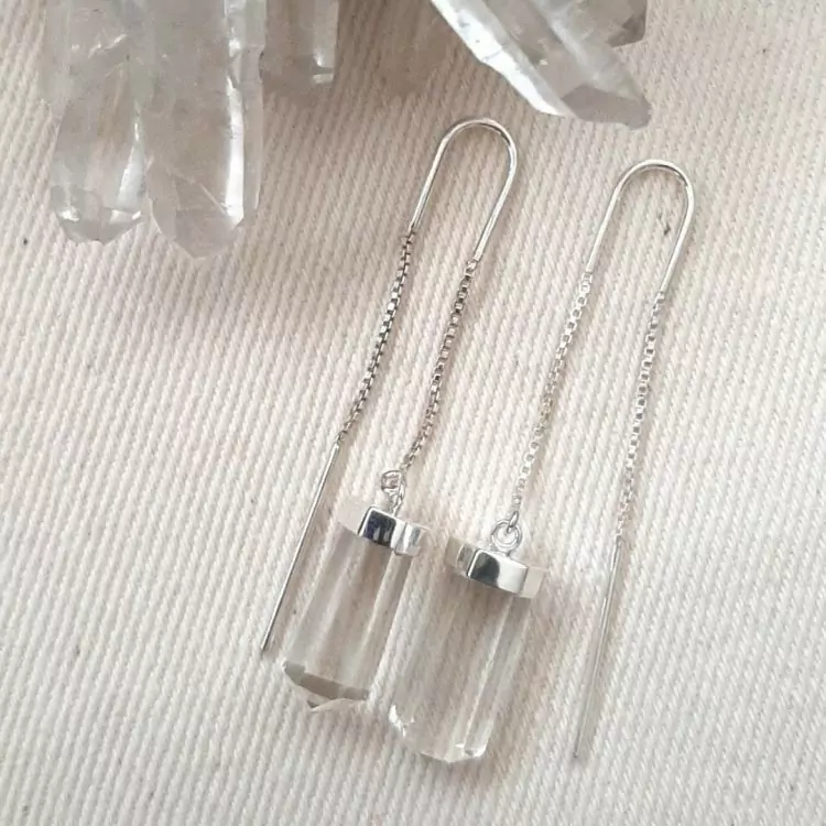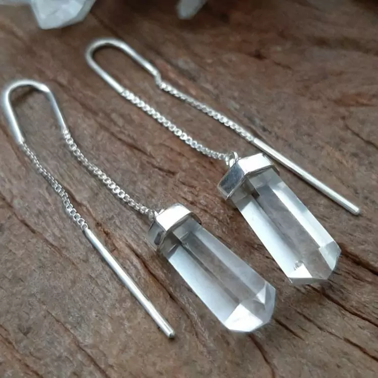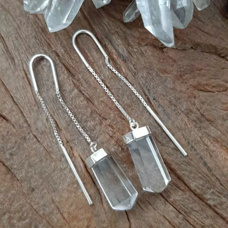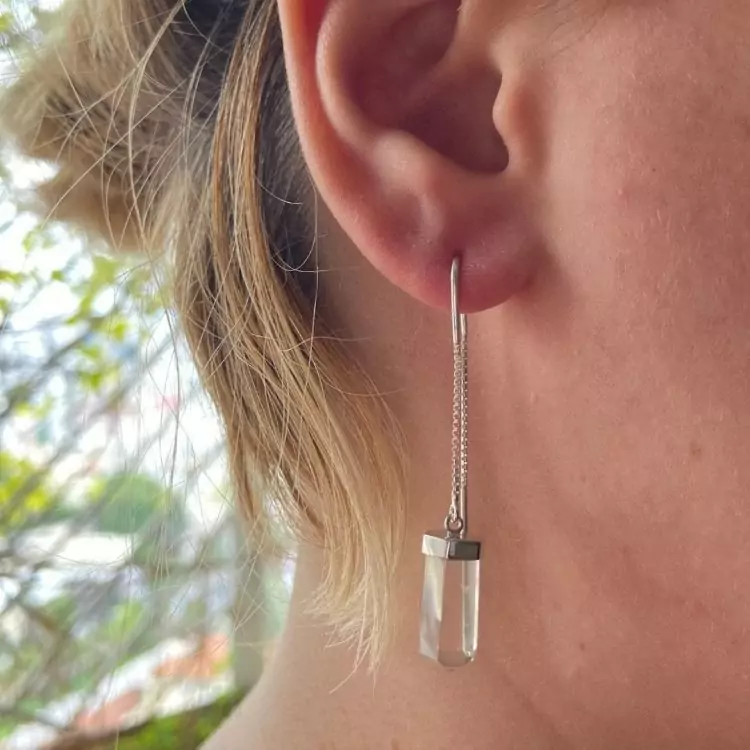 Brinco de prata 925, também conhecida como prata de lei, da linha Chakra AUTORAL , modelo pêndulo clássico com cristal de quartzo transparente natural preso a uma correntinha tipo veneziana