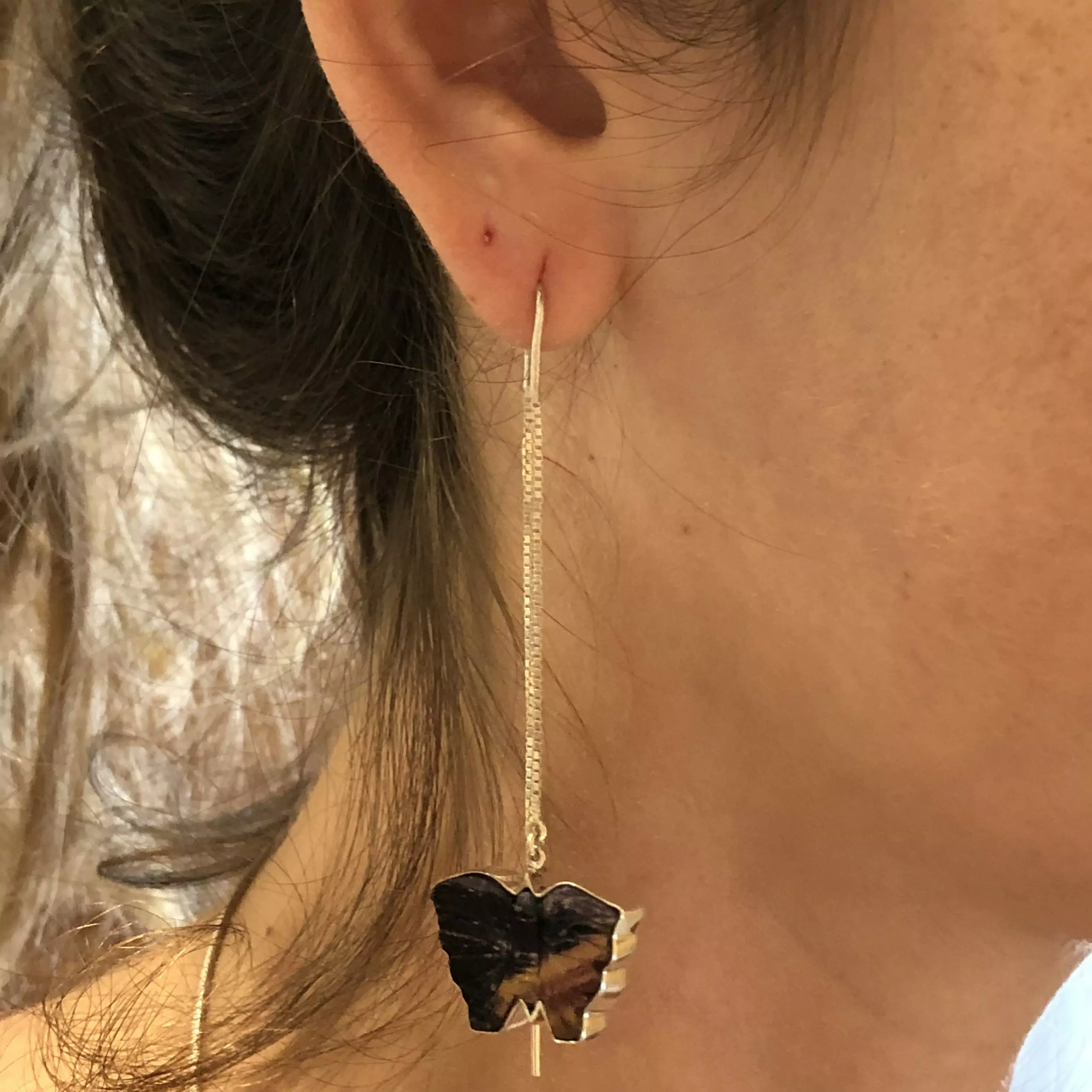 Brinco de prata 925, também conhecida como prata de lei, da linha Chakra AUTORAL, modelo pêndulo com uma borboleta de fluorita entalhada a mão