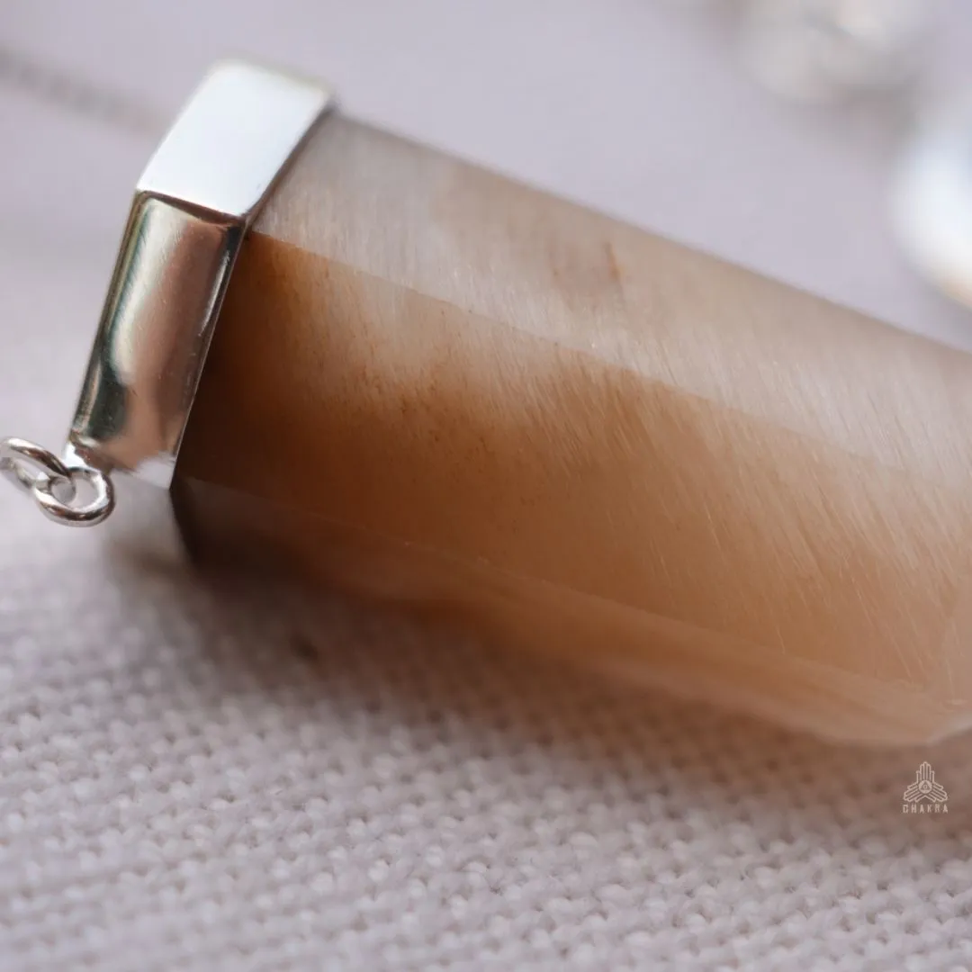 Cristal de quartzo natural com inclusão do mineral rutilo dourado e algumas manchas em vermelho.