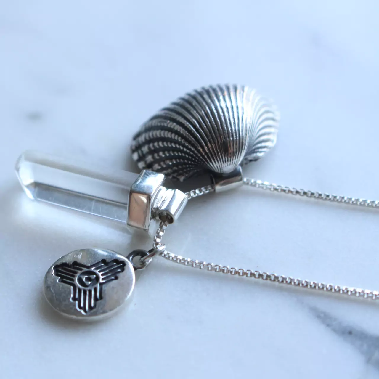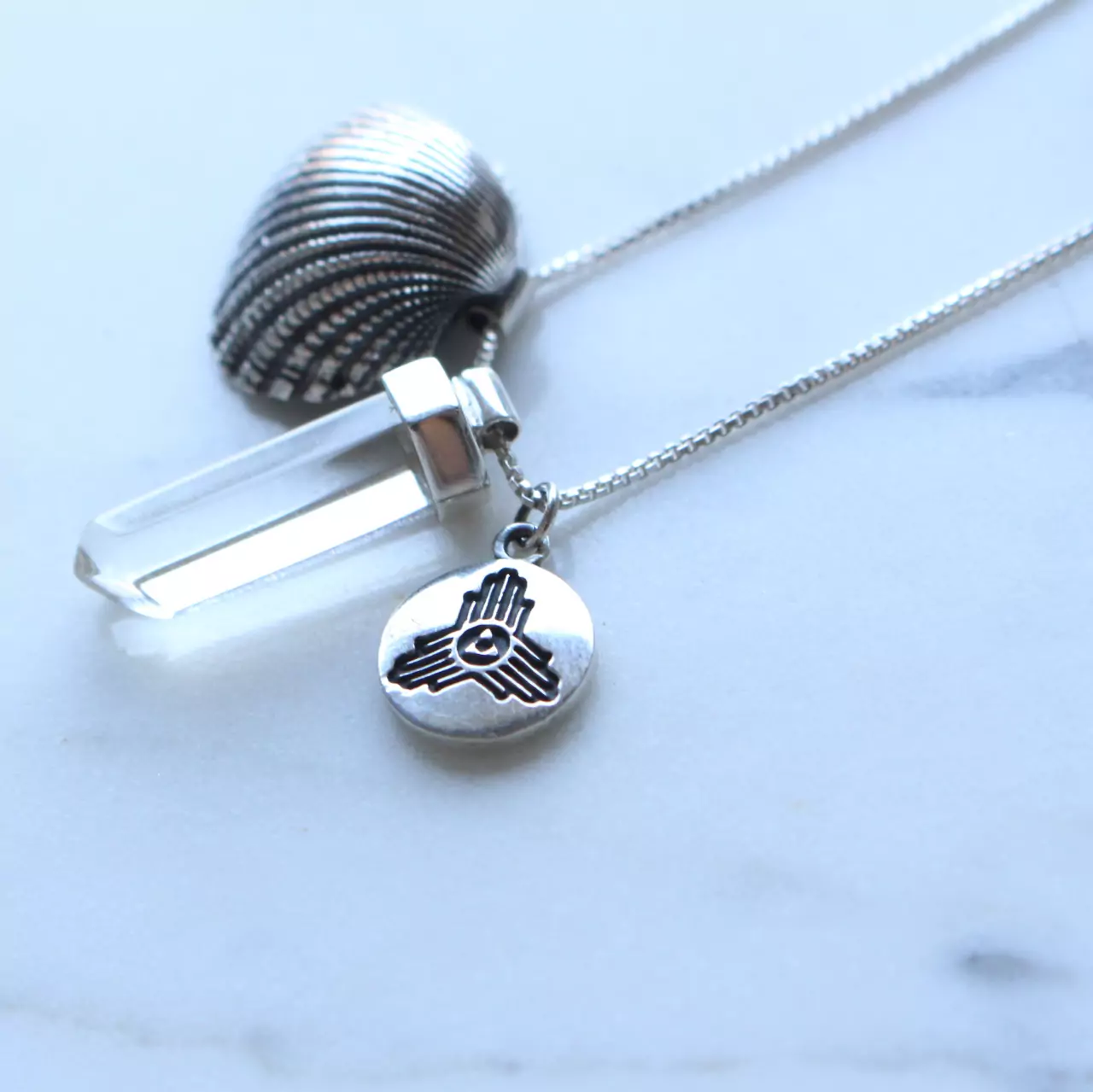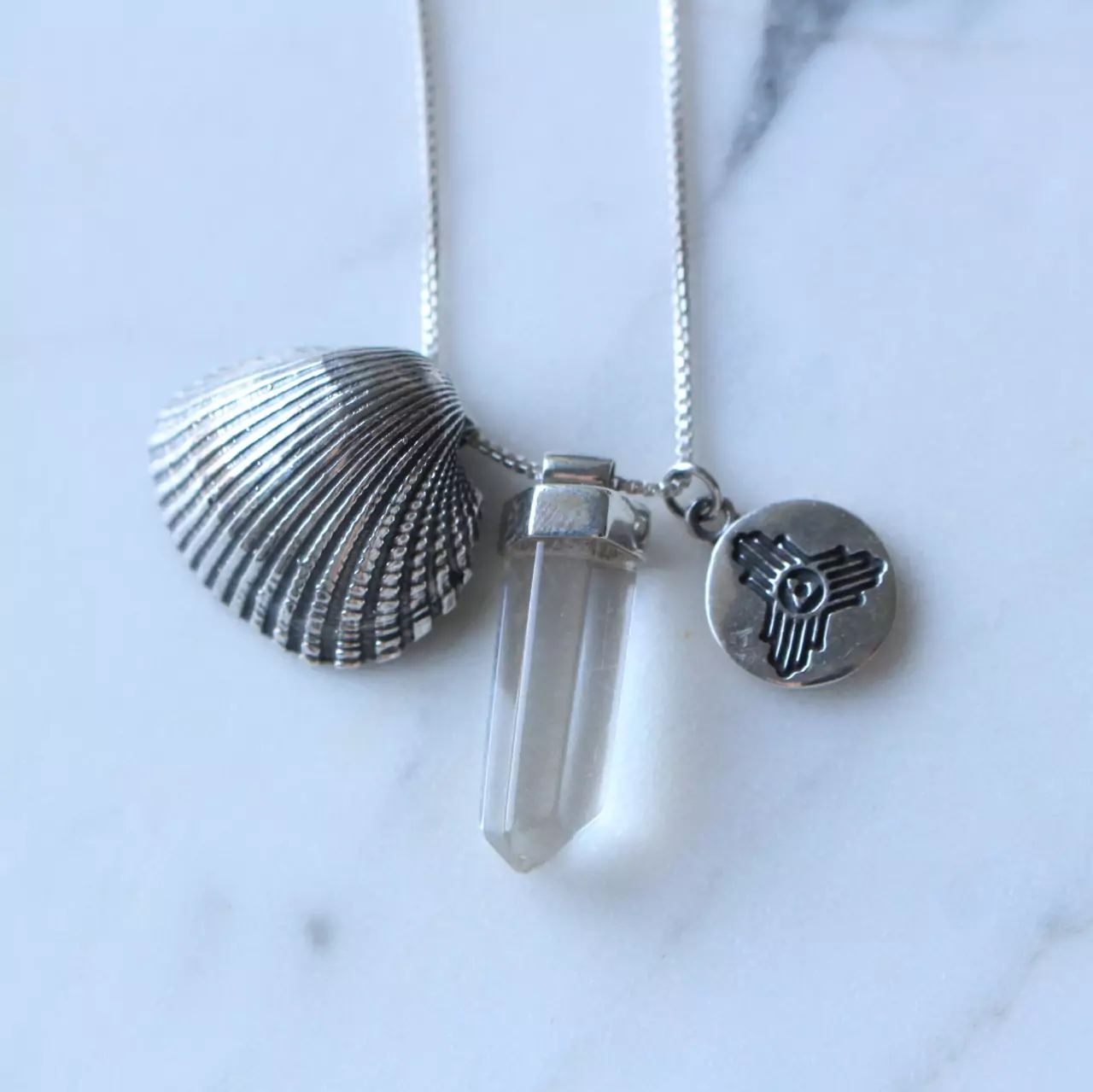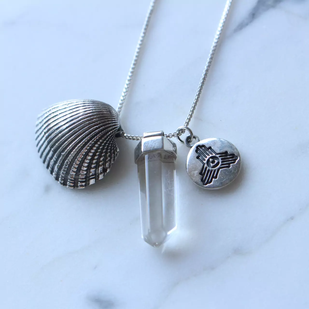 Esse colar tem uma concha e um cristal de quartzo transparente natural, em uma correntinha tipo veneziana de 70 cm.