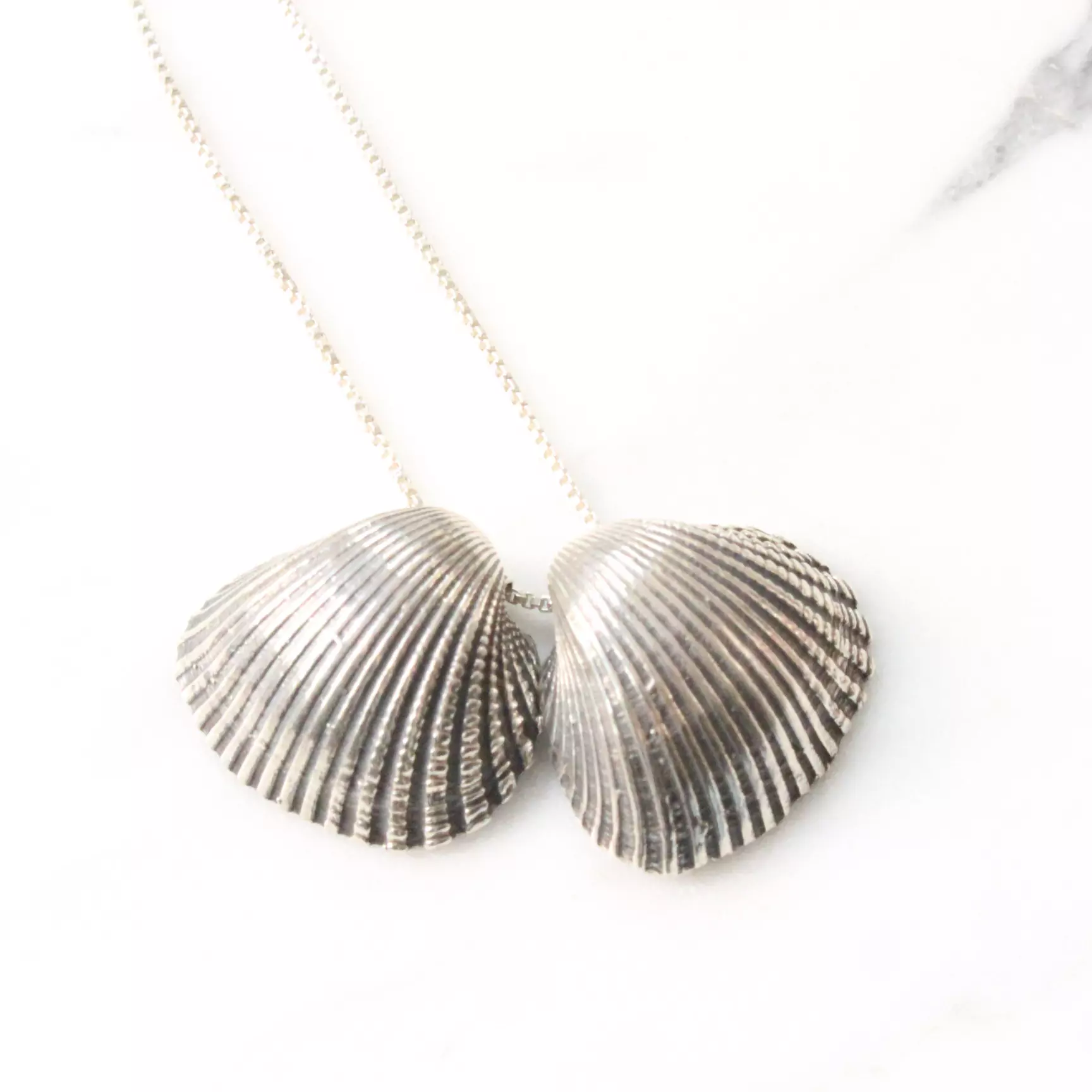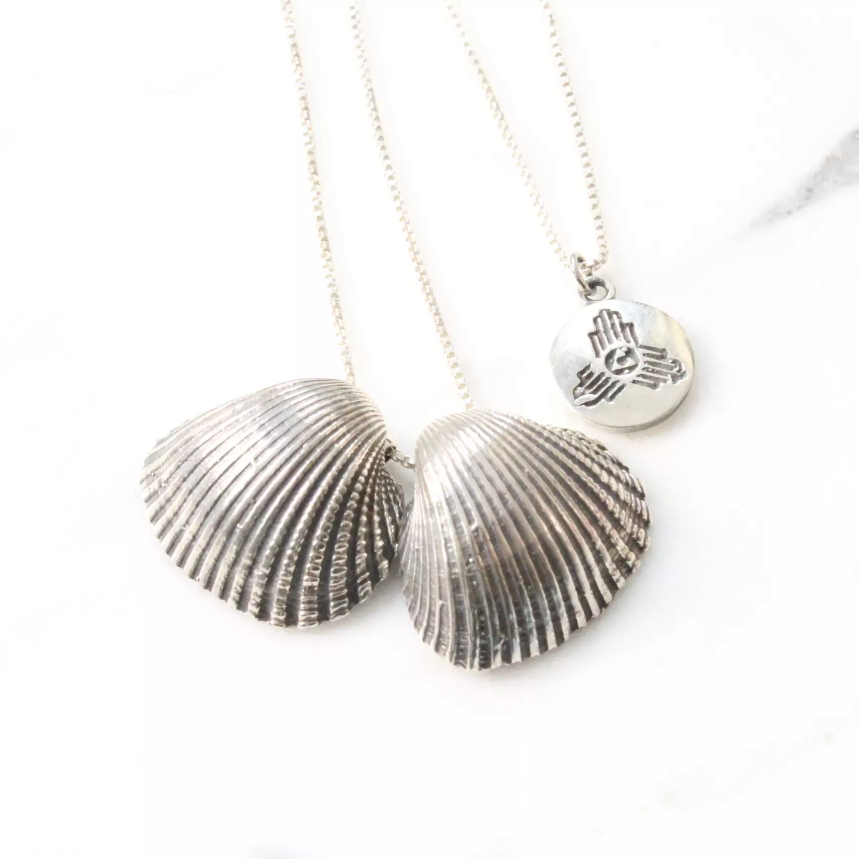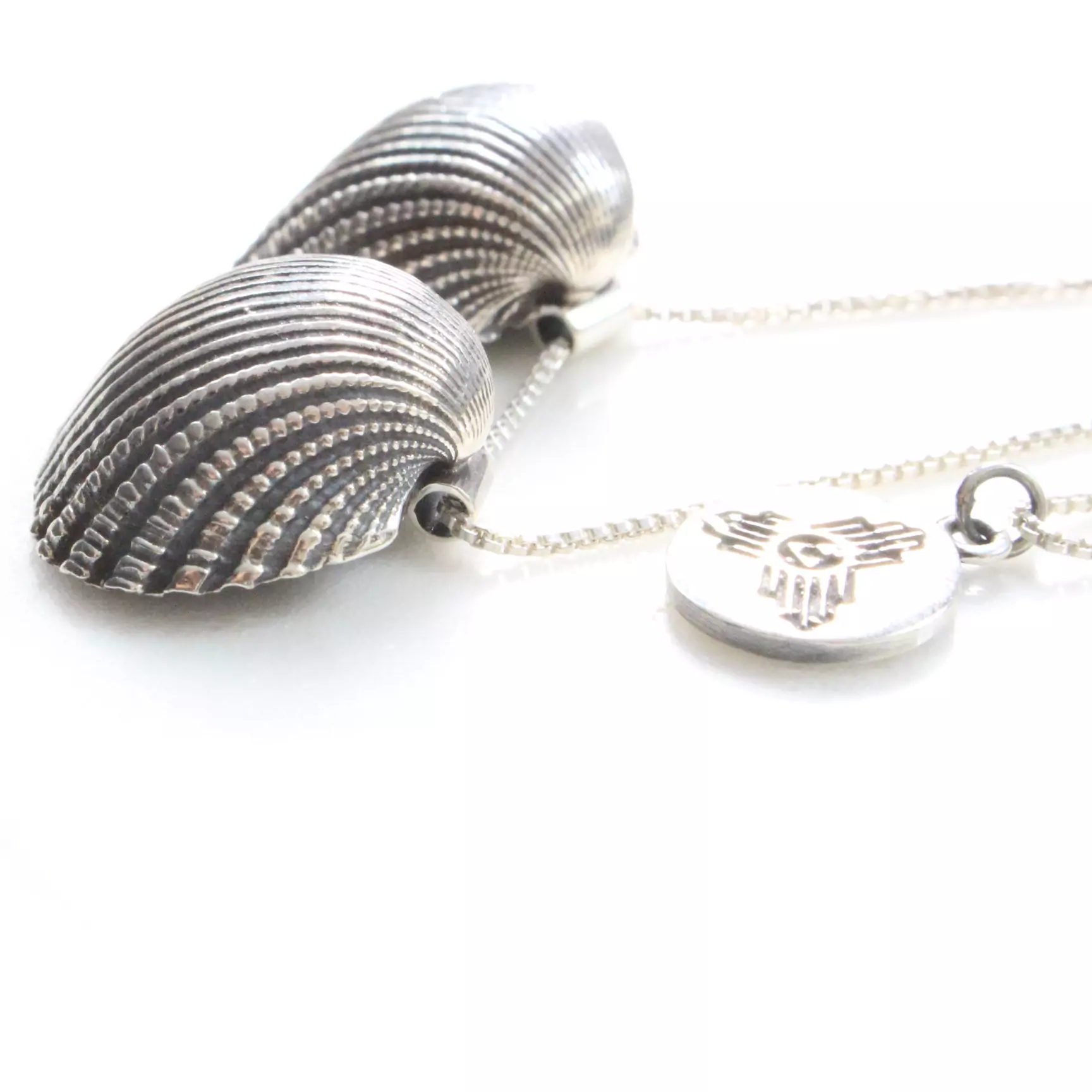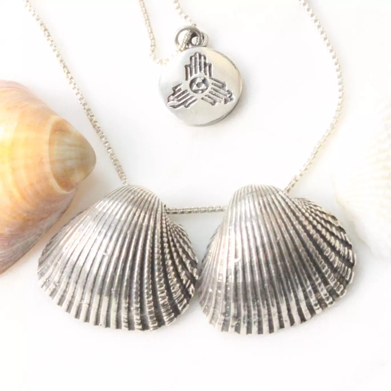 Esse colar tem duas conchas e uma medalha da CHAKRA em uma correntinha tipo veneziana de 70 cm.