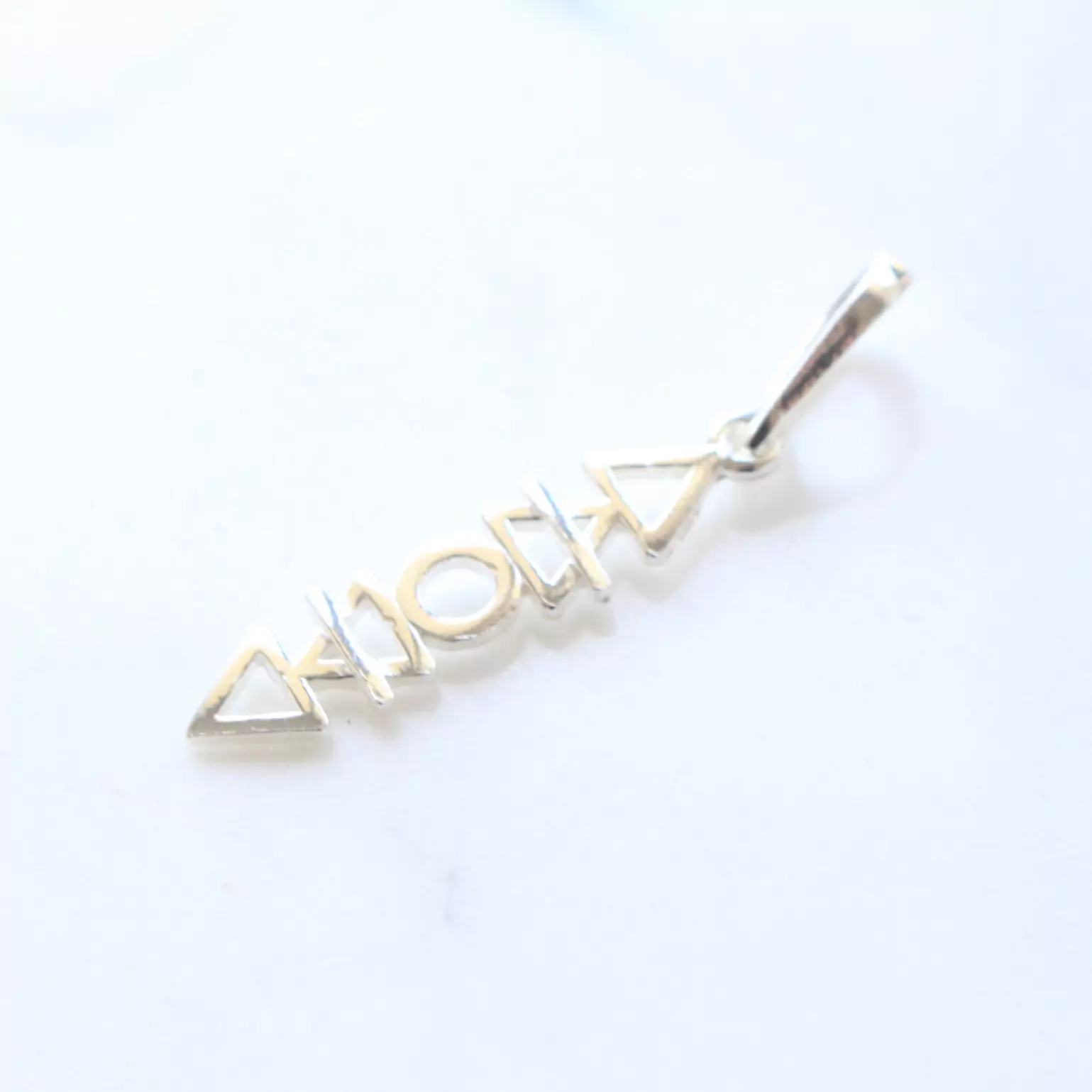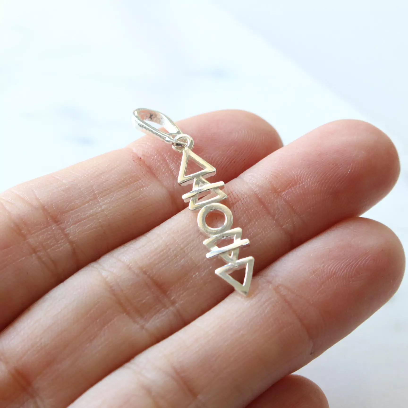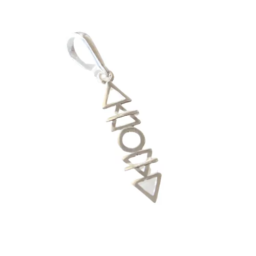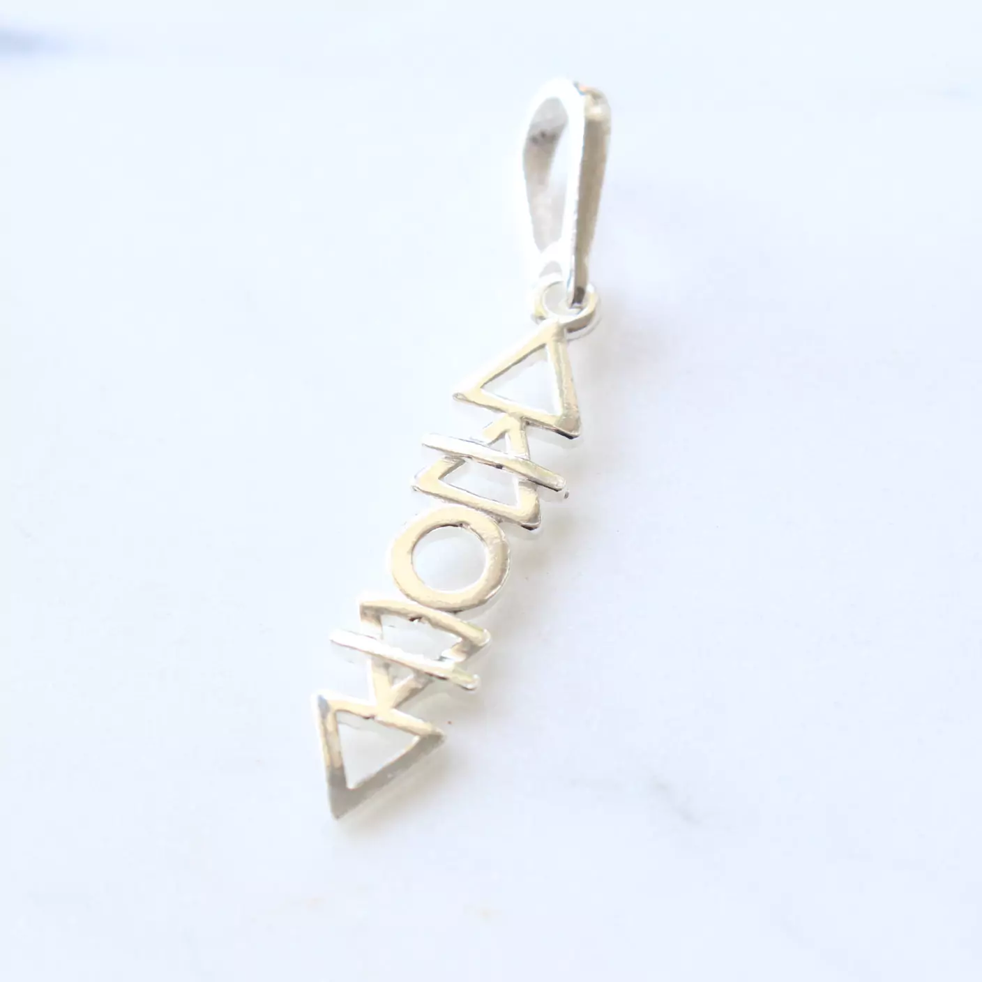 Pingente de prata 925, também conhecida como prata de lei, com triângulos vazados representando os elementos água, terra, fogo e ar