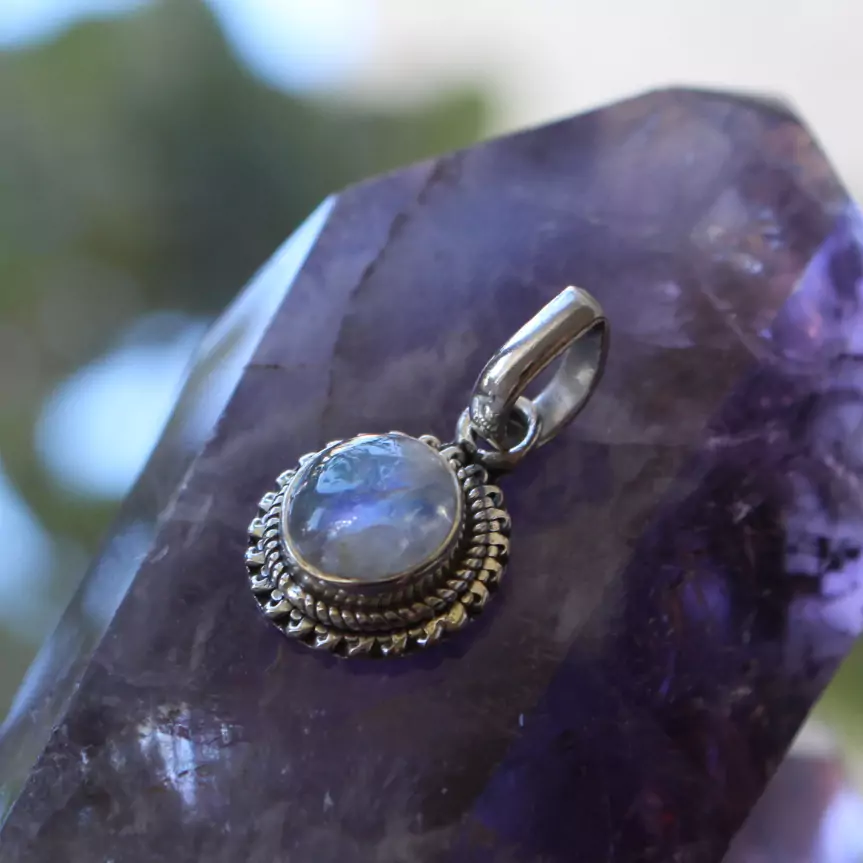 Pingente de prata 925, também conhecida como prata de lei, com uma bolinha de pedra da lua natural com moldura trançada