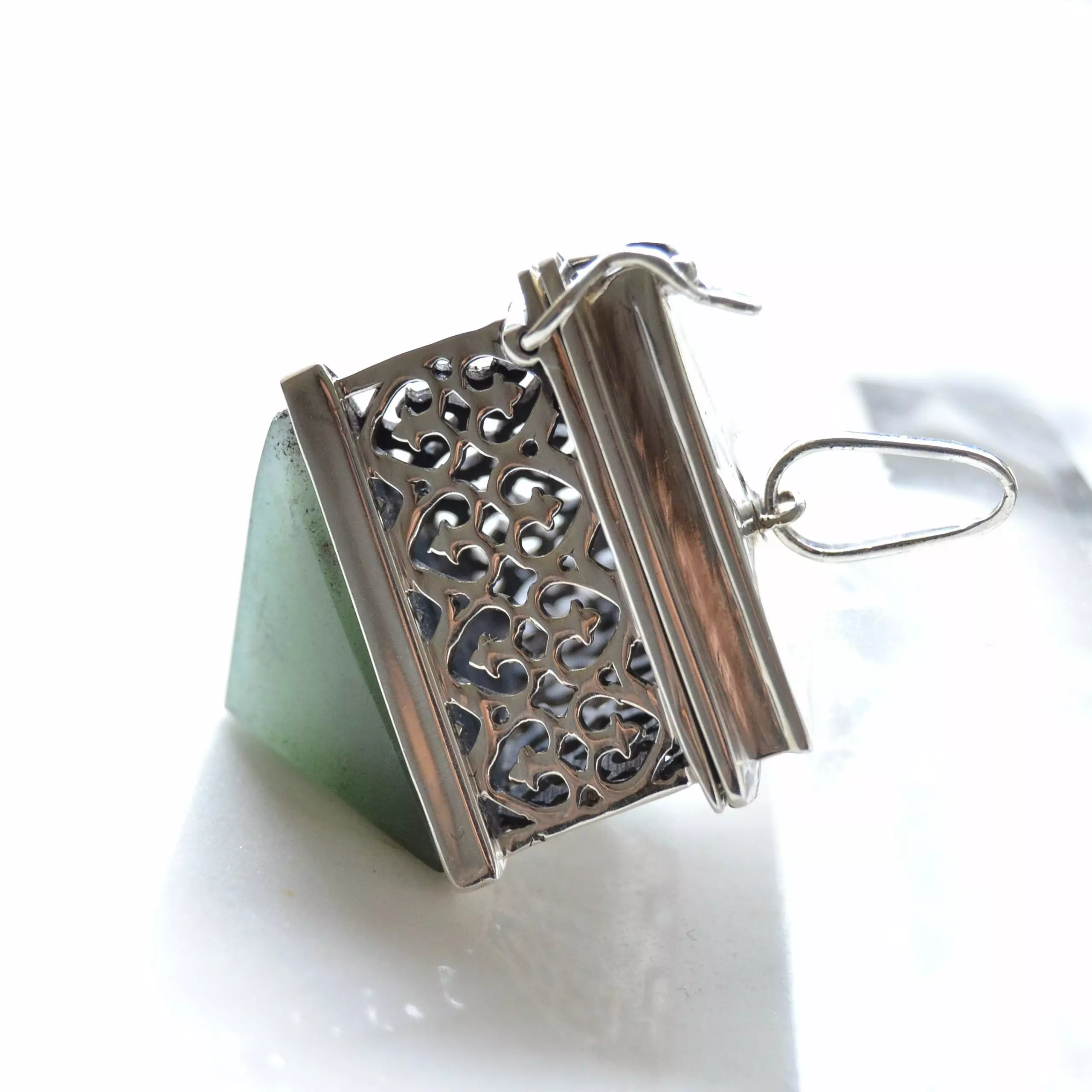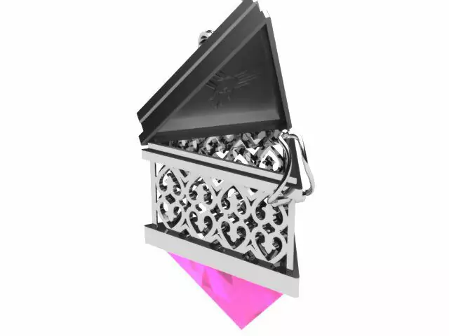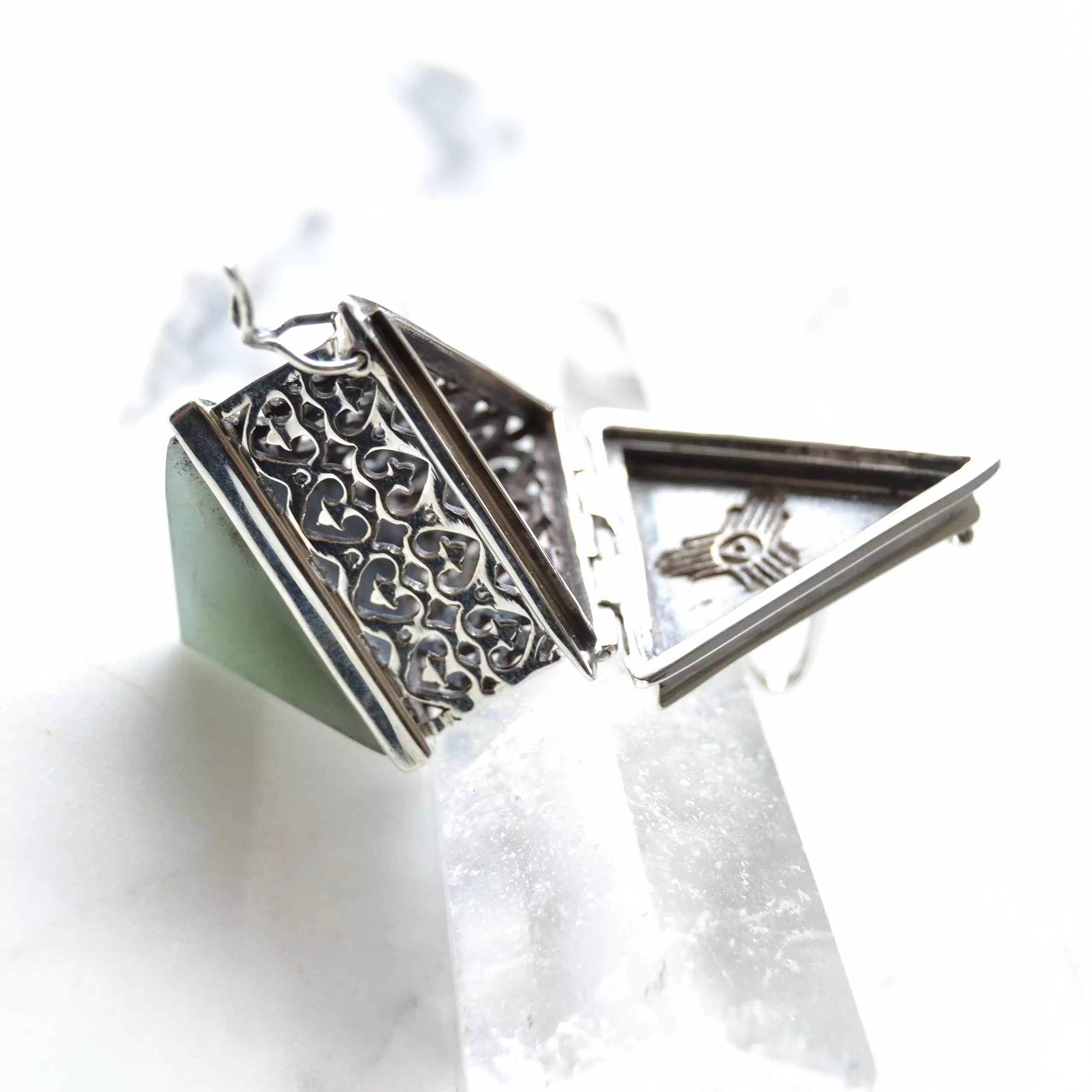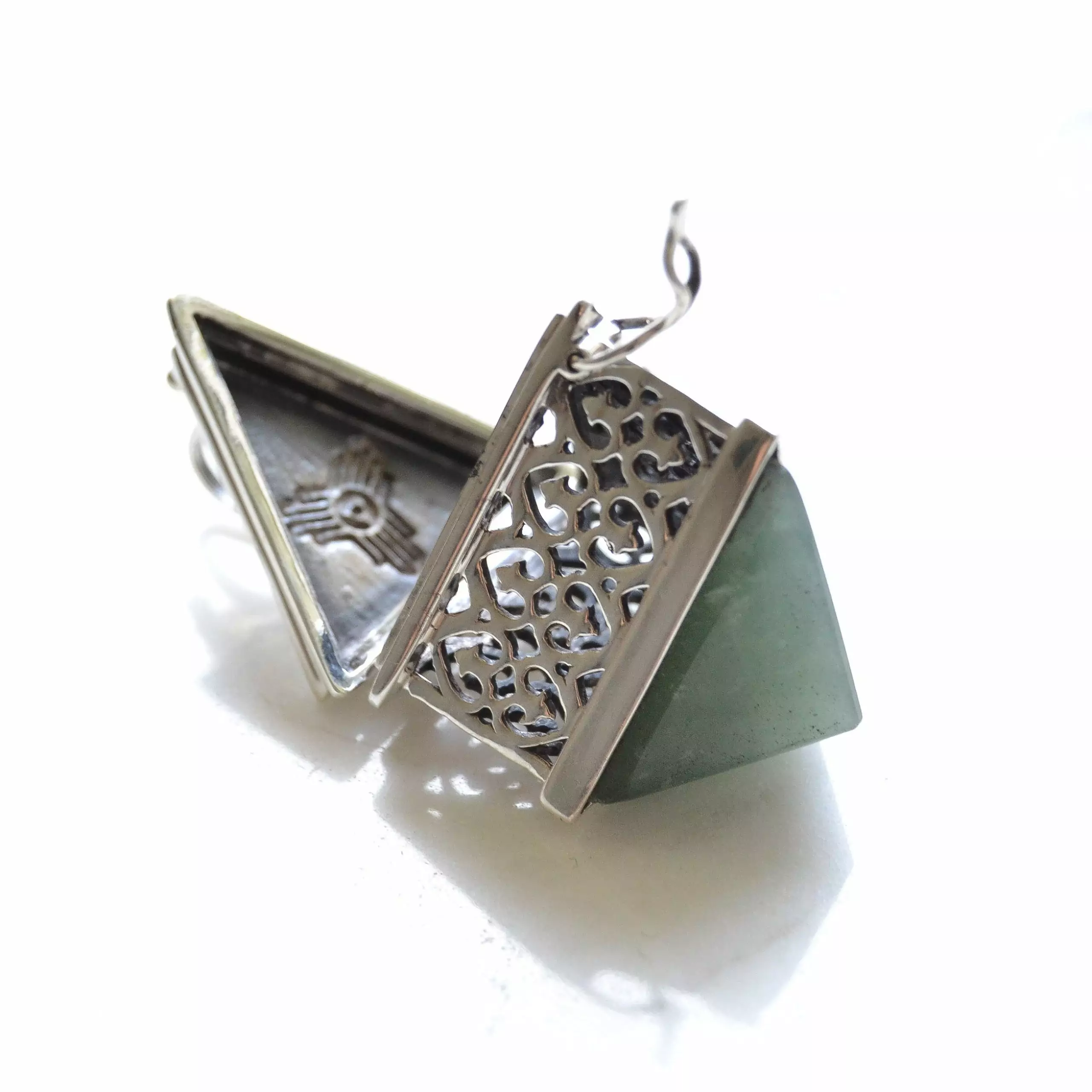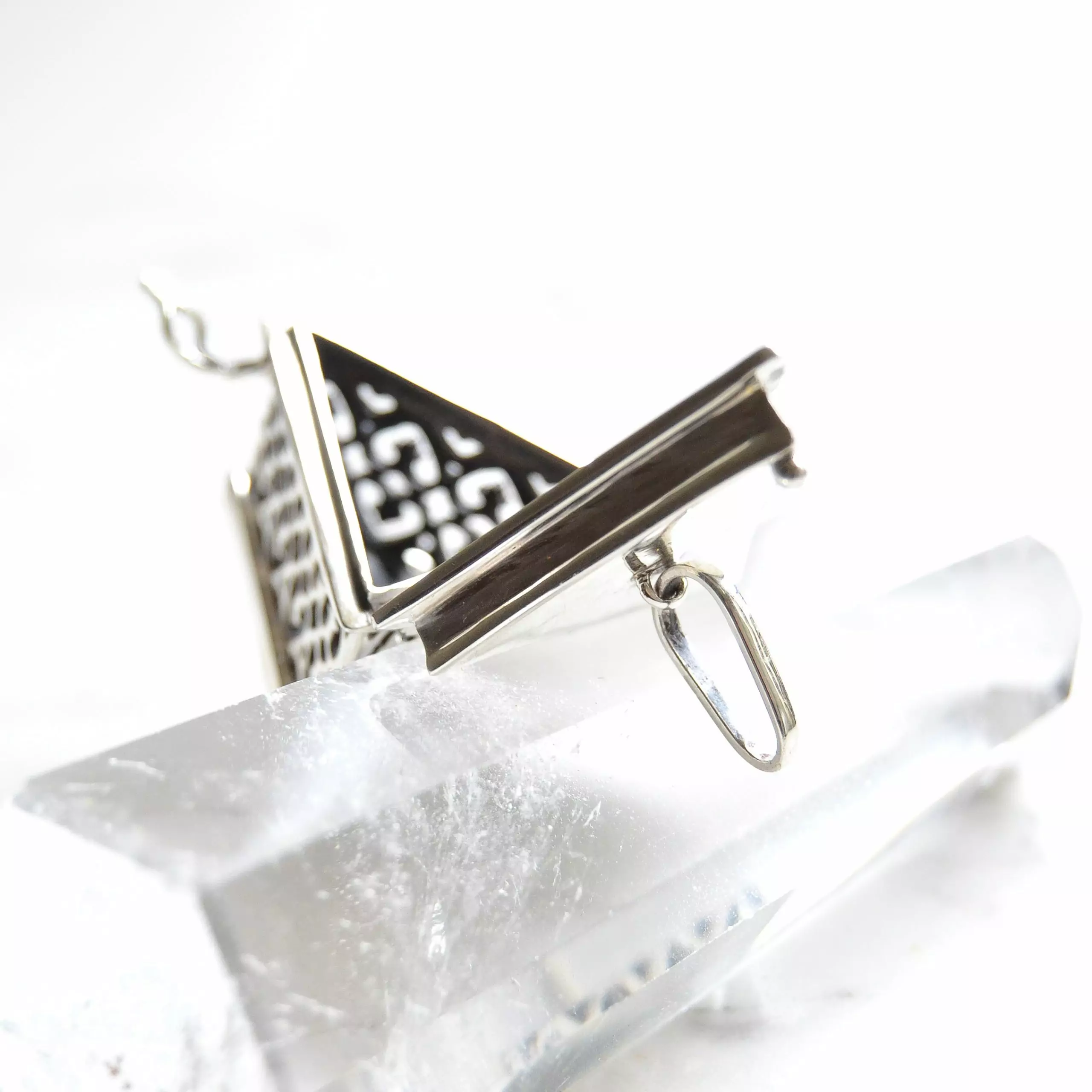 Pingente de prata 925, também conhecida como prata de lei, da linha Chakra AUTORAL, modelo difusor com a caixinha triangular com detalhes vazados e tampinha articulável.