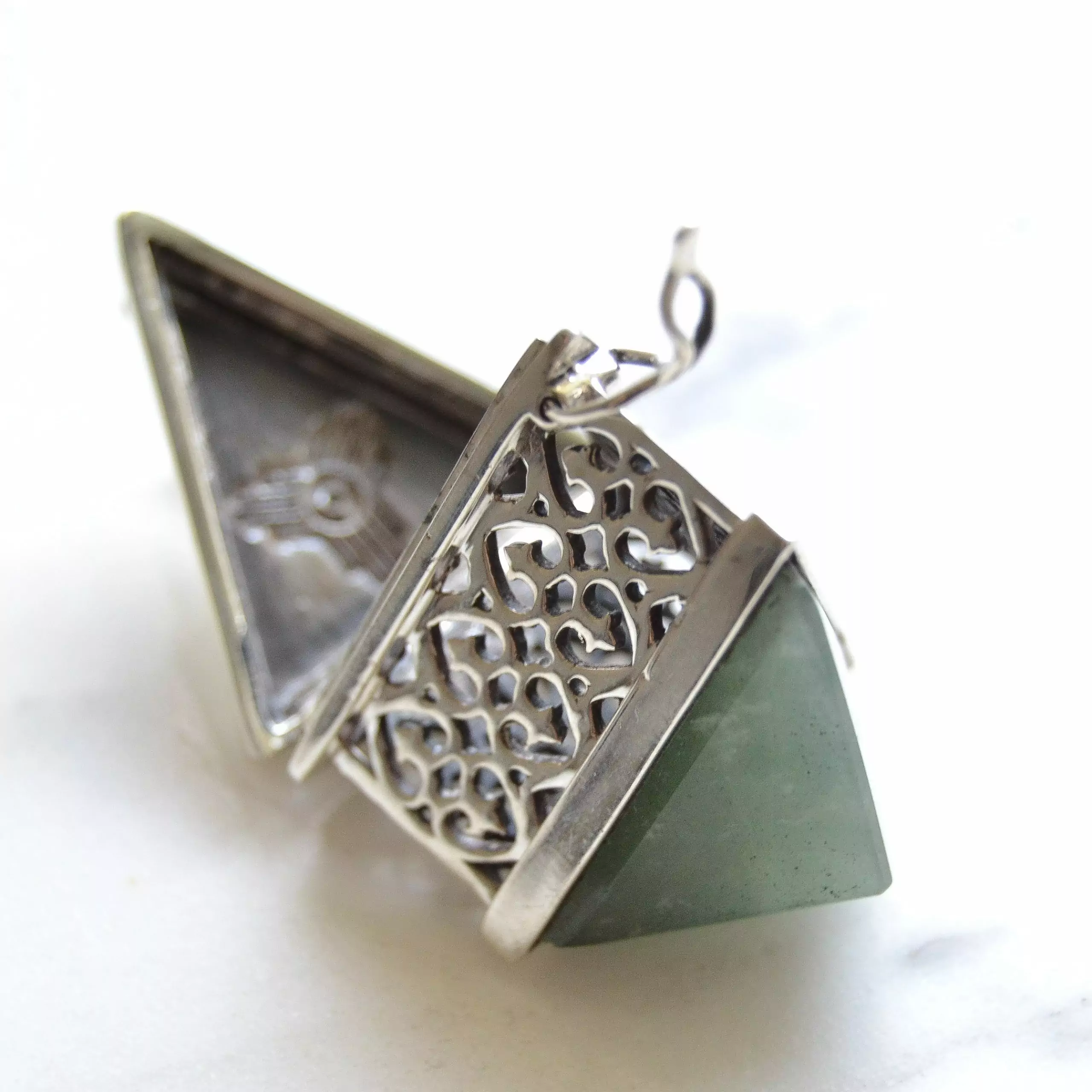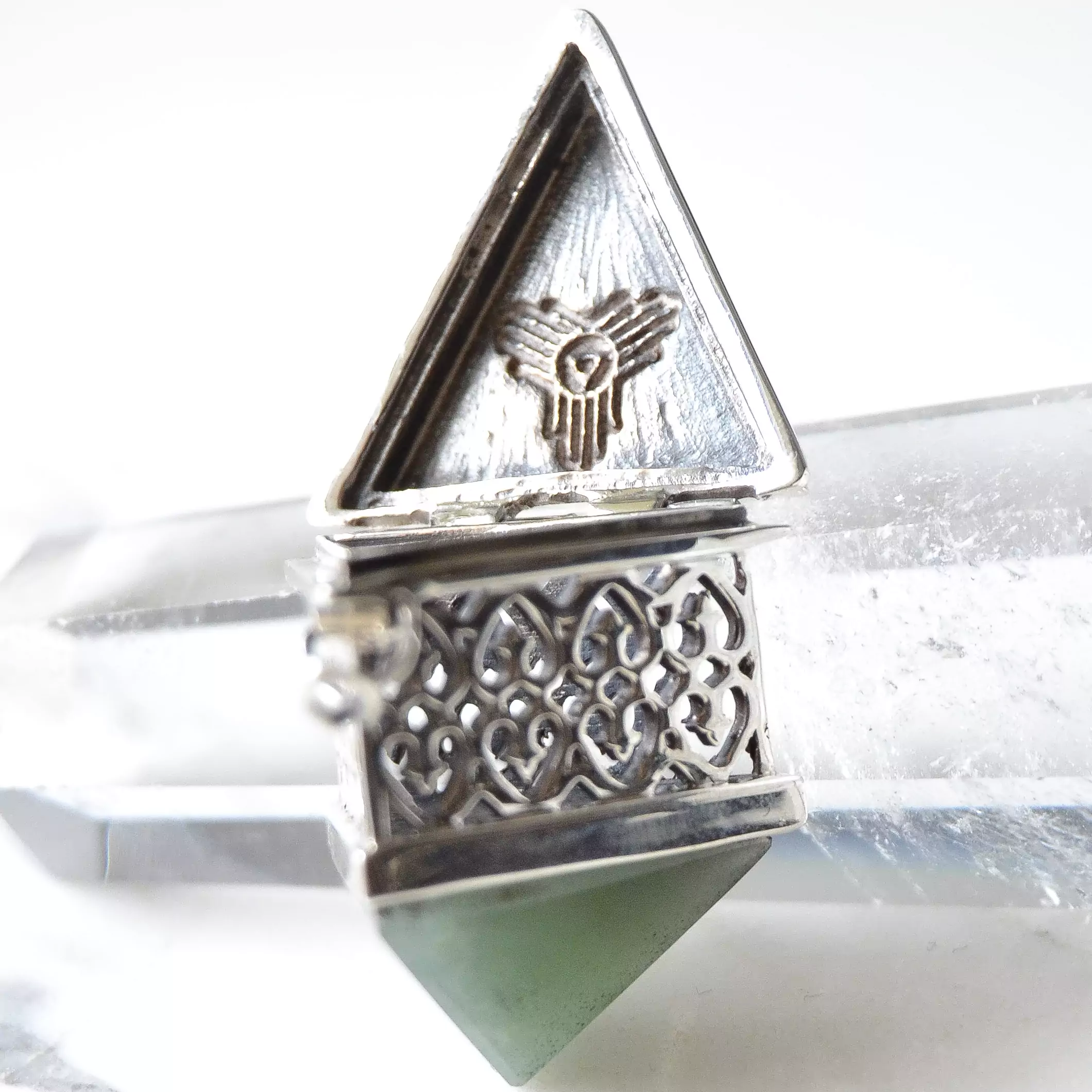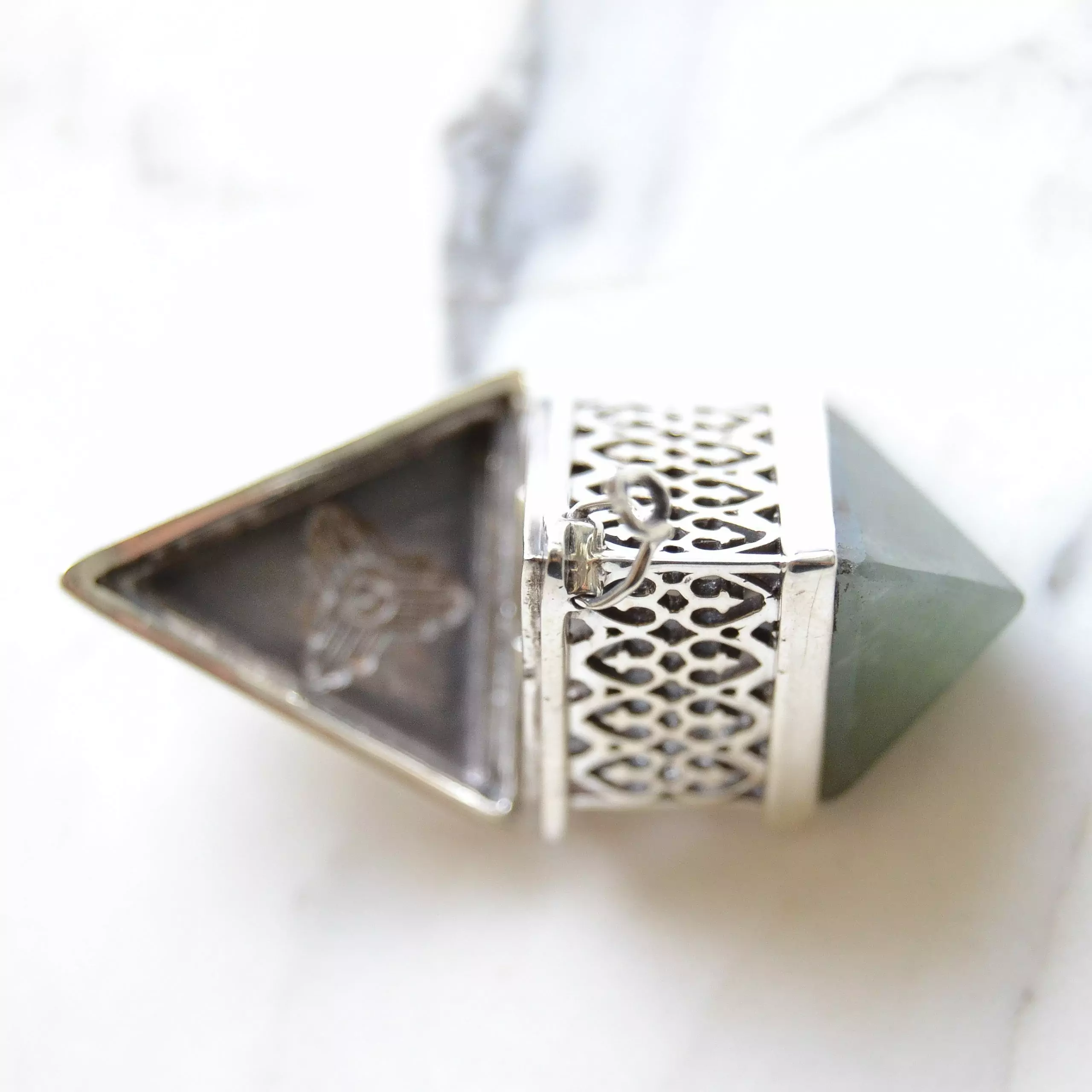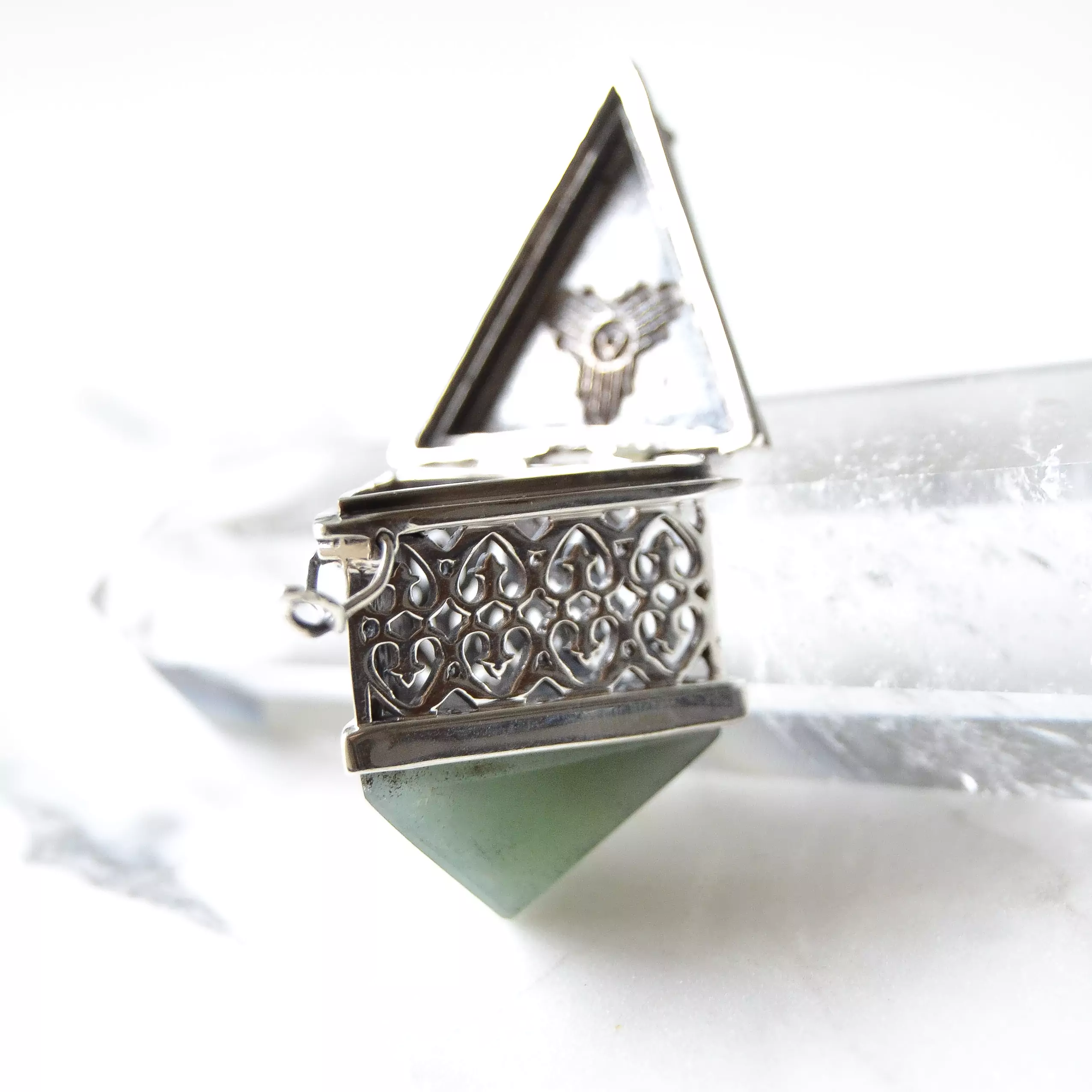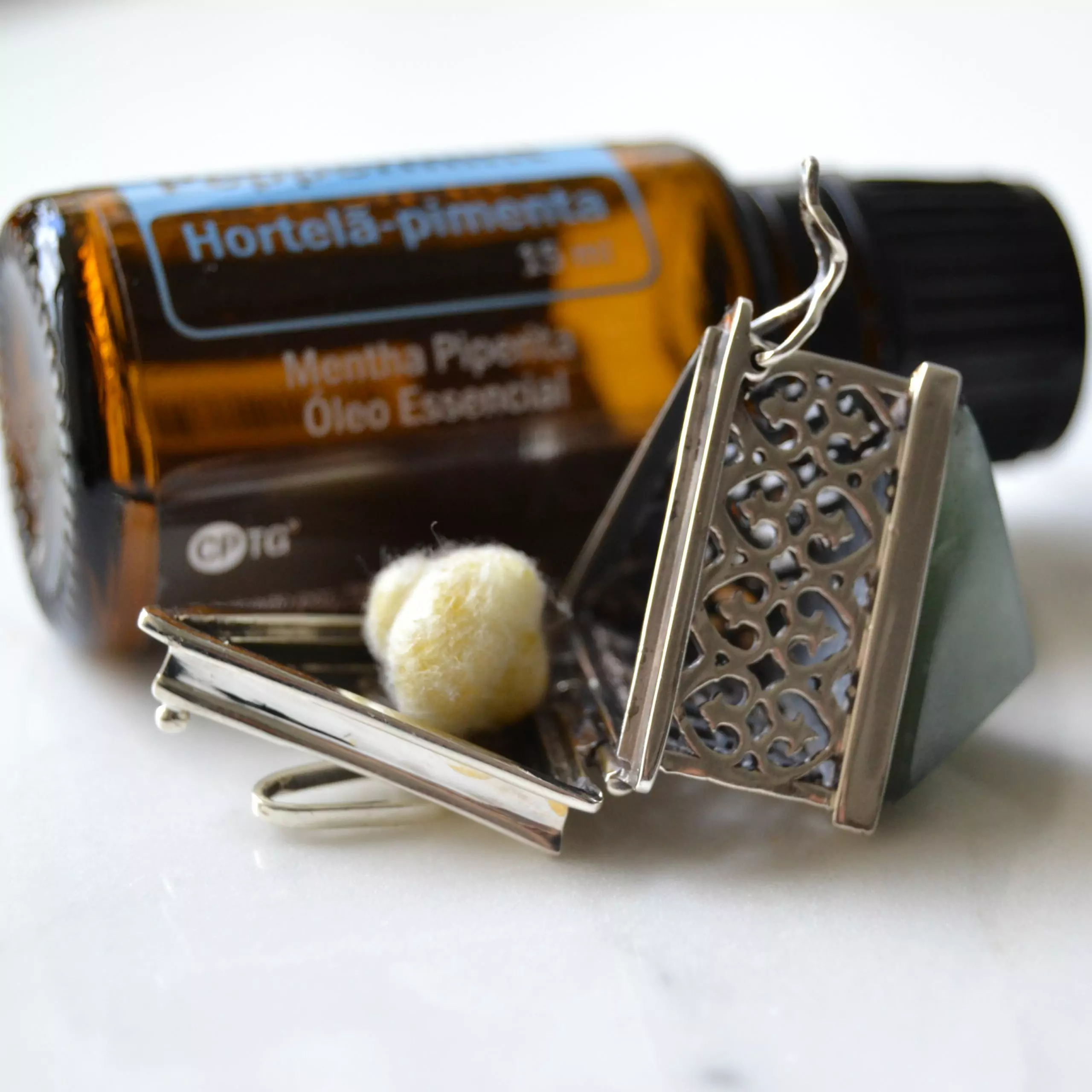 Pingente de prata 925, também conhecida como prata de lei, da linha Chakra AUTORAL, modelo difusor com a caixinha triangular com detalhes vazados e tampinha articulável.