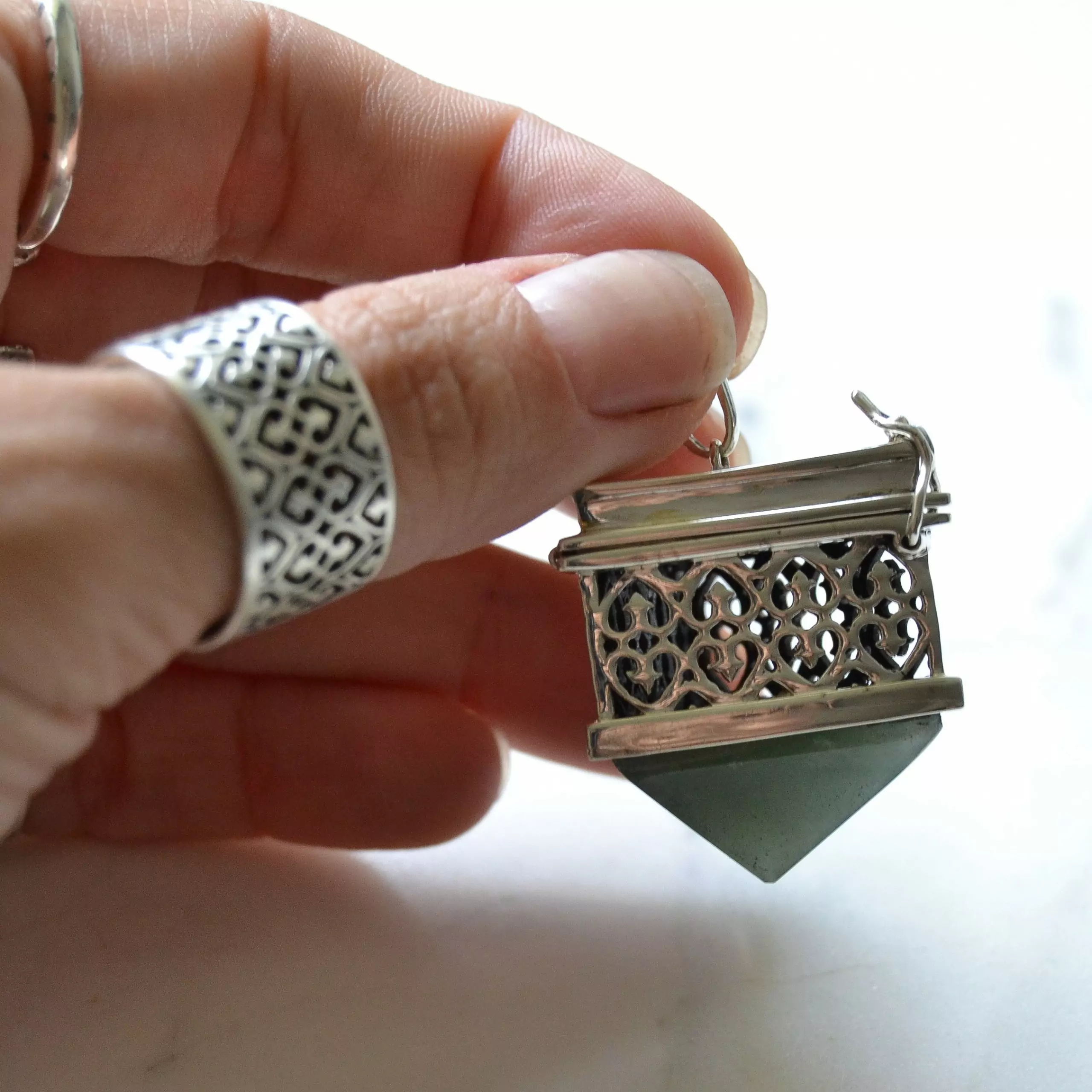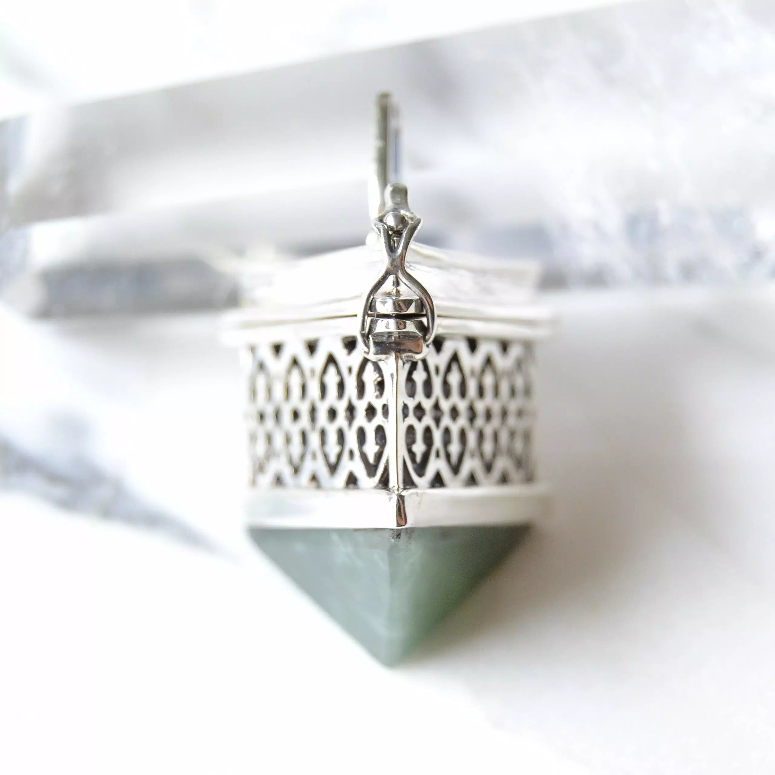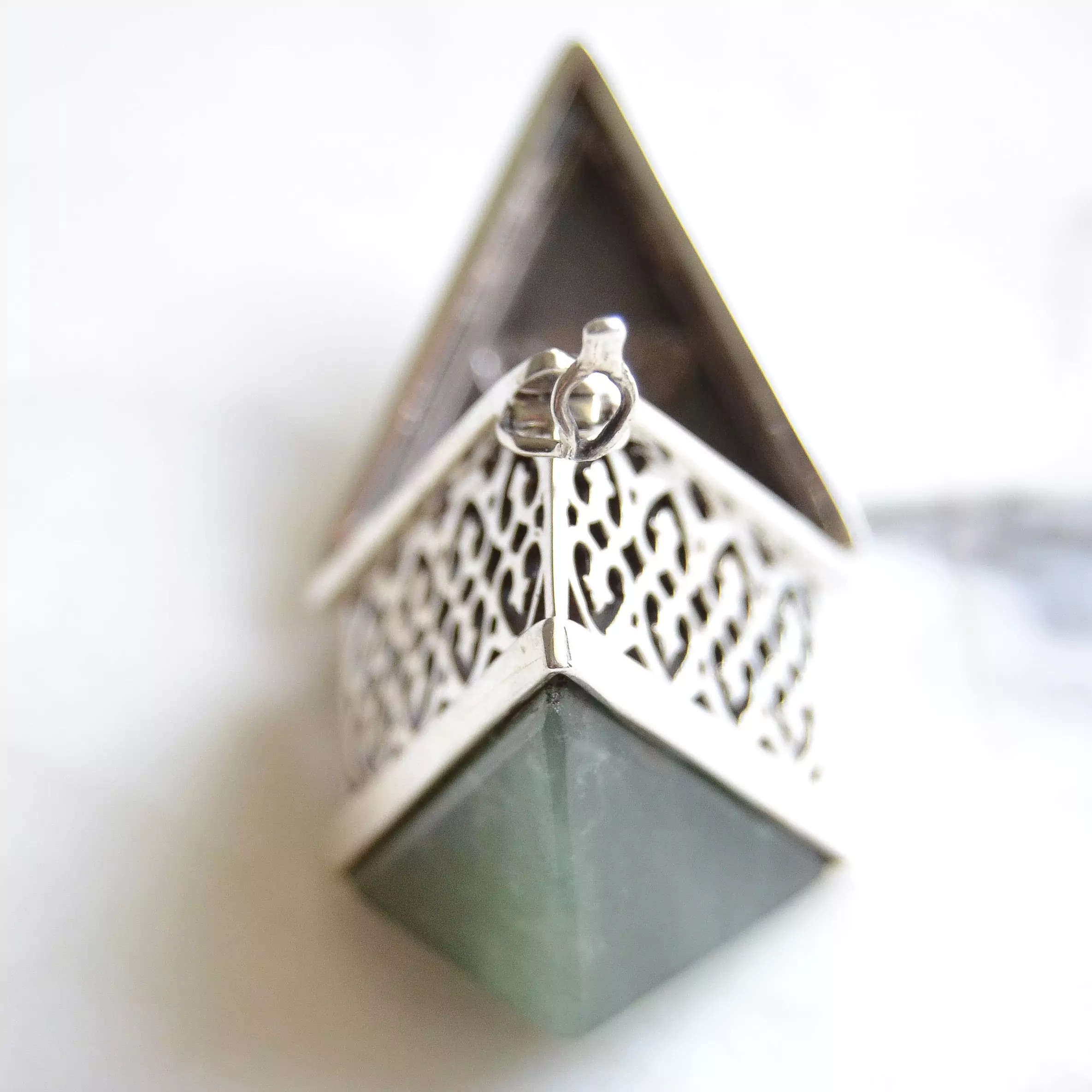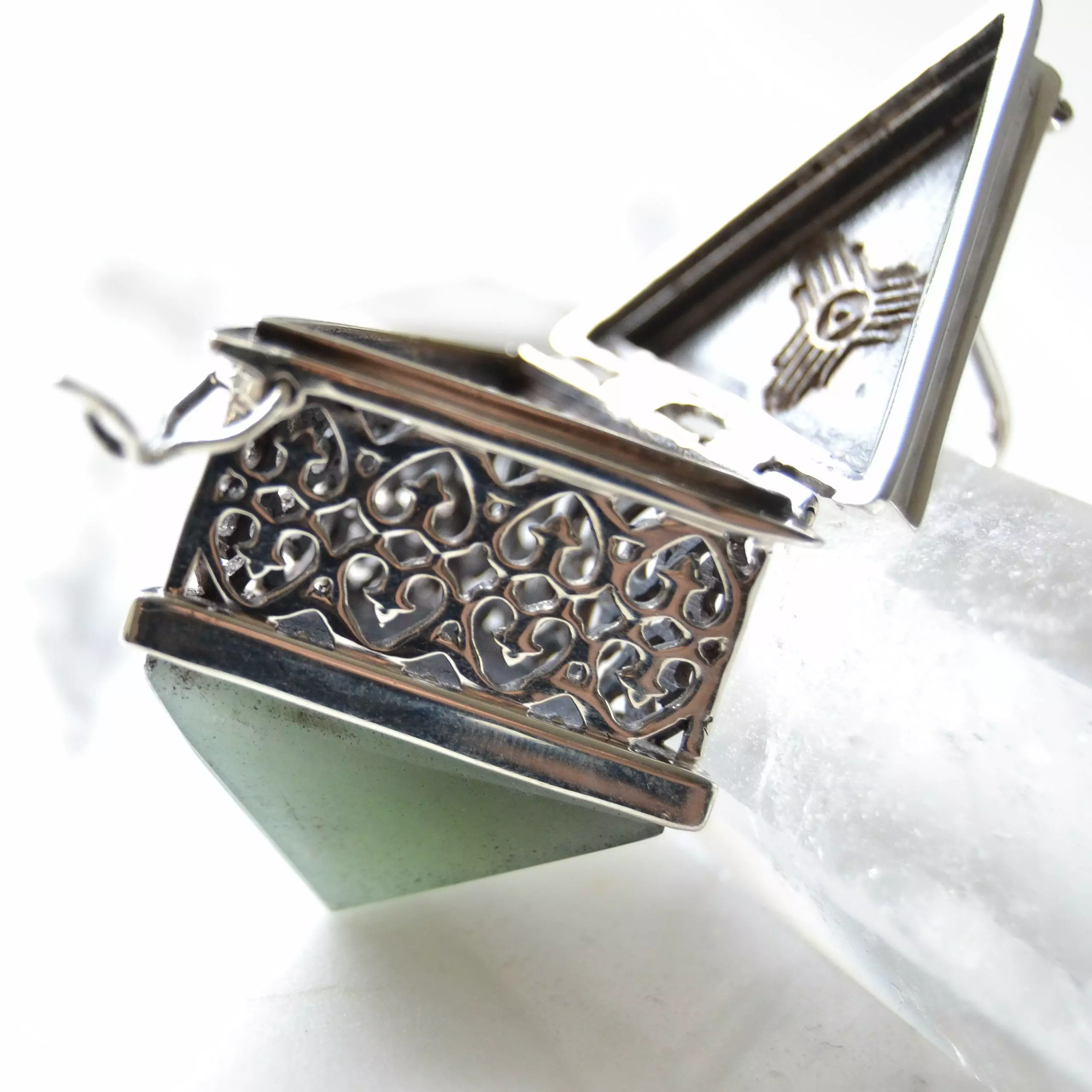 Pingente de prata 925, também conhecida como prata de lei, da linha Chakra AUTORAL, modelo difusor com a caixinha triangular com detalhes vazados e tampinha articulável.