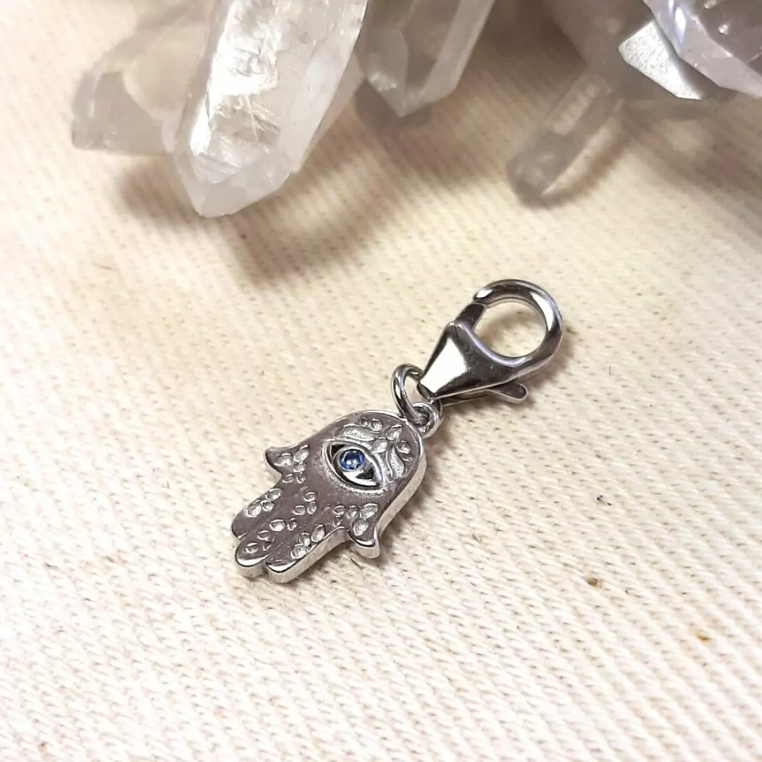 Pingente de prata 925, também conhecida como prata de lei, modelo com fecho, ideal para colocar em colar ou pulseira elo cartier, de um hamsá com banho de ródio