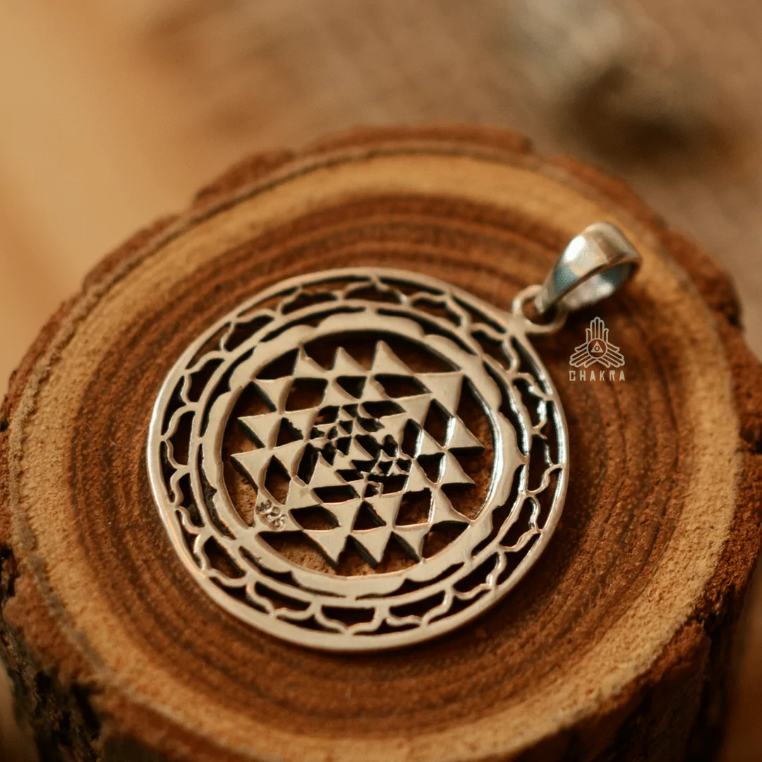 Pingente de prata 925, também conhecida como prata de lei, com detalhes vazados formando a imagem do Sri Yantra.