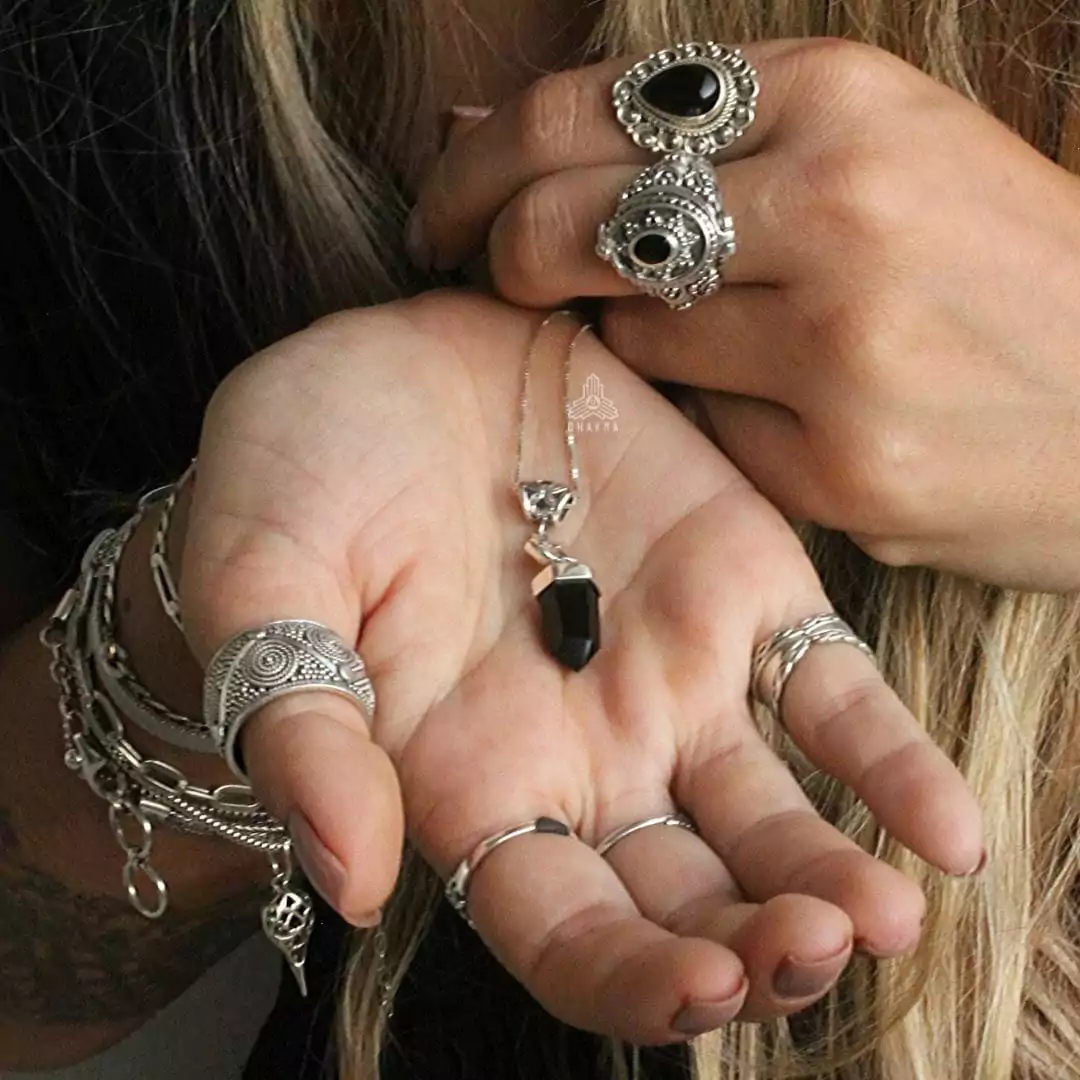 Pingente de prata 925, também conhecida como prata de lei, modelo da linha Chakra AUTORAL com uma obsidiana negra natural , detalhe articulado e pingente de flor de lotus