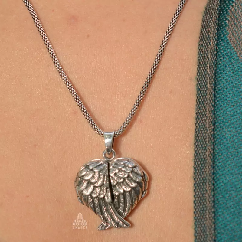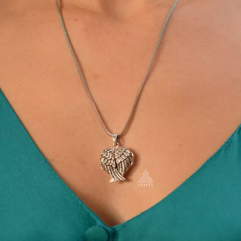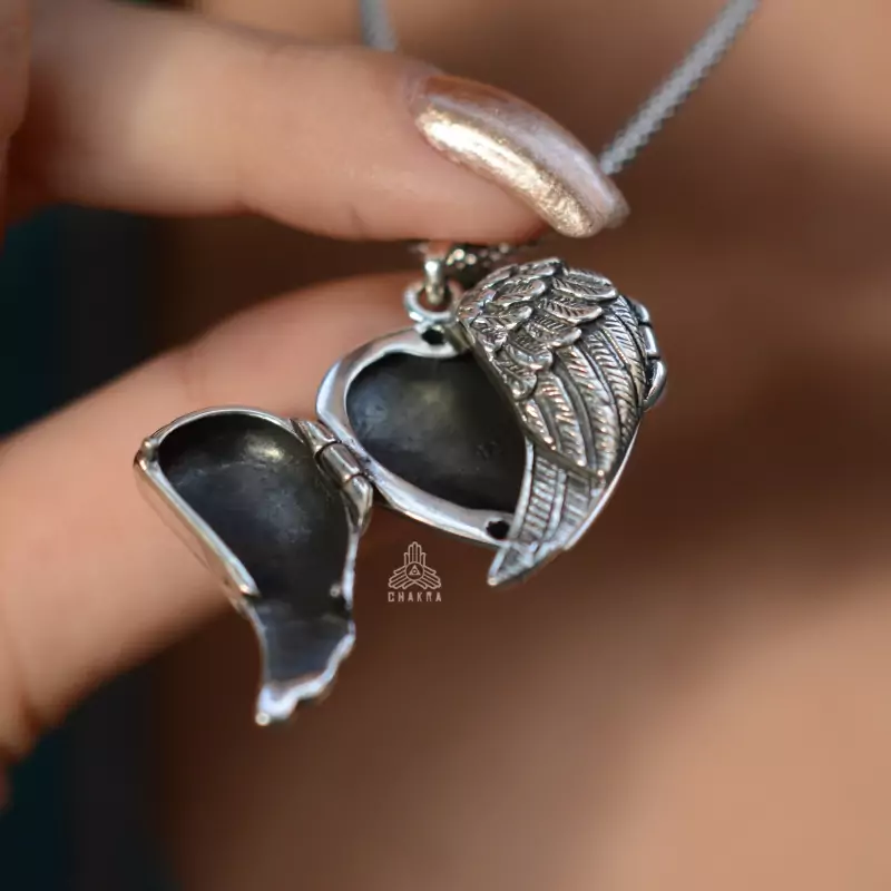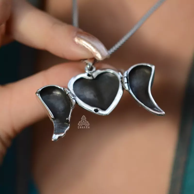 Pingente de prata 925, também conhecido como prata de lei, modelo relicário que abre em formato de coração com duas asas