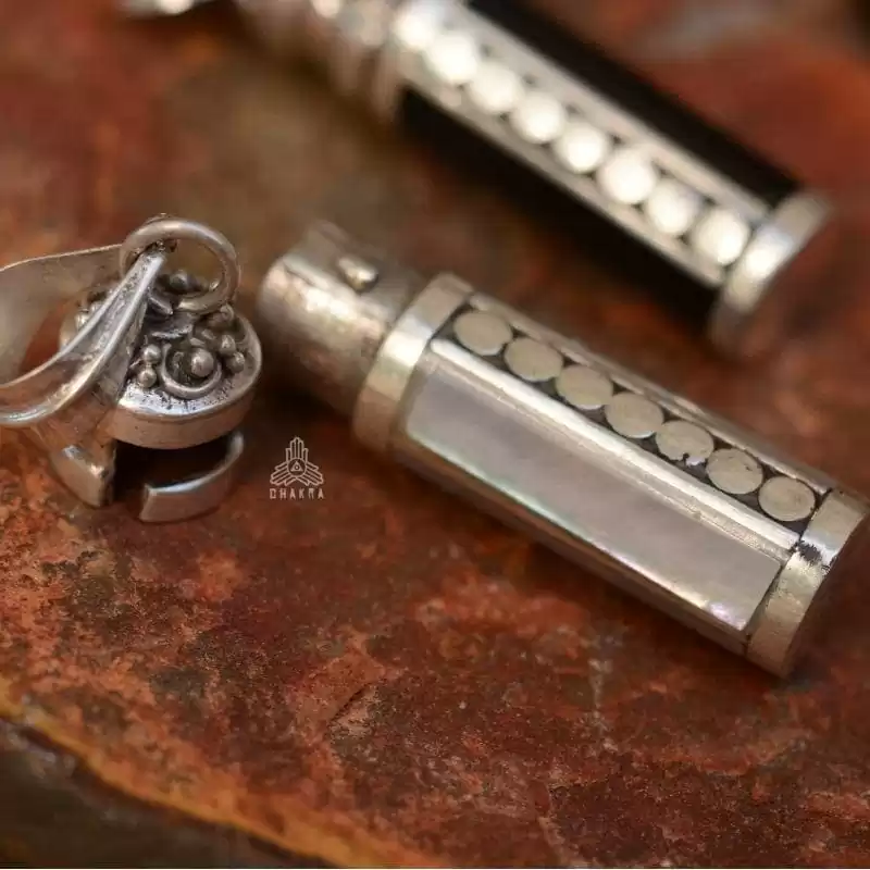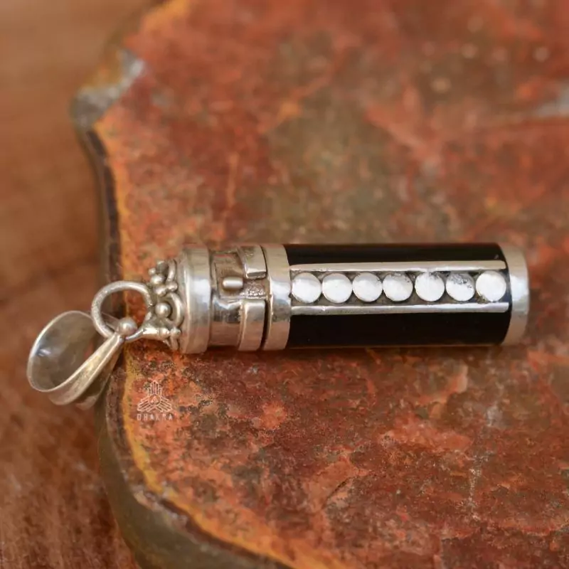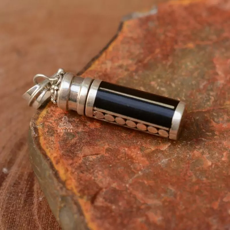 Pingente de prata 925, também conhecida como prata de lei, modelo relicário que abre a tampinha com detalhes em ônix natural