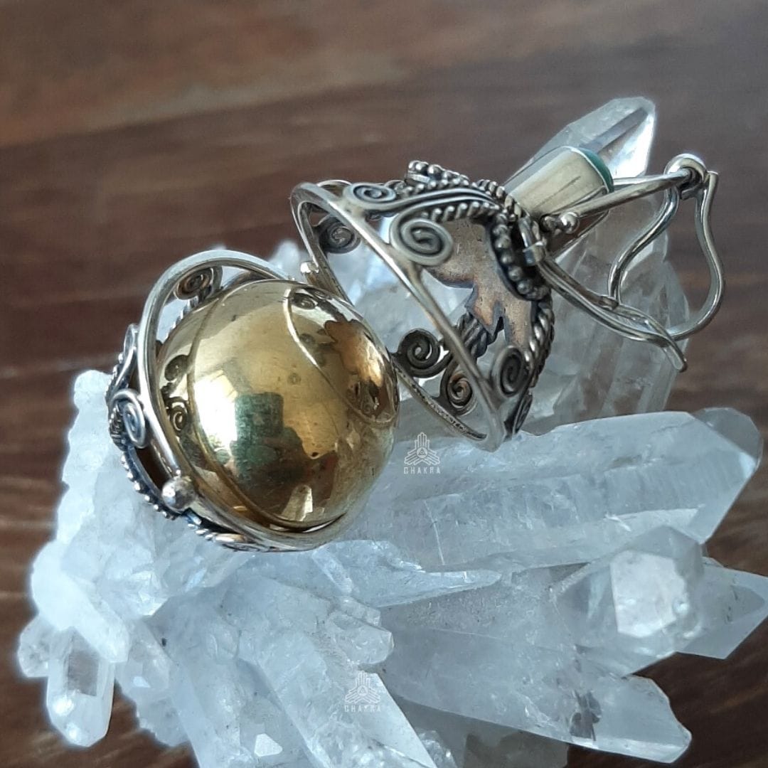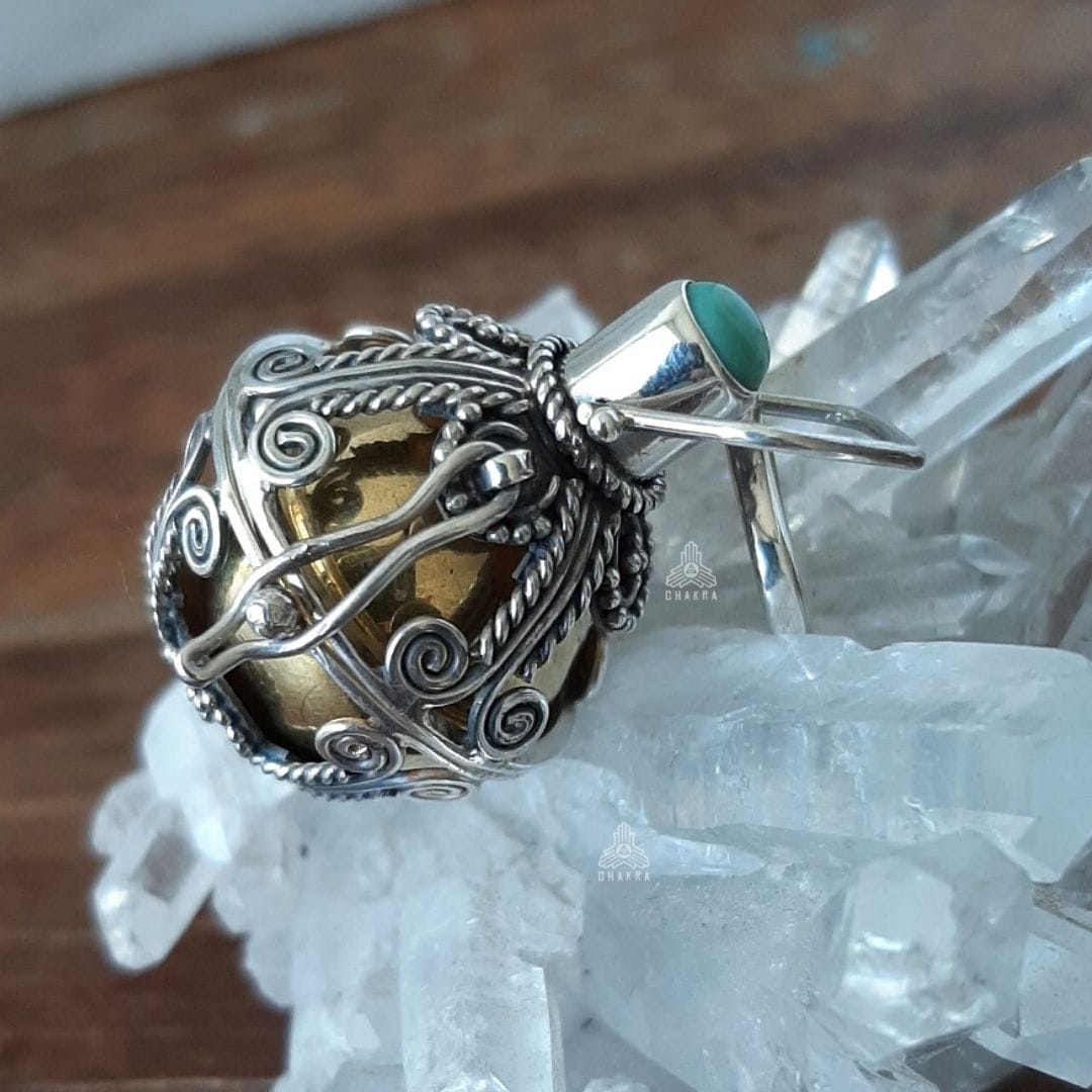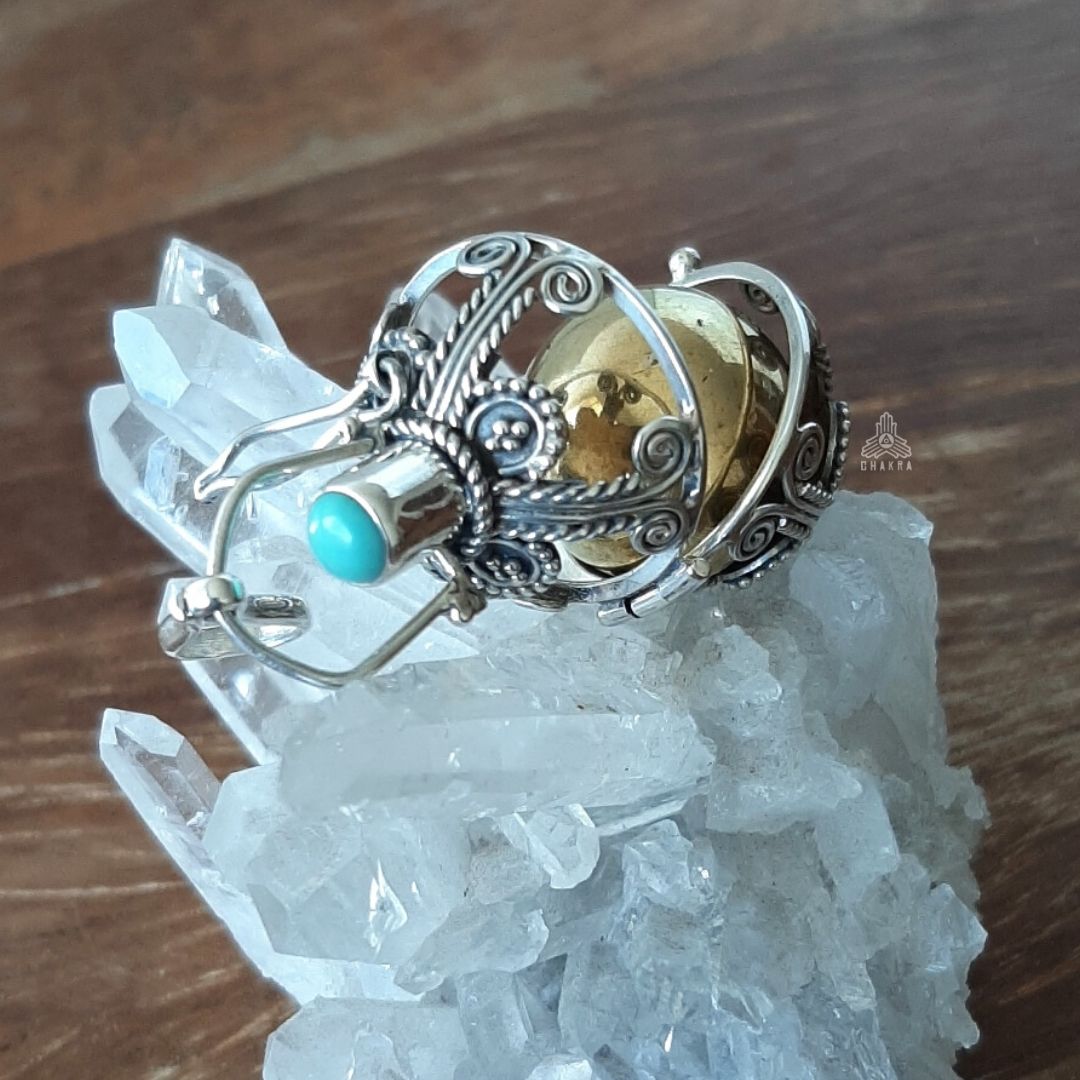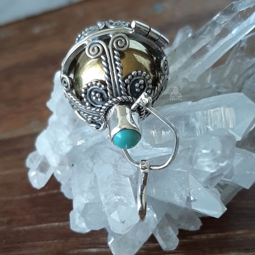 pingente de prata 925, também conhecida como prata de lei, modelo sino dos sonhos com um com um guizo sonoro e detalhe articulável e uma turquesa terminal
