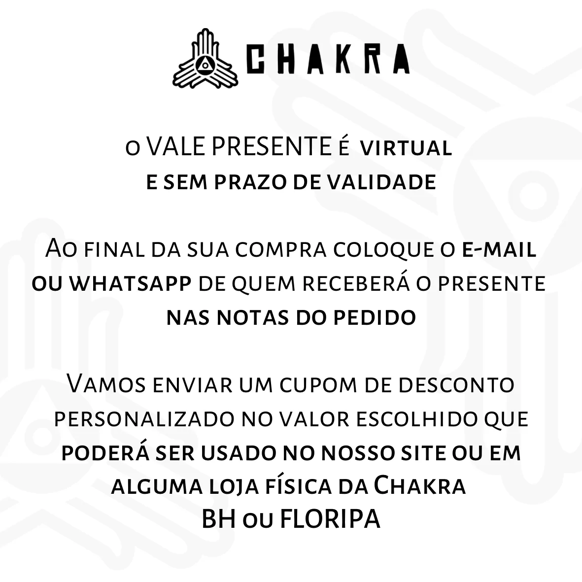Vamos enviar um cupom de desconto personalizado no valor escolhido que poderá ser usado no nosso site ou em alguma loja física da Chakra BH ou FLORIPA